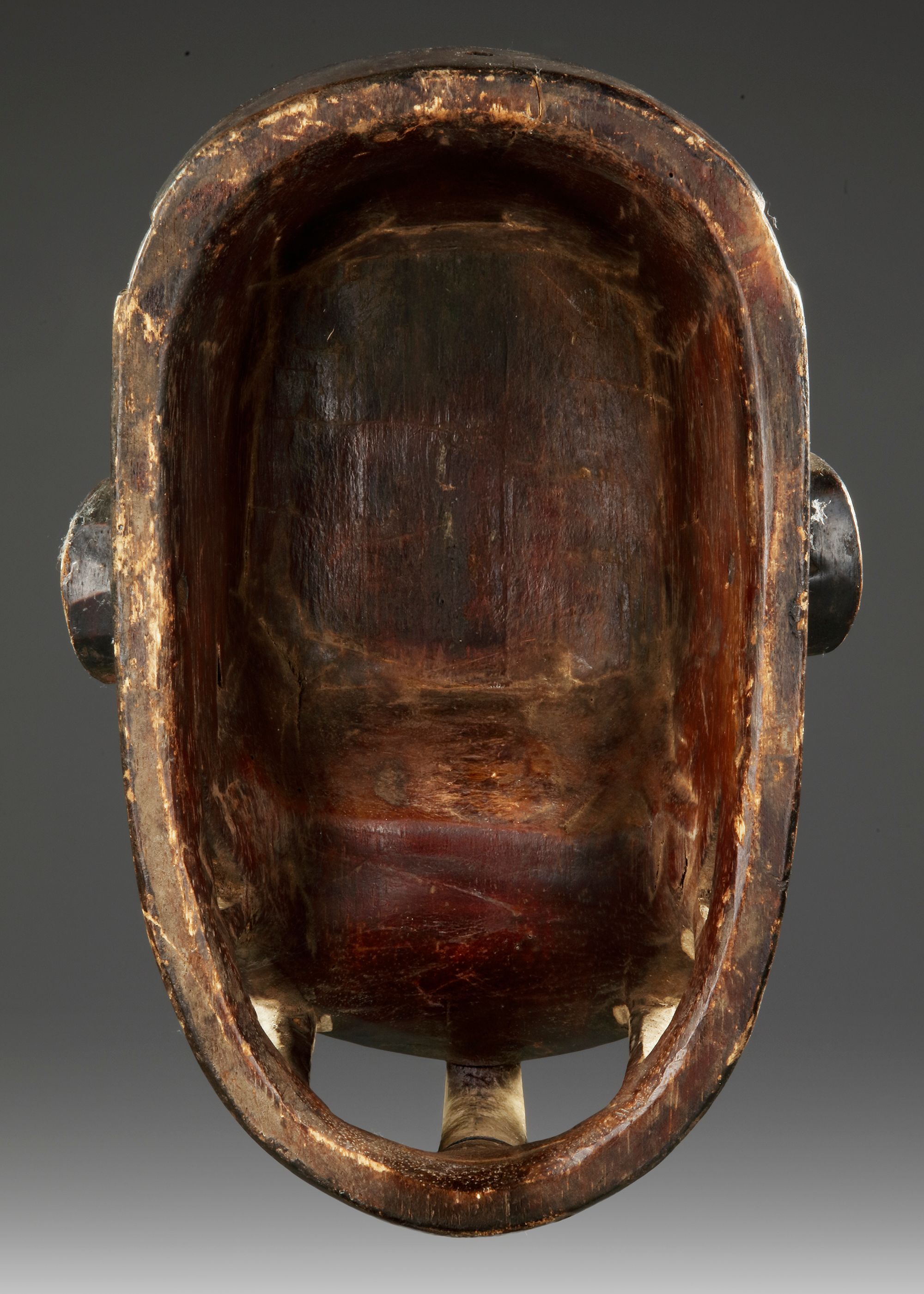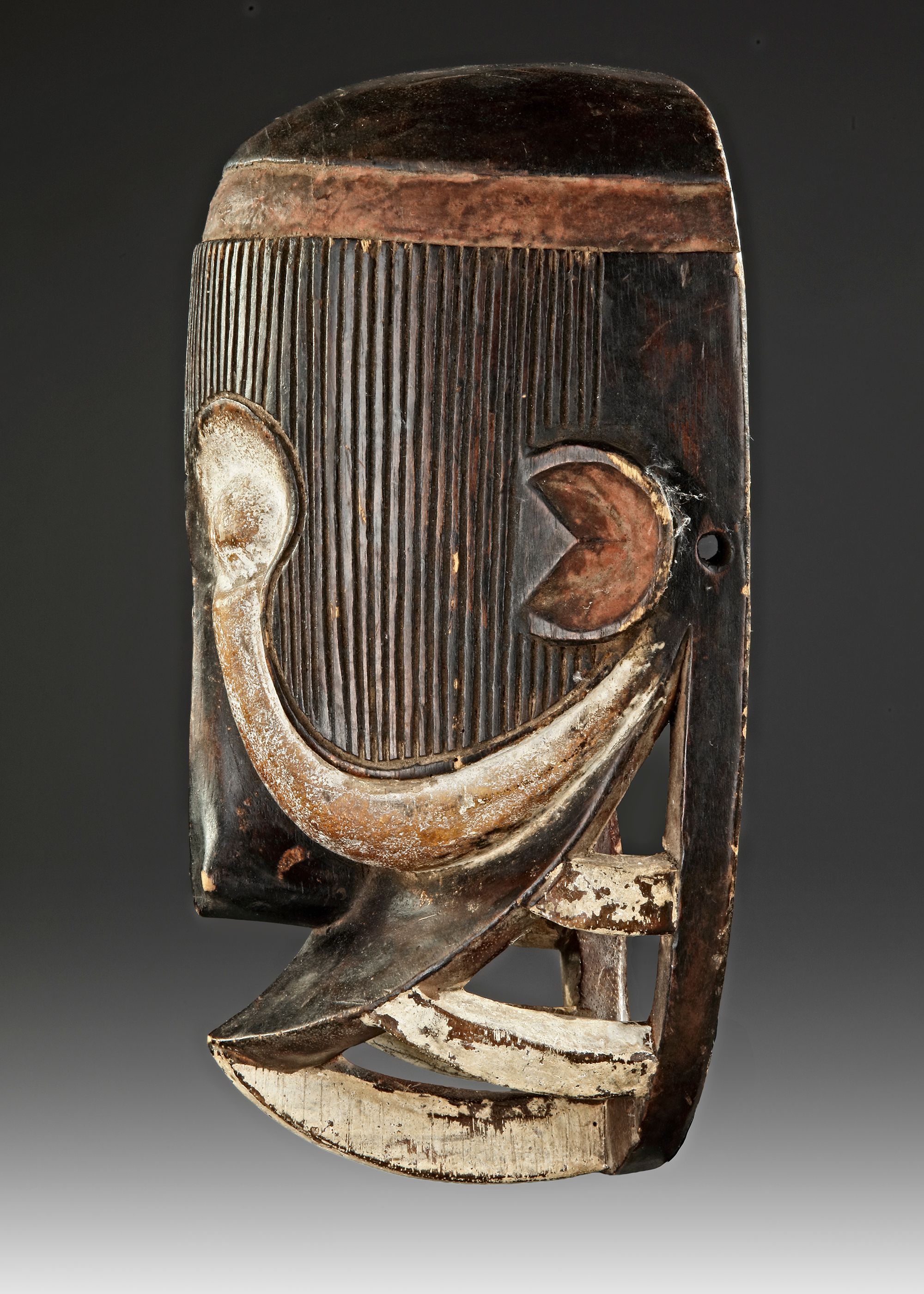 A powerful African mask carved from wood, featuring bold sculptural forms, ribbed textures, prominent facial features, and an openwork lower section.