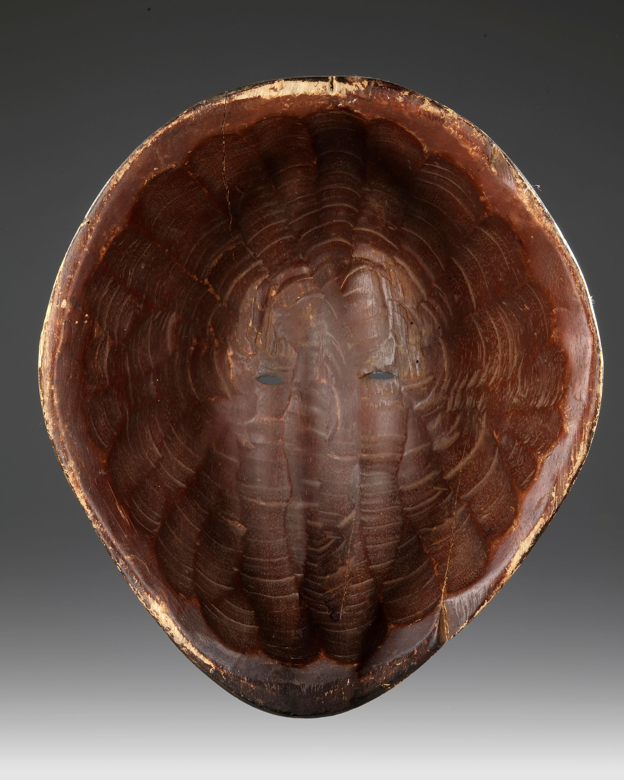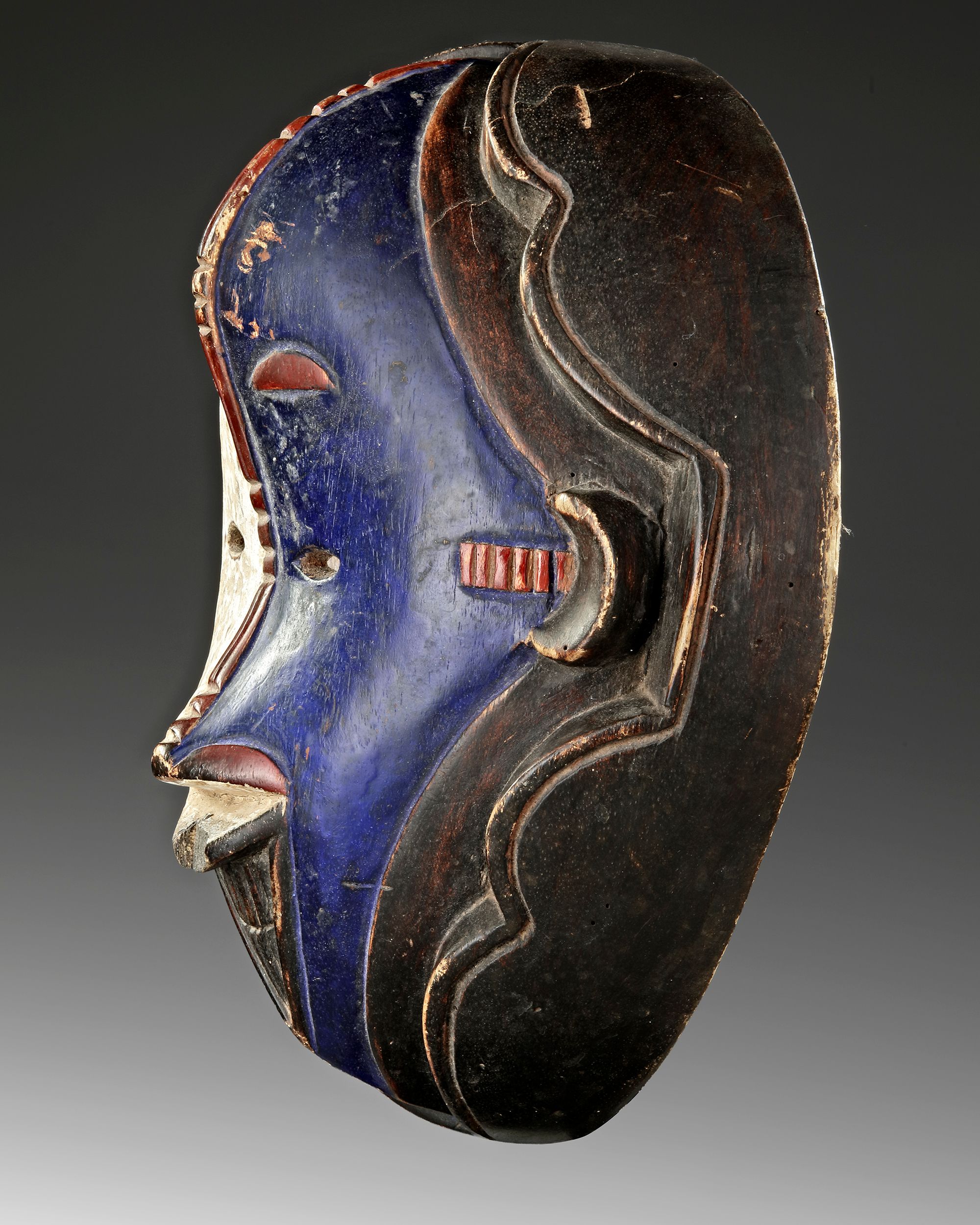 A striking African mask carved from wood and painted in bold contrasting colors, with a symmetrical blue-and-white design accented in red and featuring a projecting mouth and geometric forms.