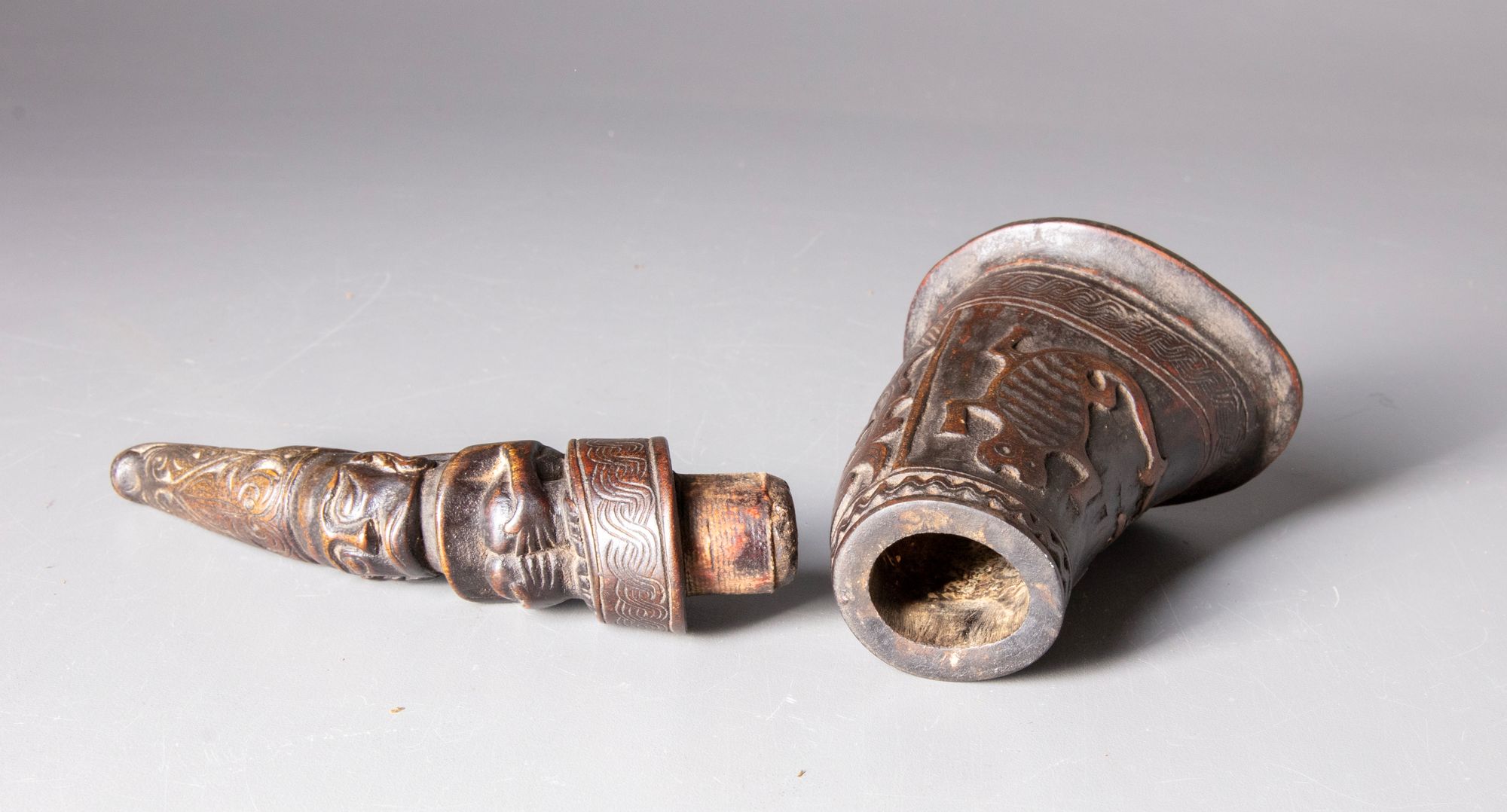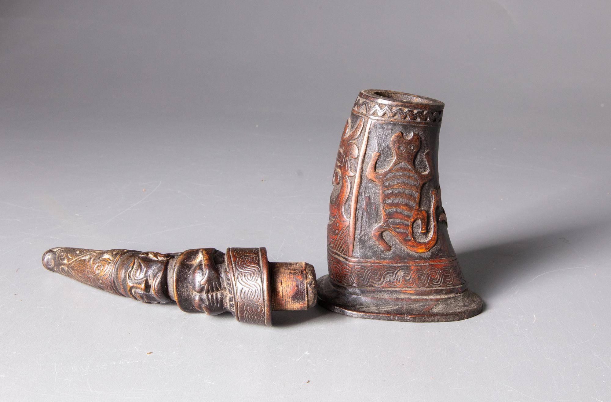 Delicately carved gunpowder container from a buffalo horn, finished with a mythical figure on top. The stopper fits snugly, the horn end having been wound with cotton impregnated with resin. There are traces of residue inside. Old Dutch collection.