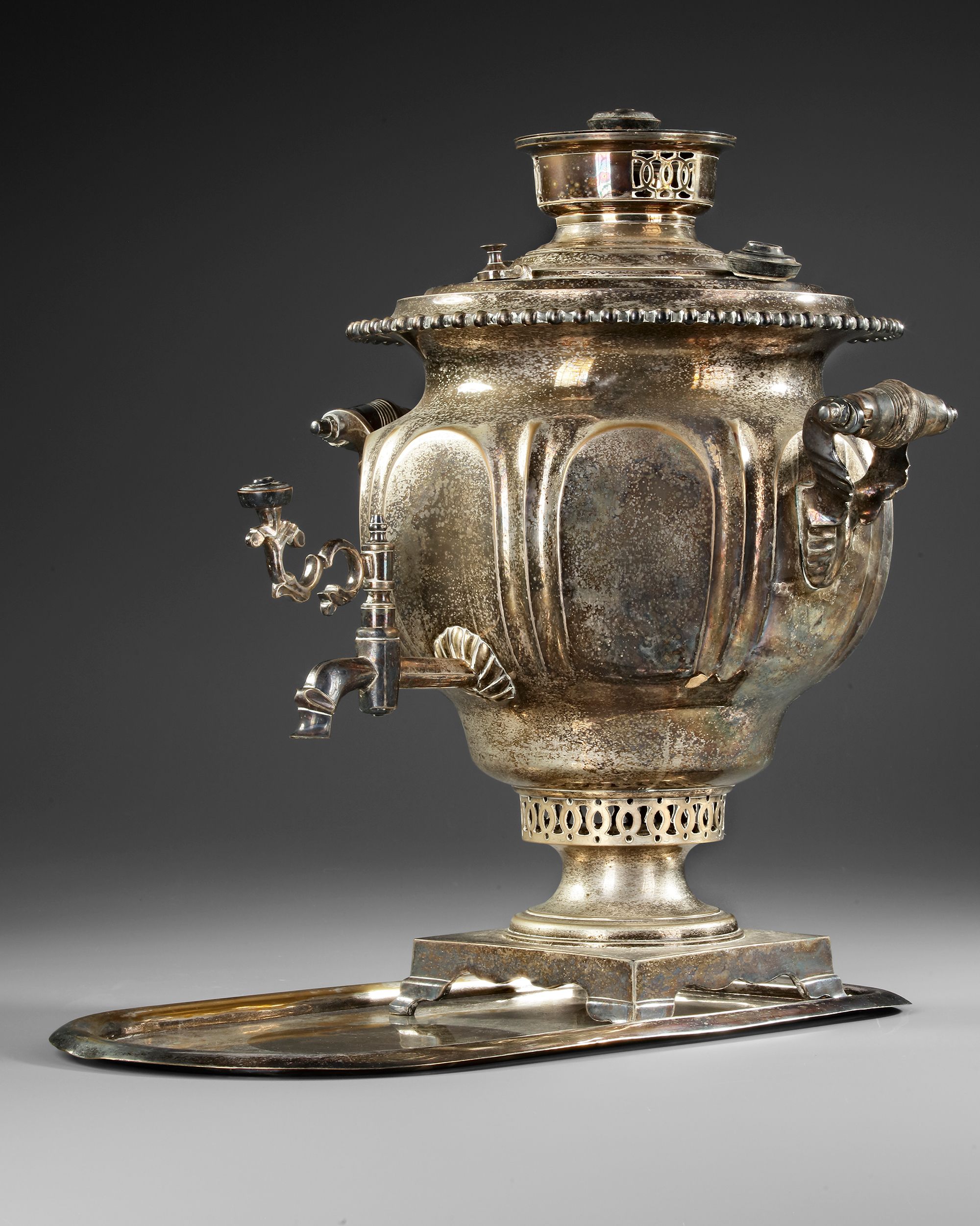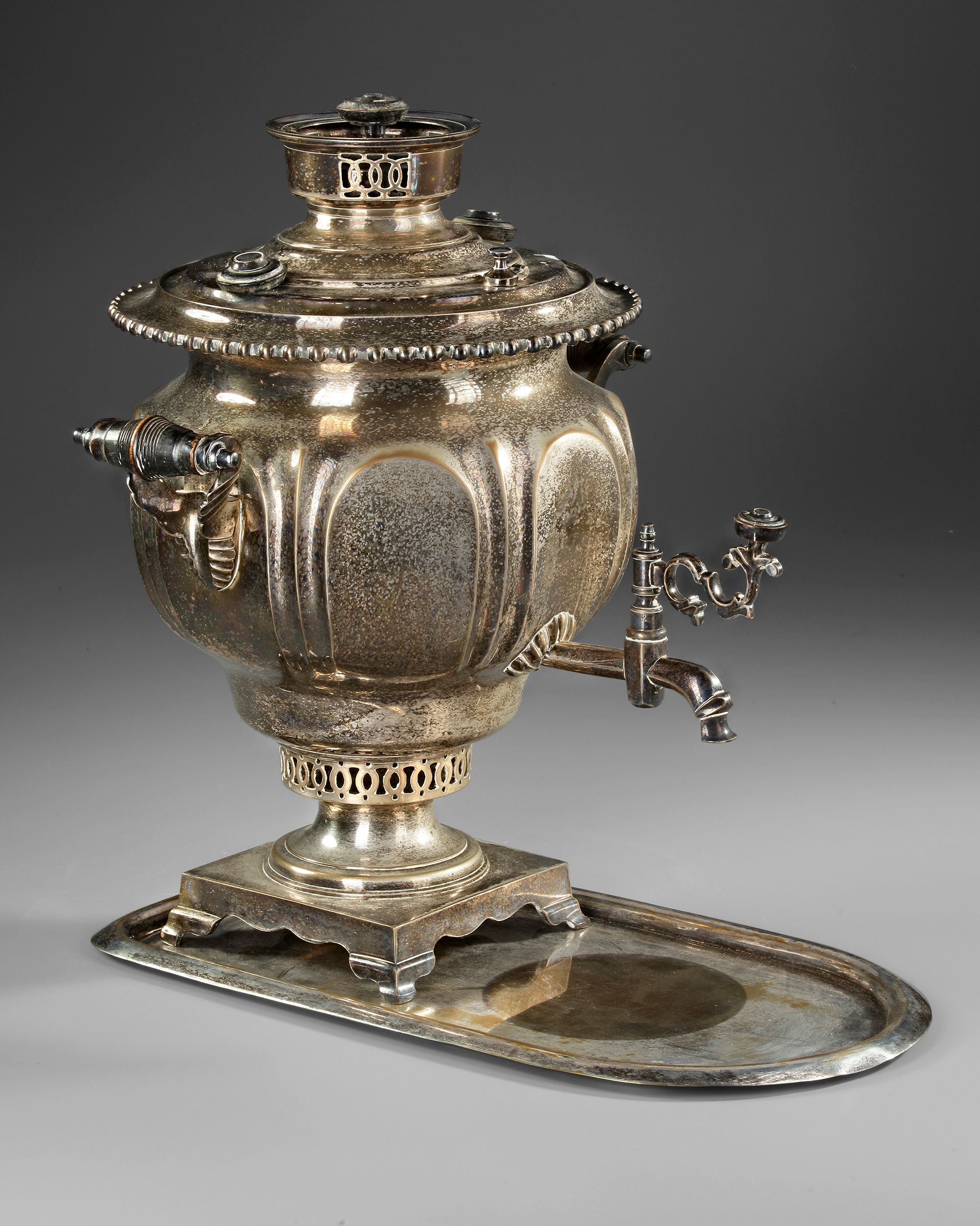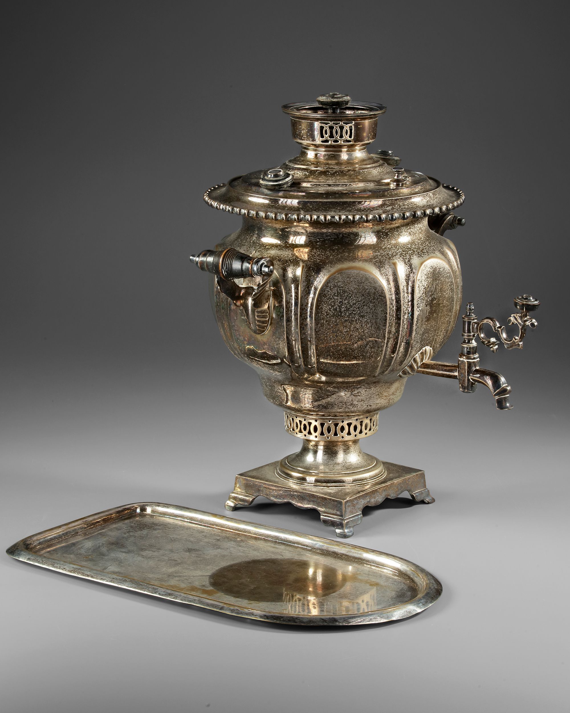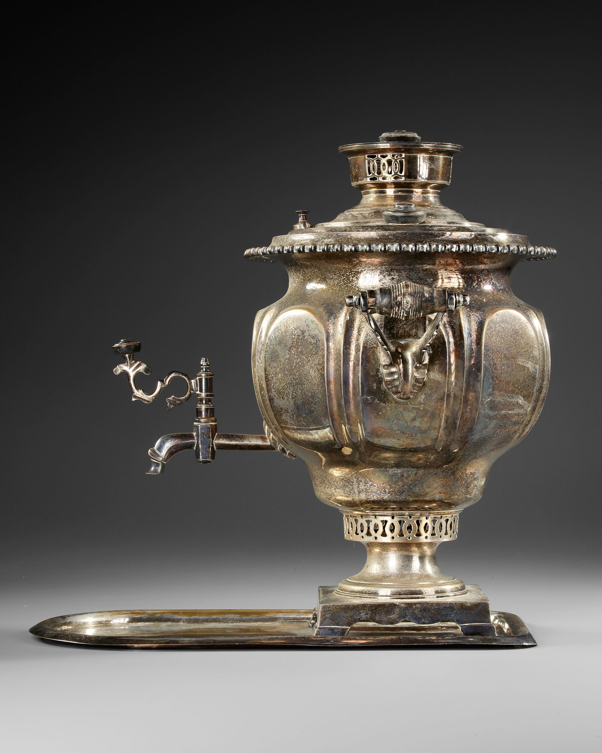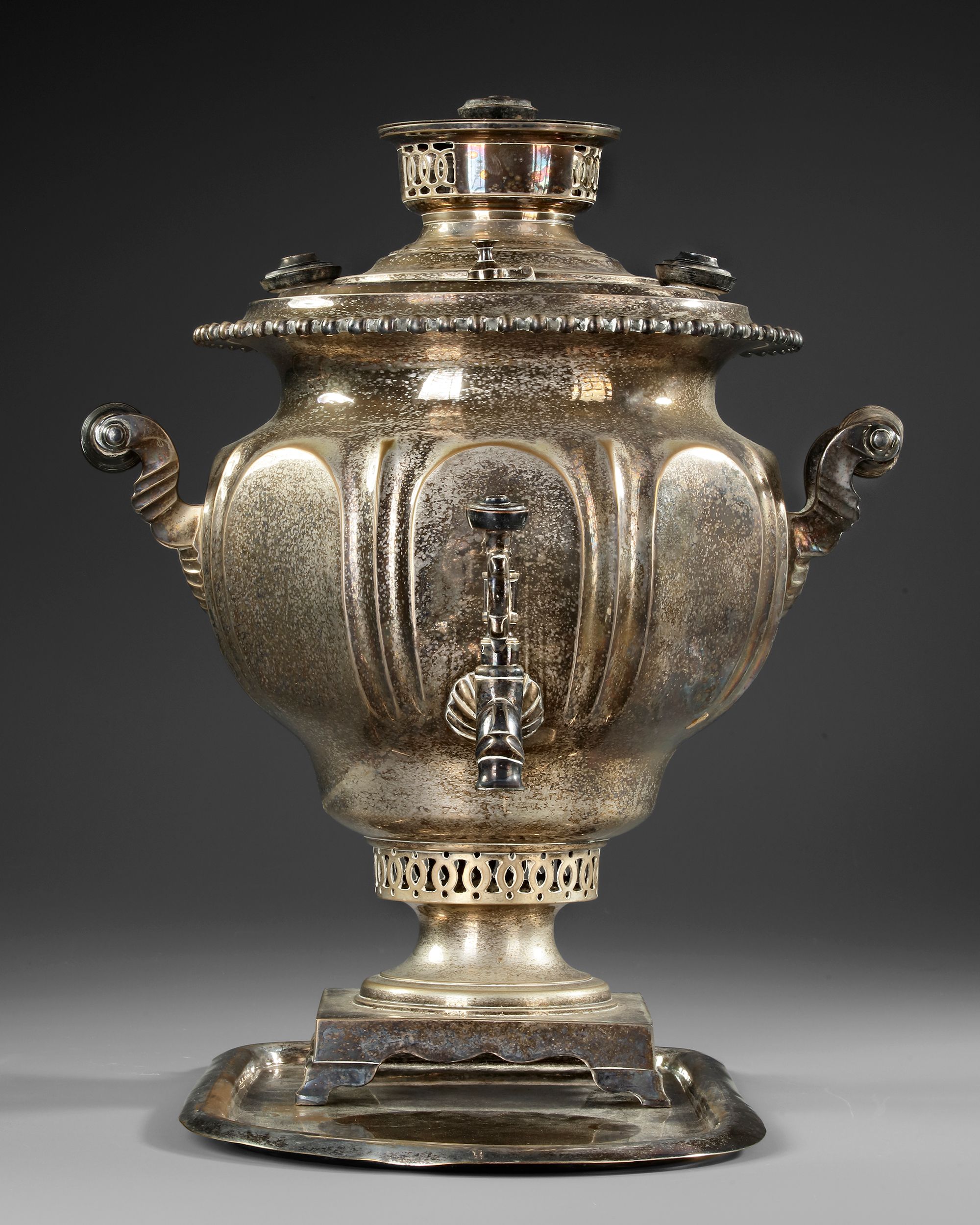 The samovar is fitted with a domed lid with a beaded rim, surmounted by a cylindrical chimney mount with pierced ventilation panels and a small knop finial. Two scrolling side handles project from decorative brackets on either side of the body. A tap with a curved spout and ornate key handle emerges from the lower body for dispensing liquid, while a projecting heating element housing aligns with the internal chimney.