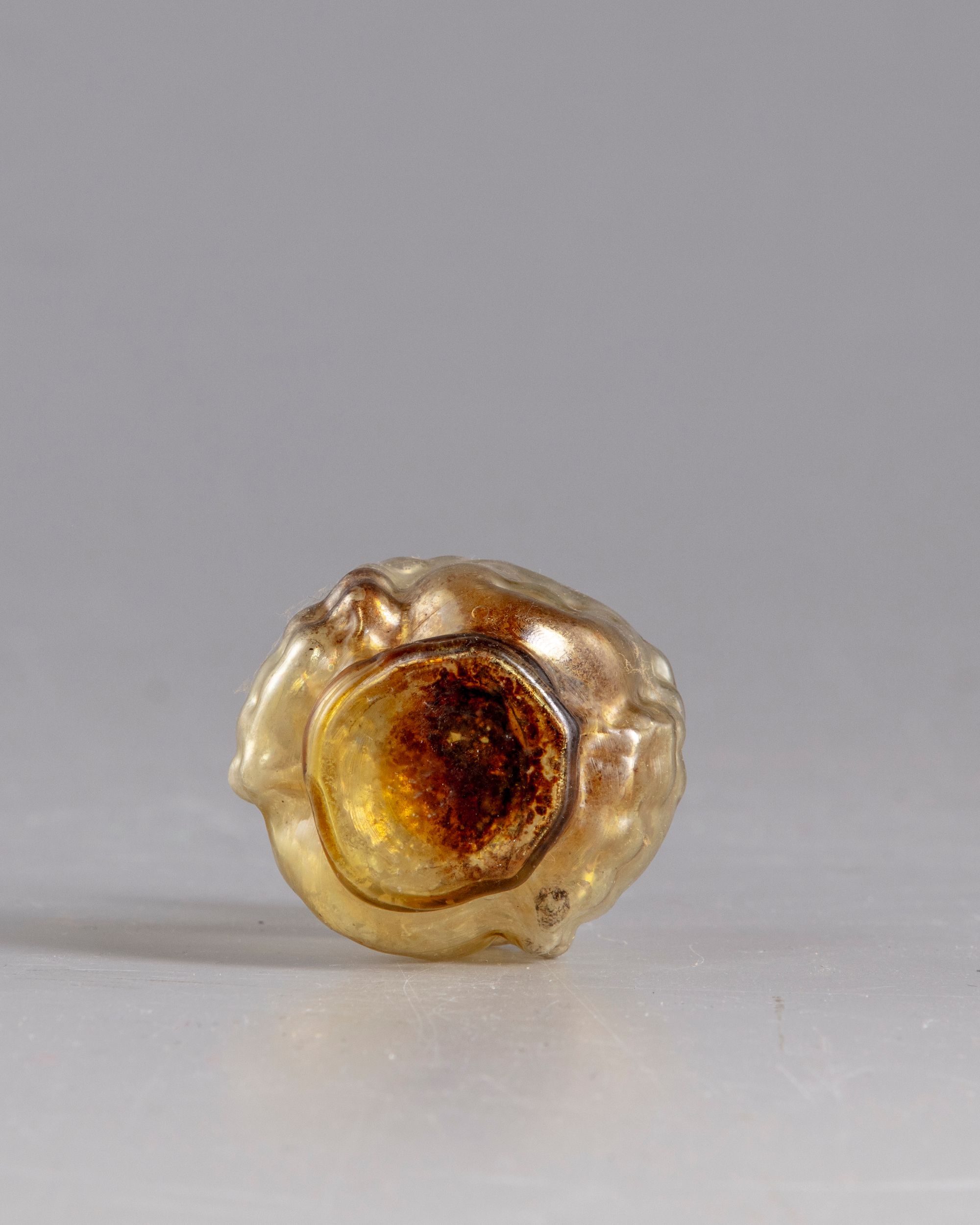A Roman glass flask , made of metallic yellow mould-blown glass. The vessel features a short, cylindrical neck; a flaring rounded lip; and a rounded body resembling two identical faces of youthful cherubs,their curly hair represented by raised blobs. The flask has been blown in a two-part mould.