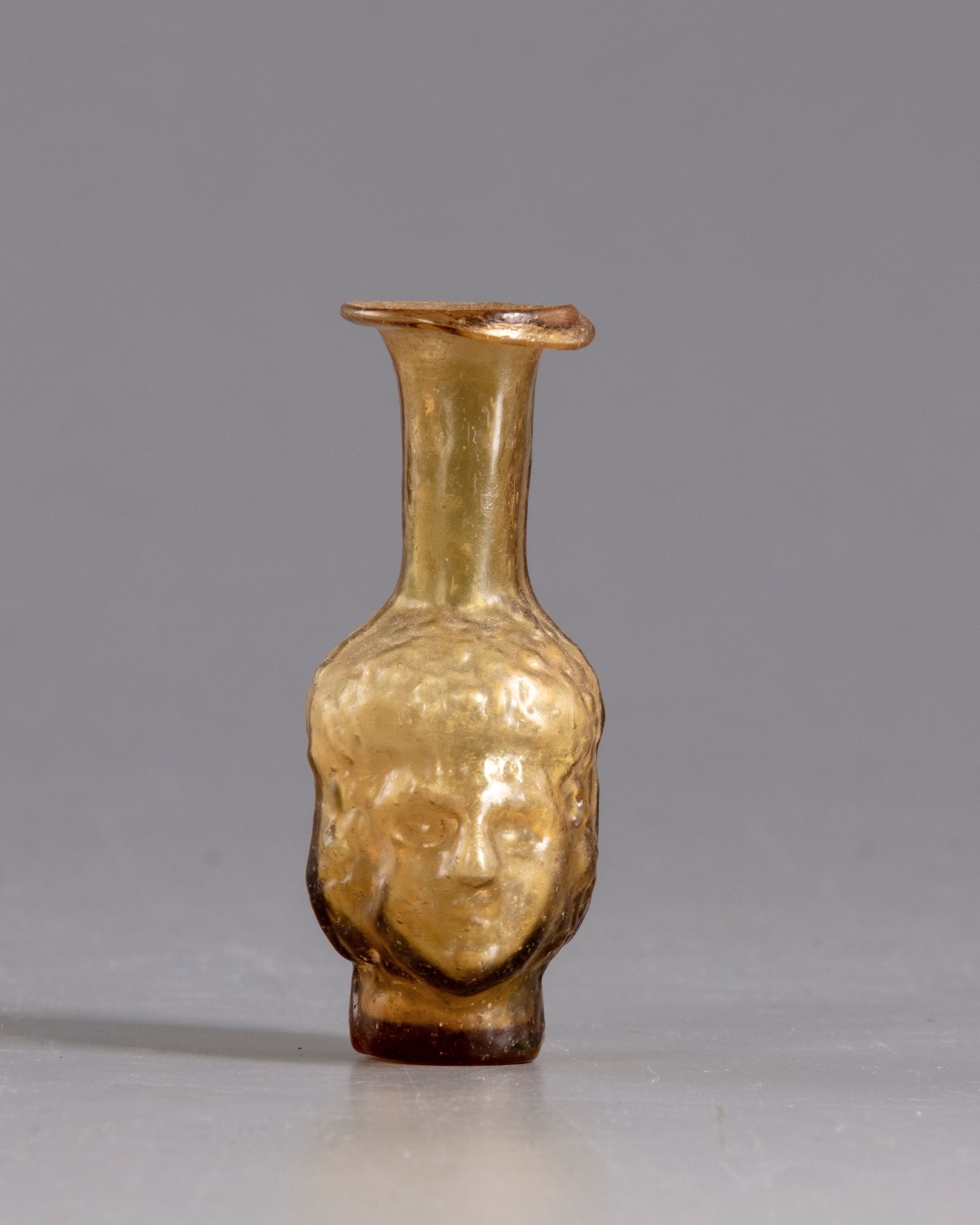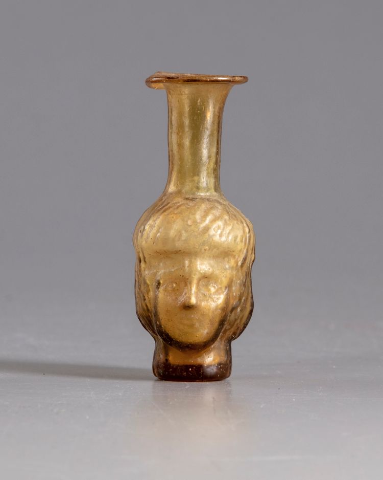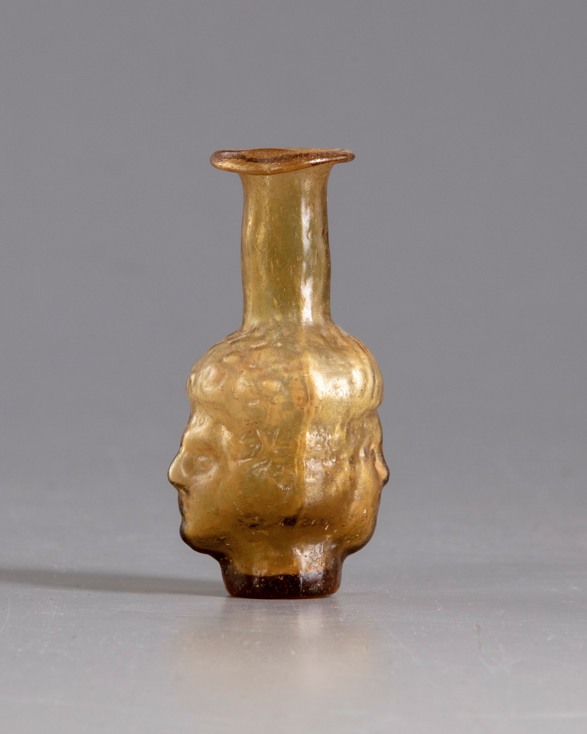 A Roman glass flask , made of metallic yellow mould-blown glass. The vessel features a long tapering, cylindrical neck, a flaring rounded lip, and a rounded body resembling two identical faces of a Woman. The flask has been blown in a two-part mould.