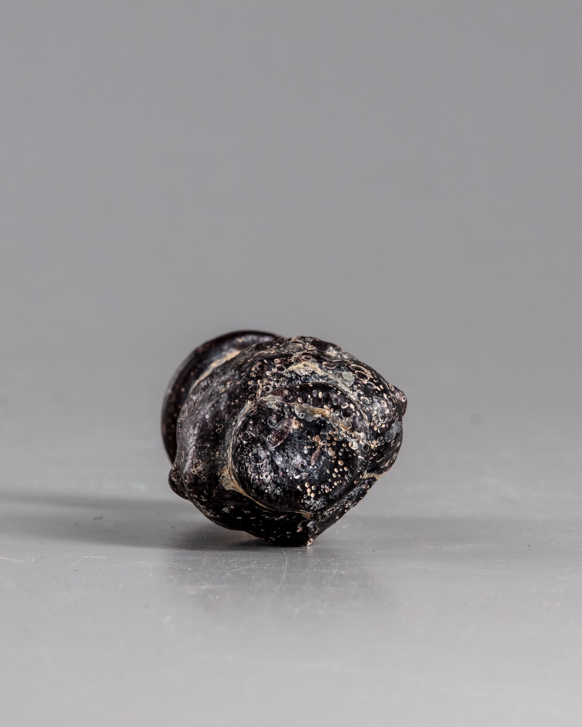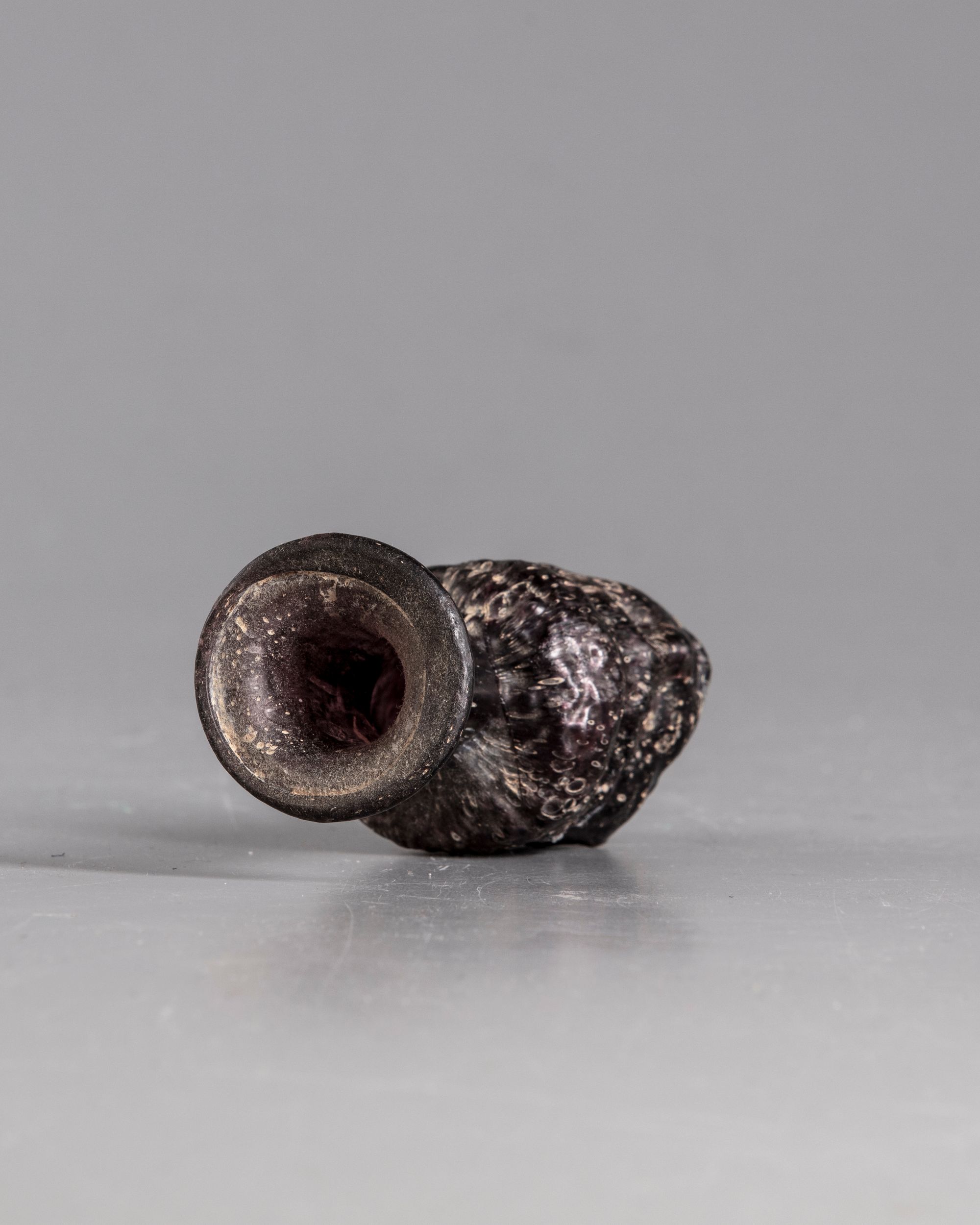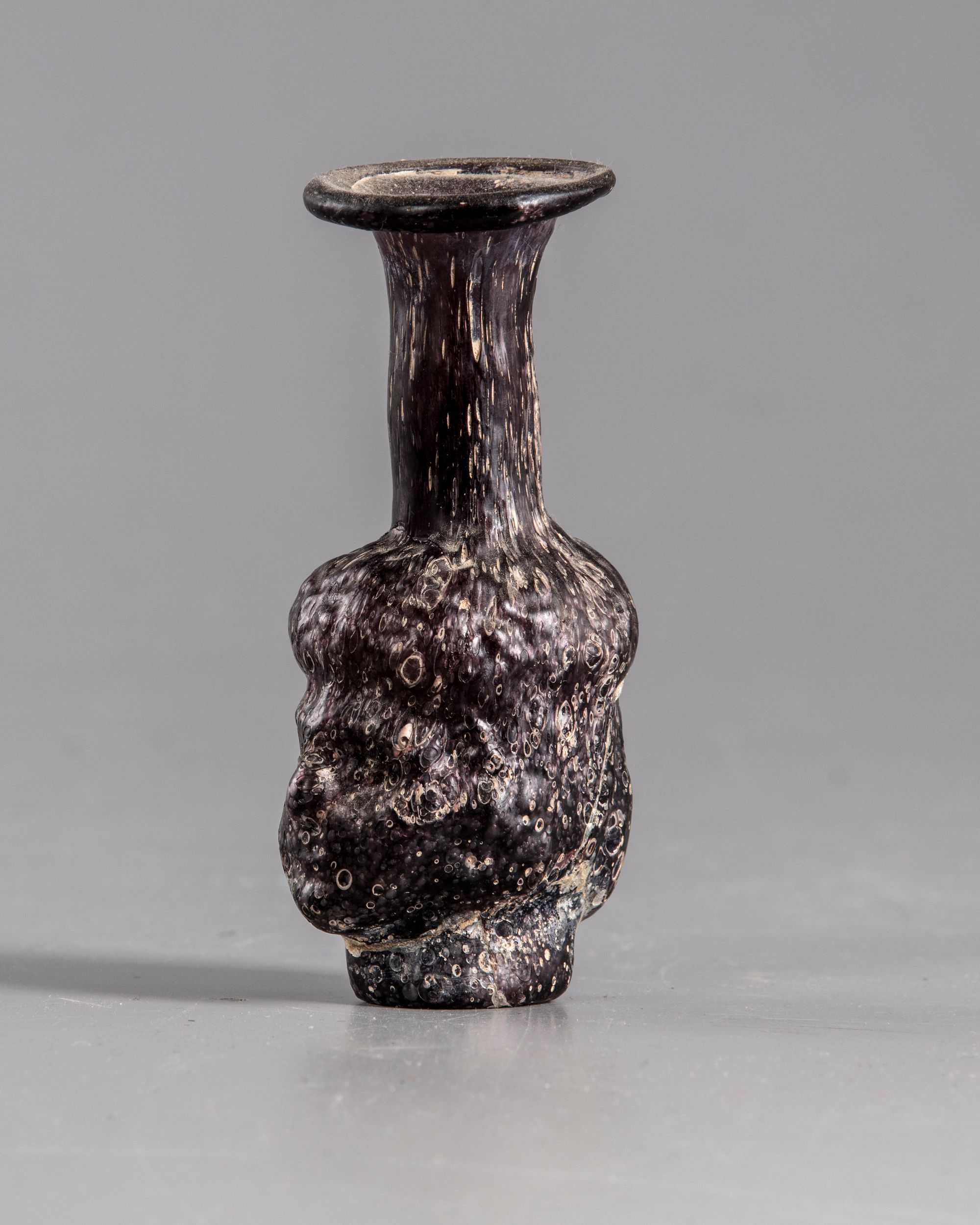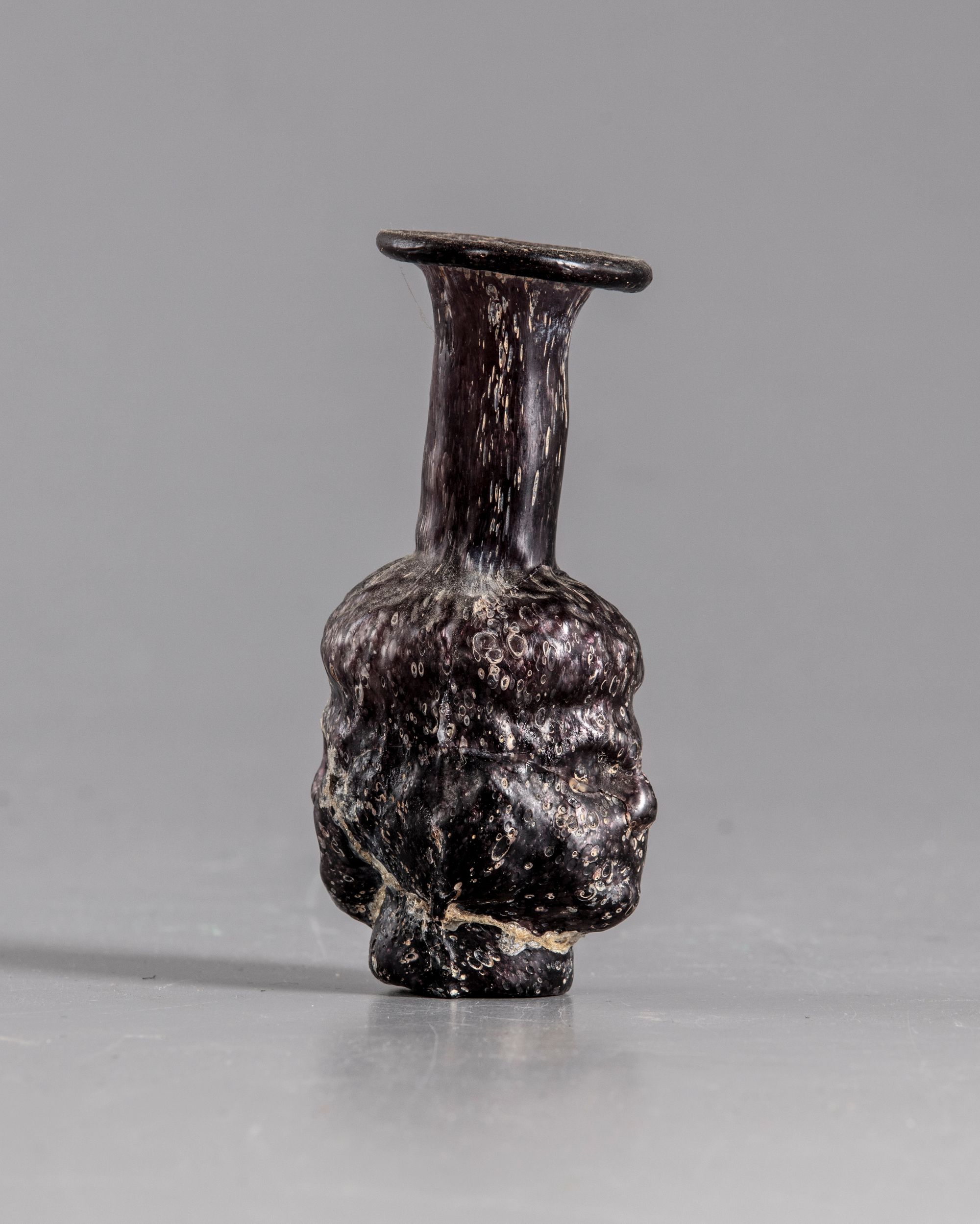 A Roman purple glass head flask, mold-blown in two parts of heads. Flask with body in form of two human heads back to back, with short tapering cylindrical neck and everted rim, with long hair indicated by rows of globule-like curls with a flat base.