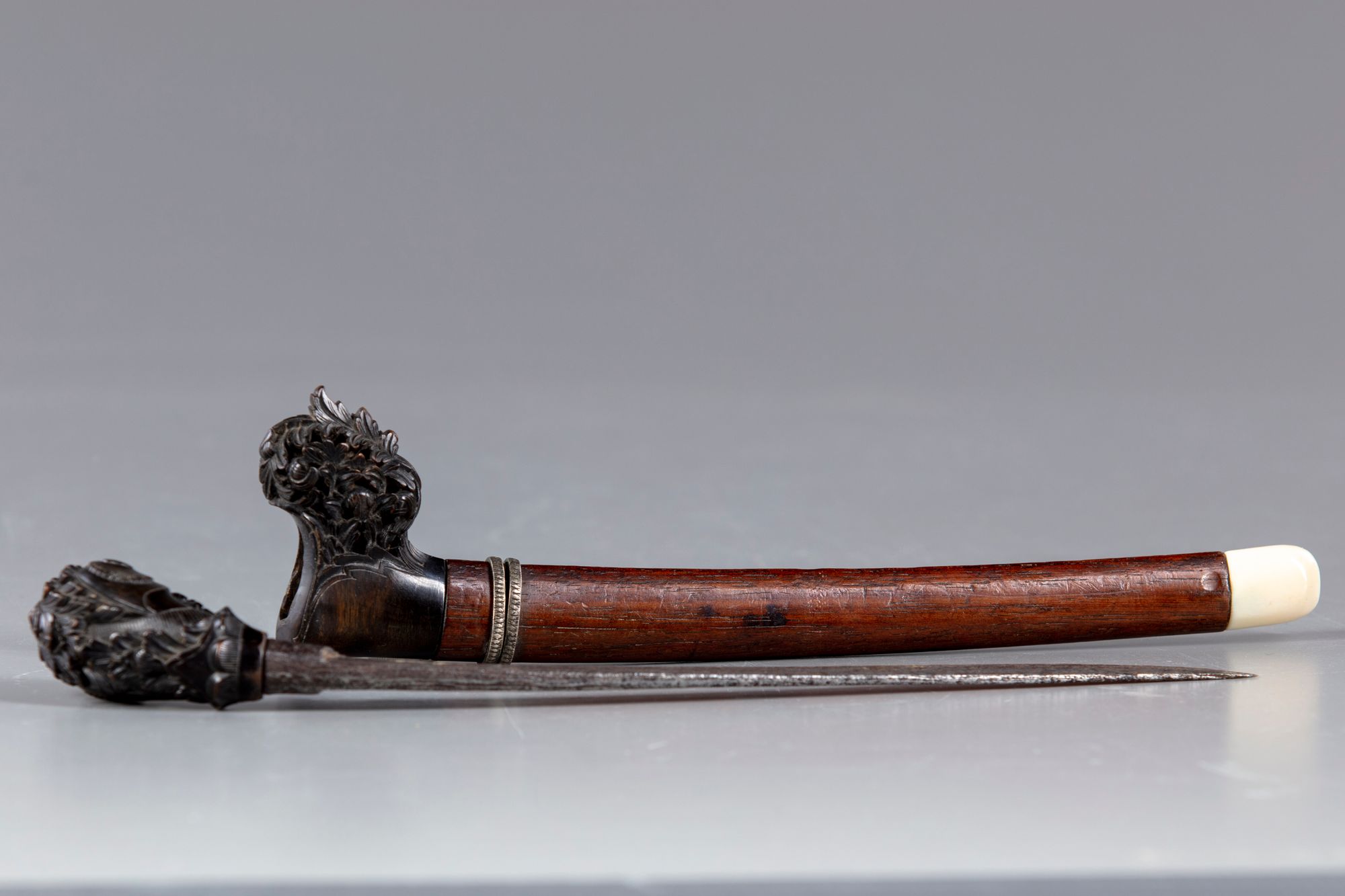The single-edged watered steel blade of tapering form with bird shaped hilt. 27 cm.
