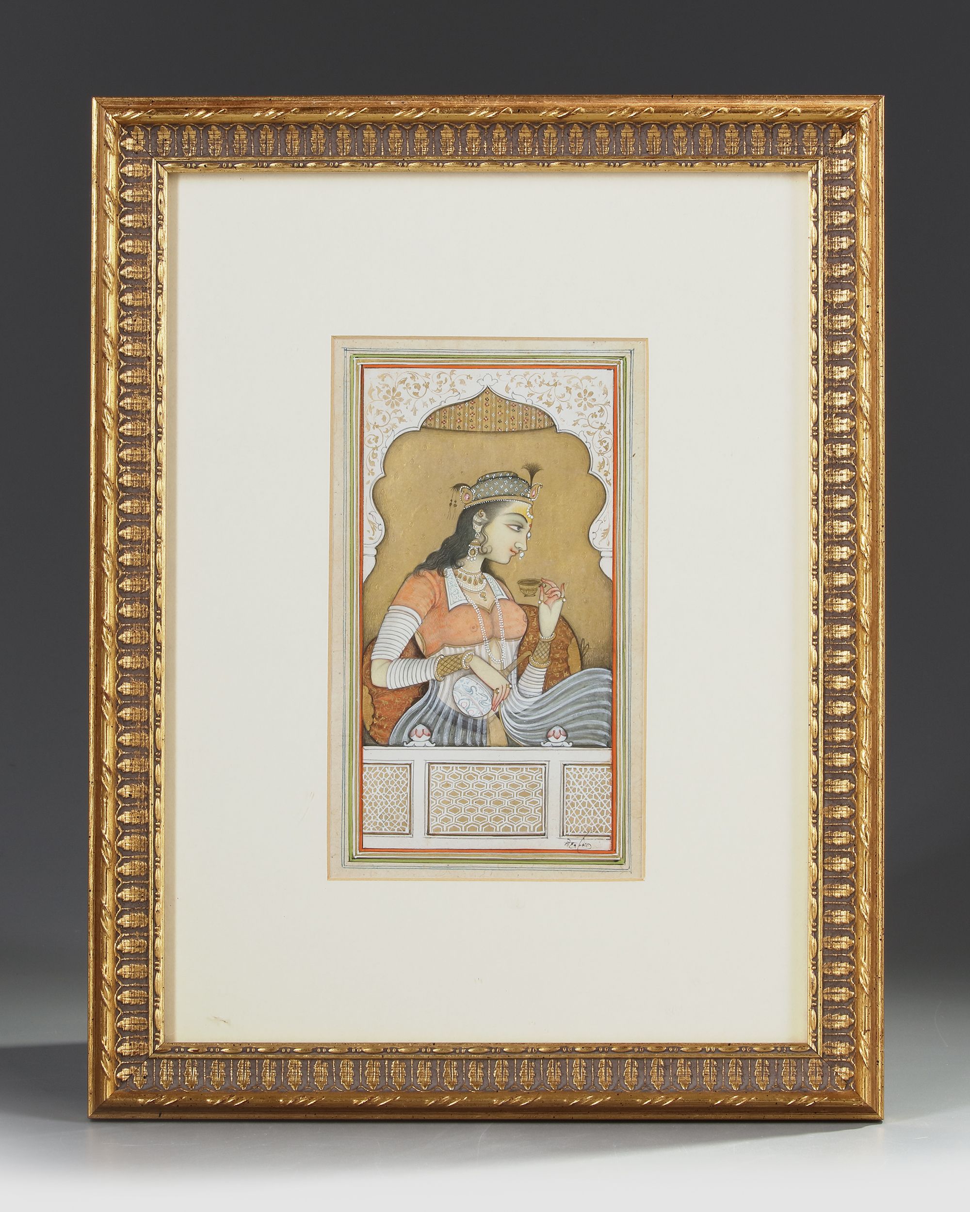 A princess adorned with jewelry drinking tea on a balcony, in a frame. 19 by 11.5 cm. 36 by 28 cm.