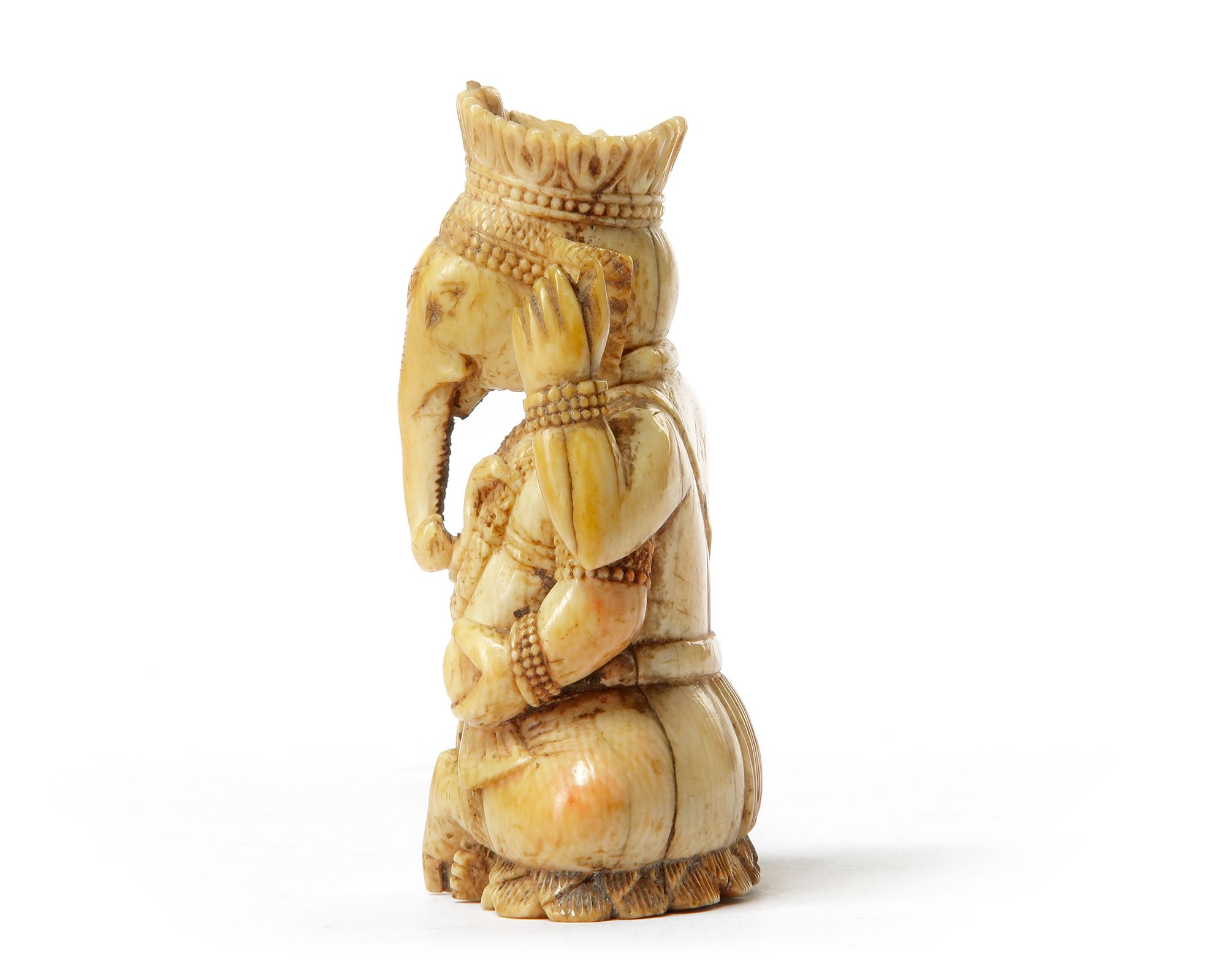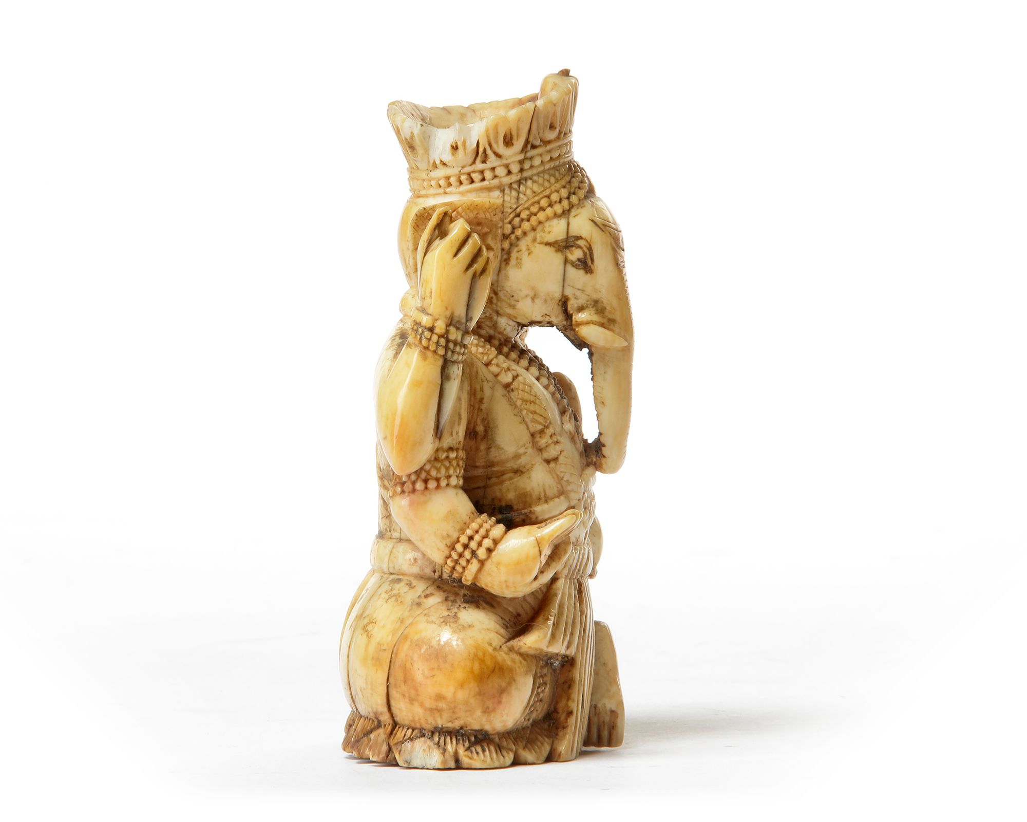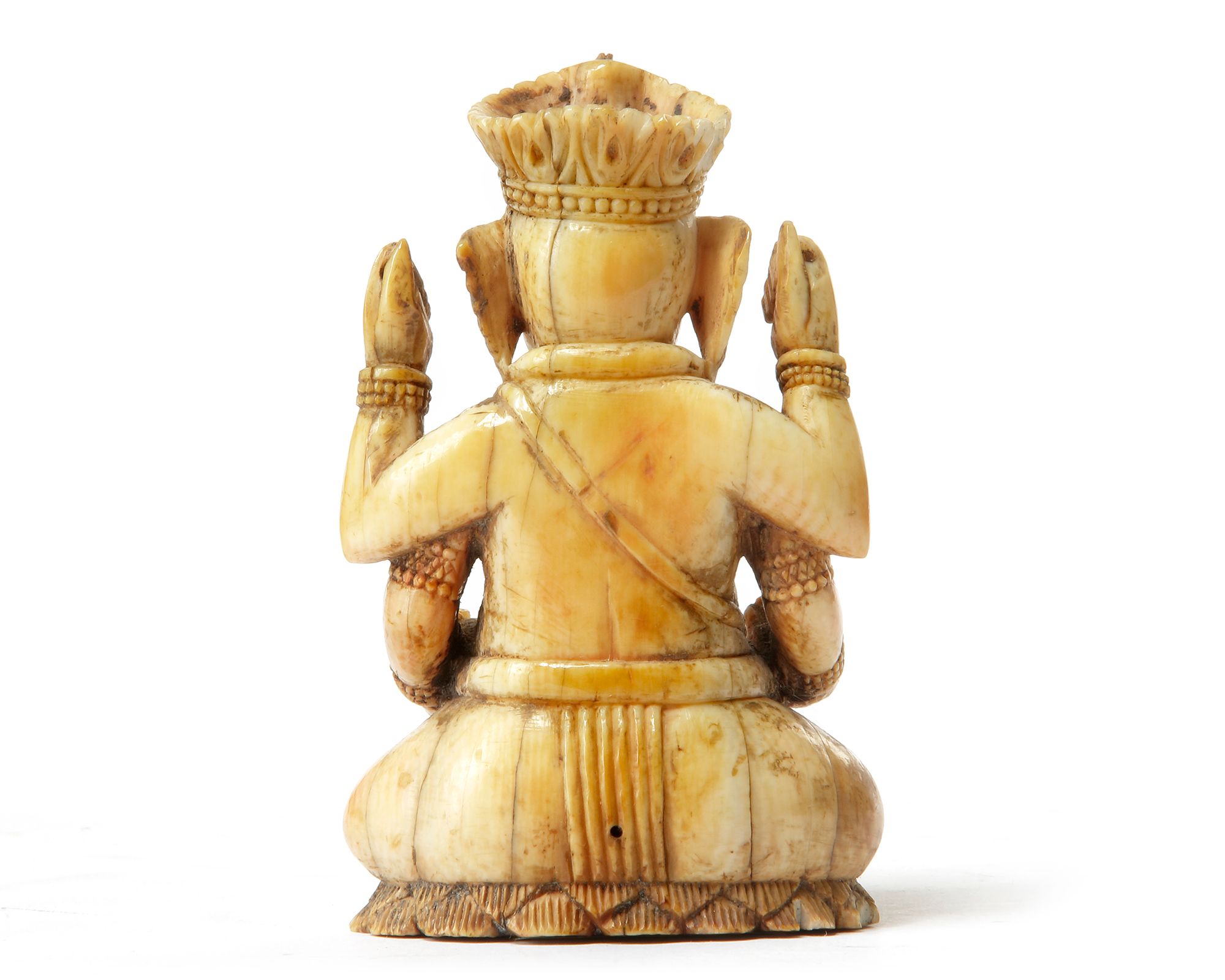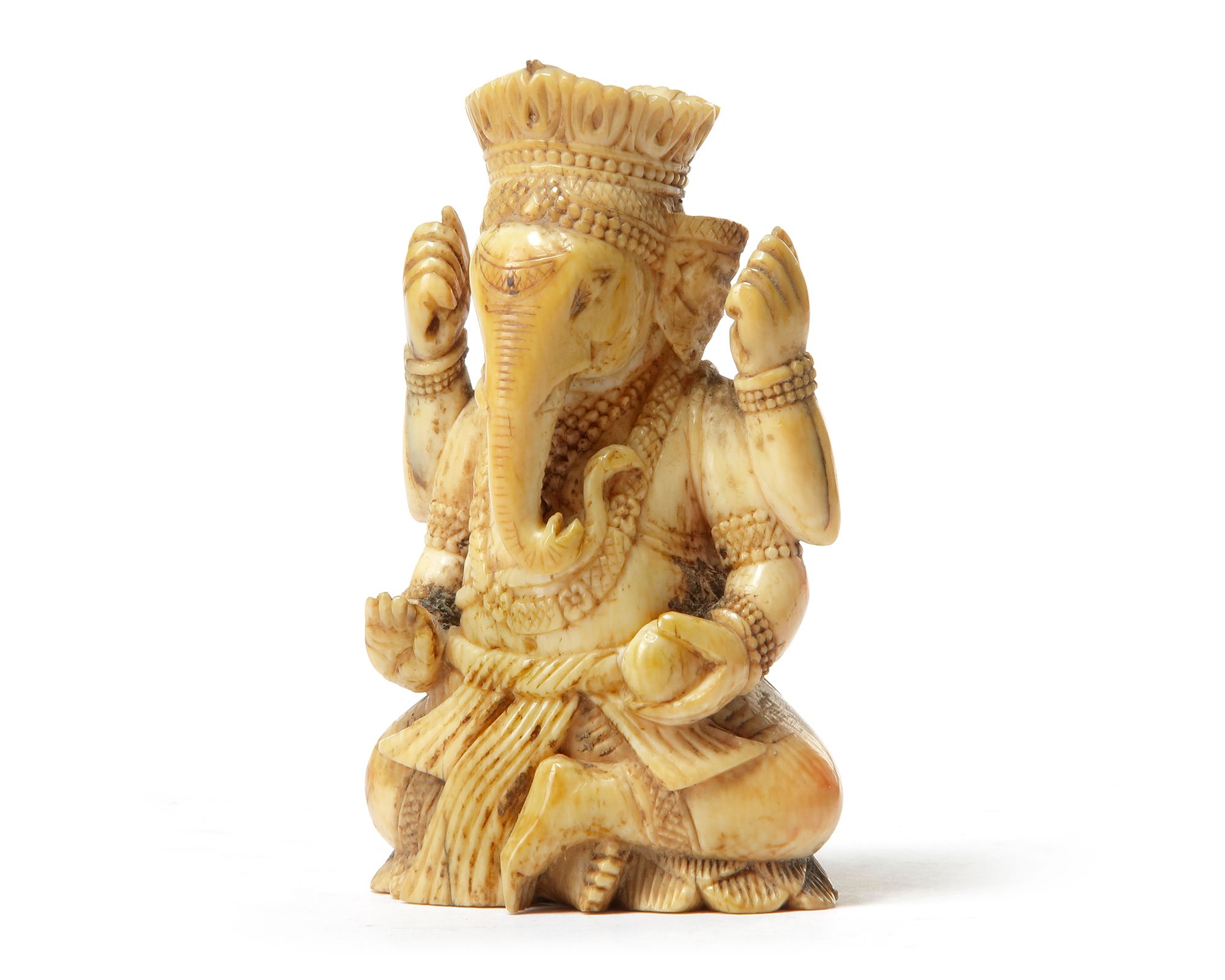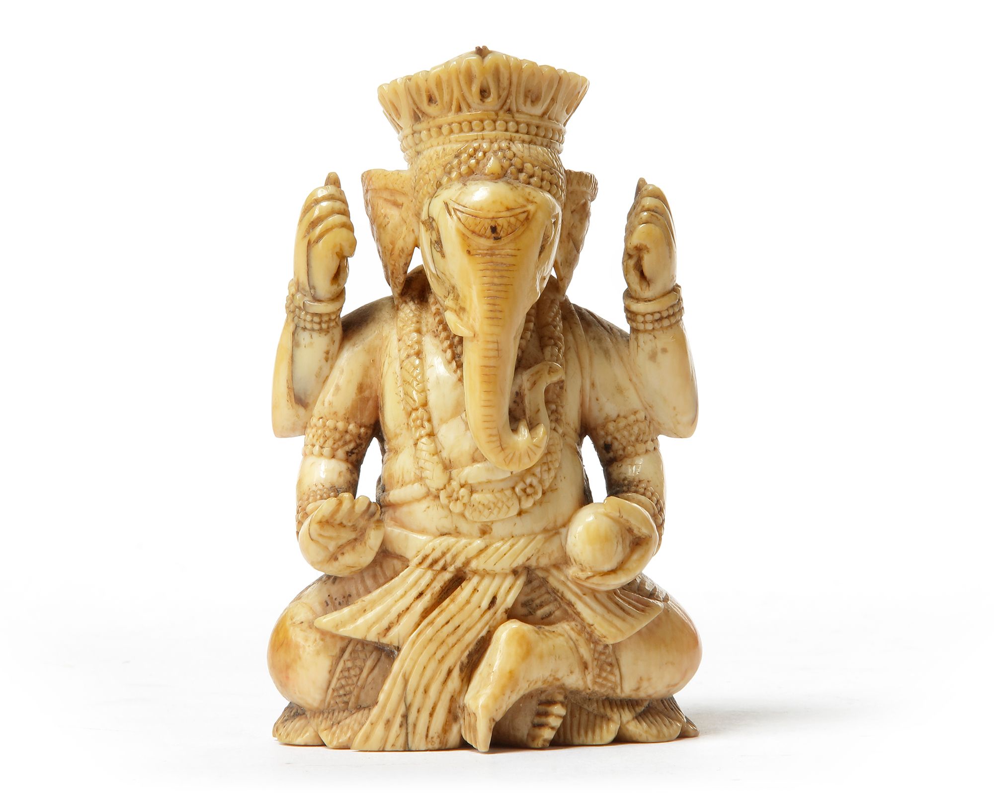 The Hindu god of auspiciousness, Ganesha, is popularly accepted as the first son of Shiva and Parvati. As the deity who controls obstacles—their invention and their removal—he is worshiped prior to any serious undertaking. This seated four-armed Ganesha, modelled seated on a lotus stand with serpent belt around rotund belly, and holding a box of sweets.
