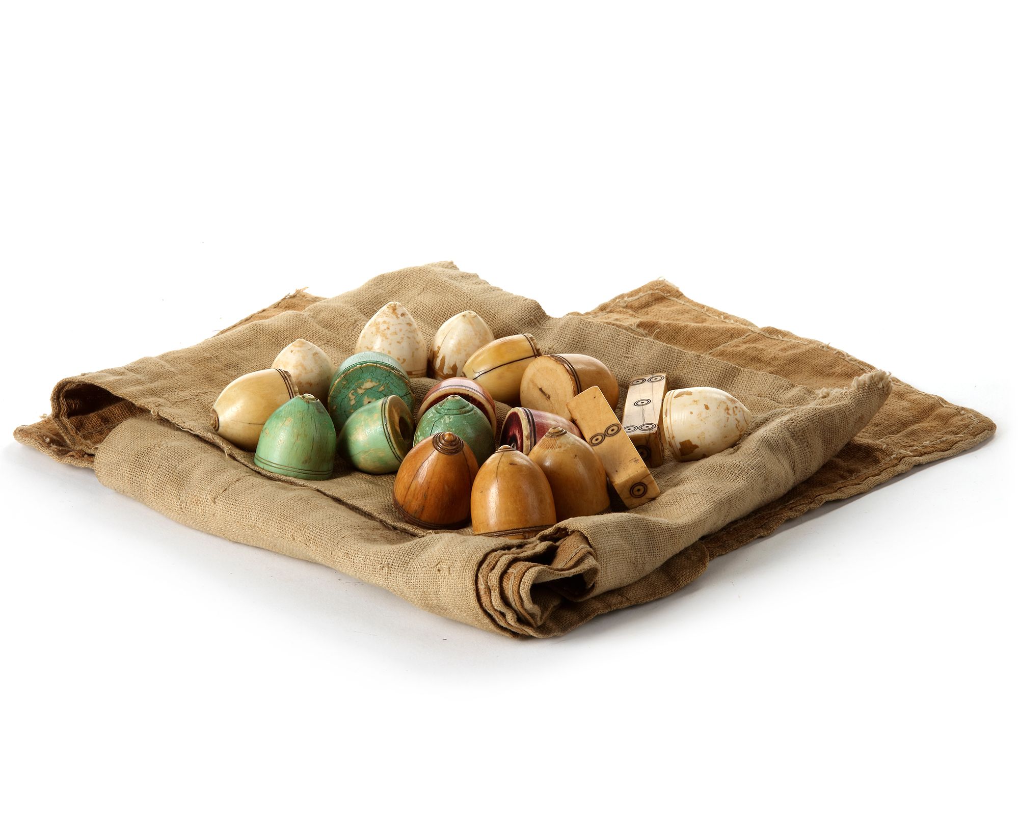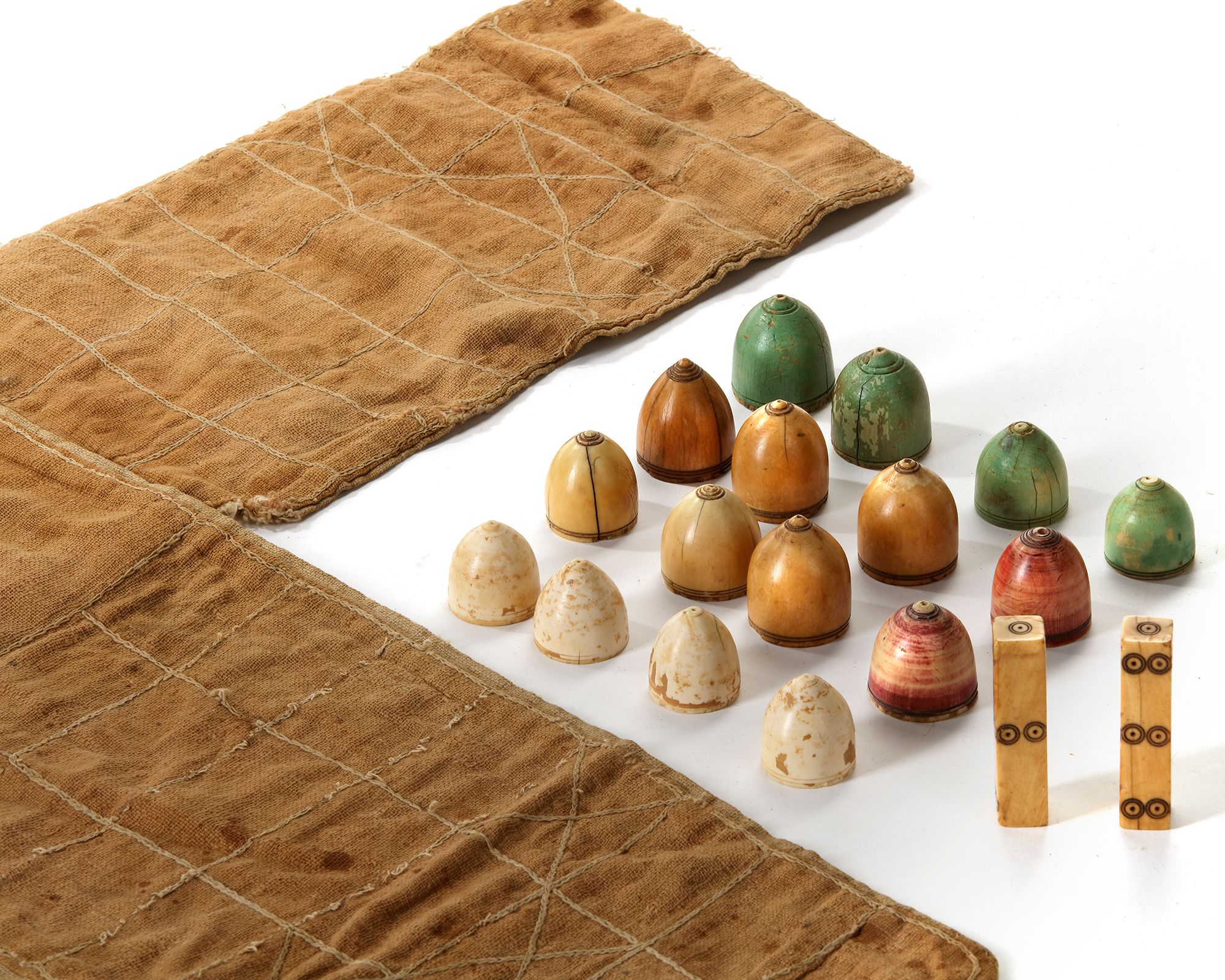 Comprises sixteen domed pieces (narads) and two long dice (usually called pasas).