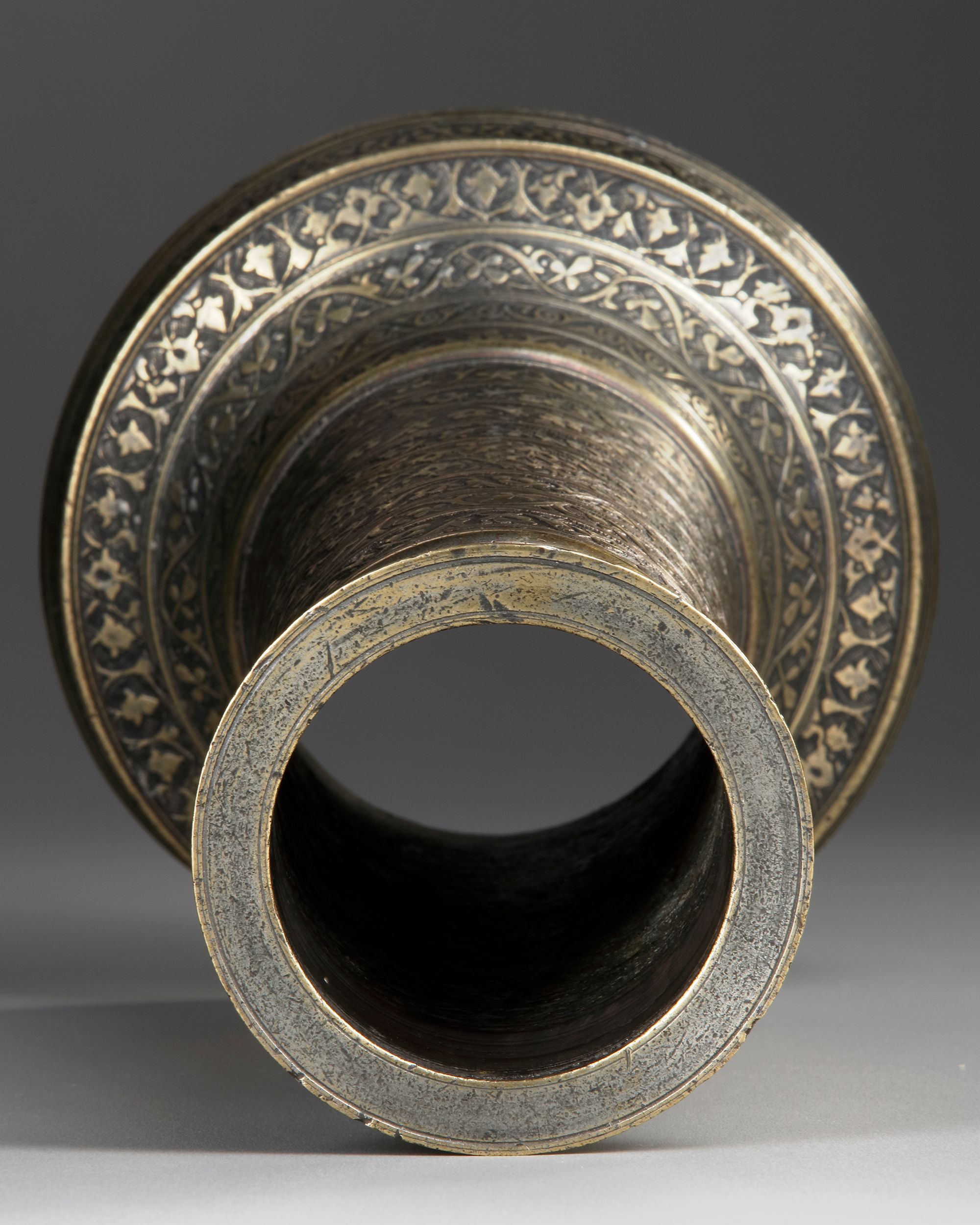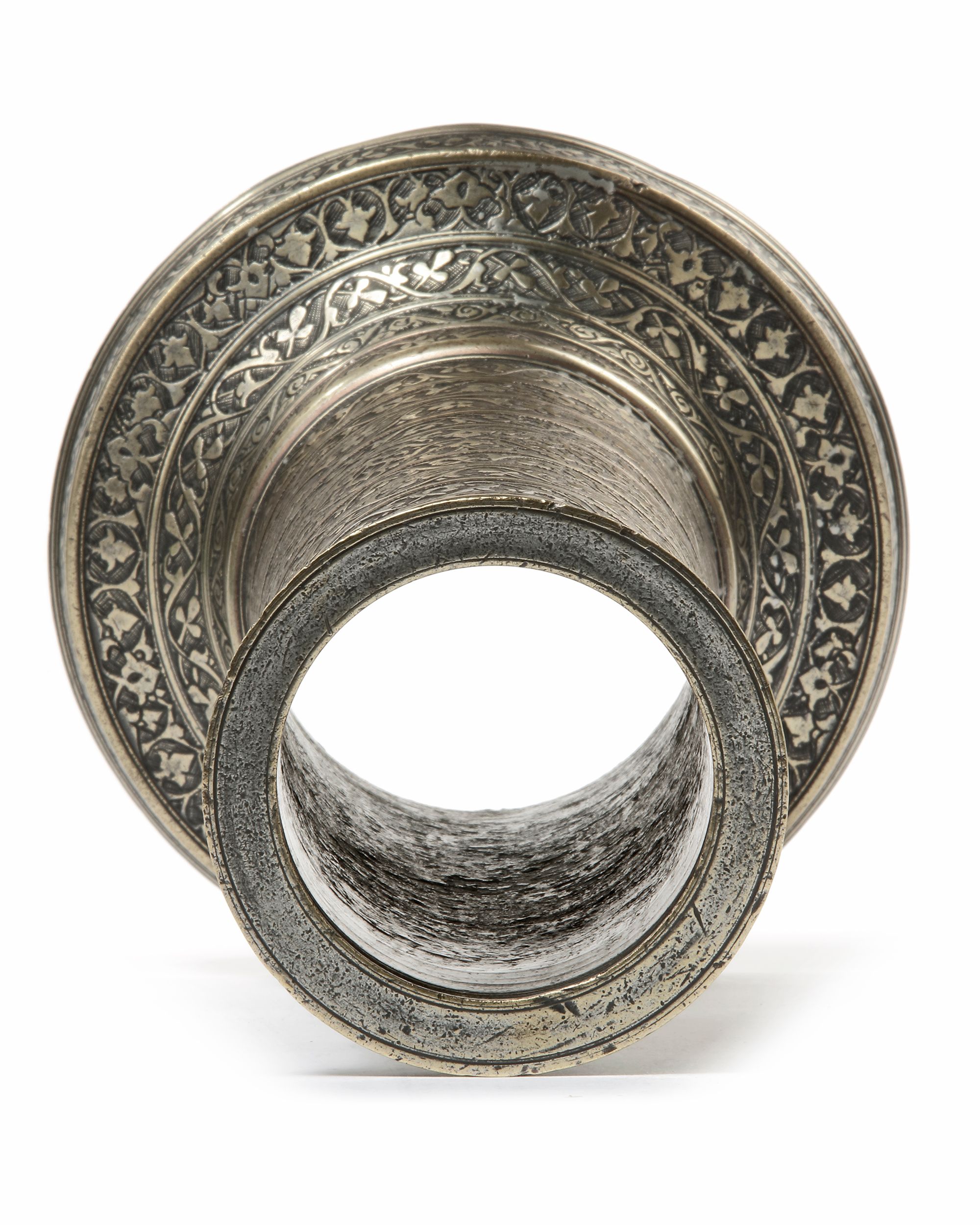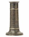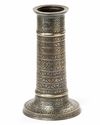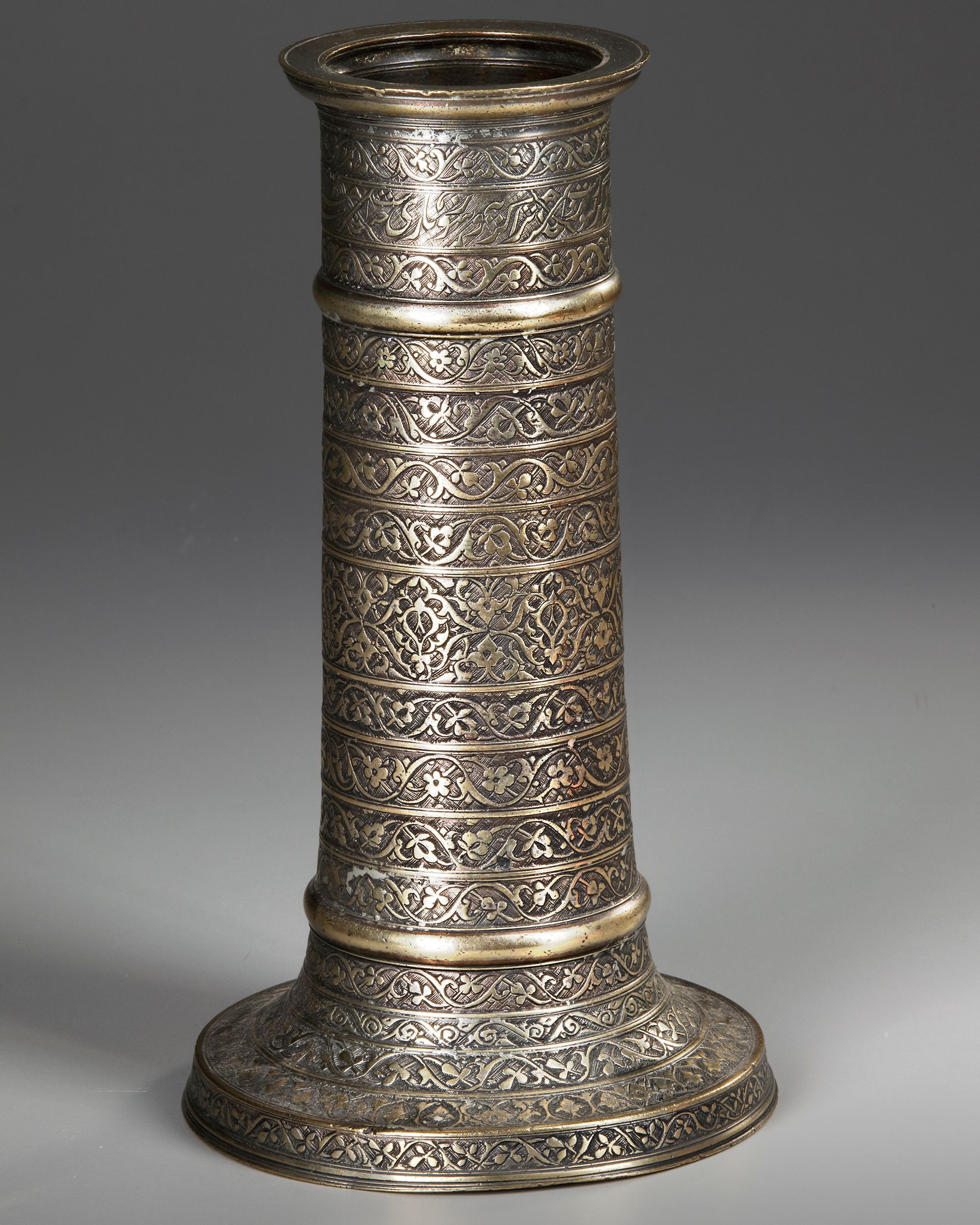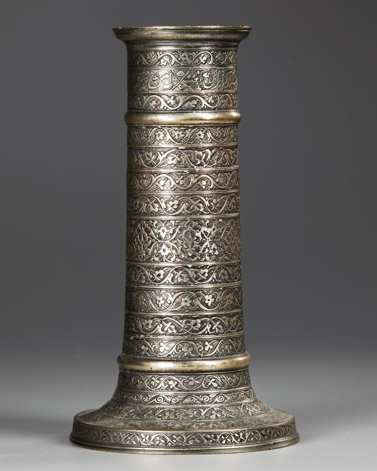 Of cylindrical form, on a splayed base, decorated with narrow bands of scrolling palmettes and floral arabesques, the neck with a central band comprising an inscription in nastaliq.