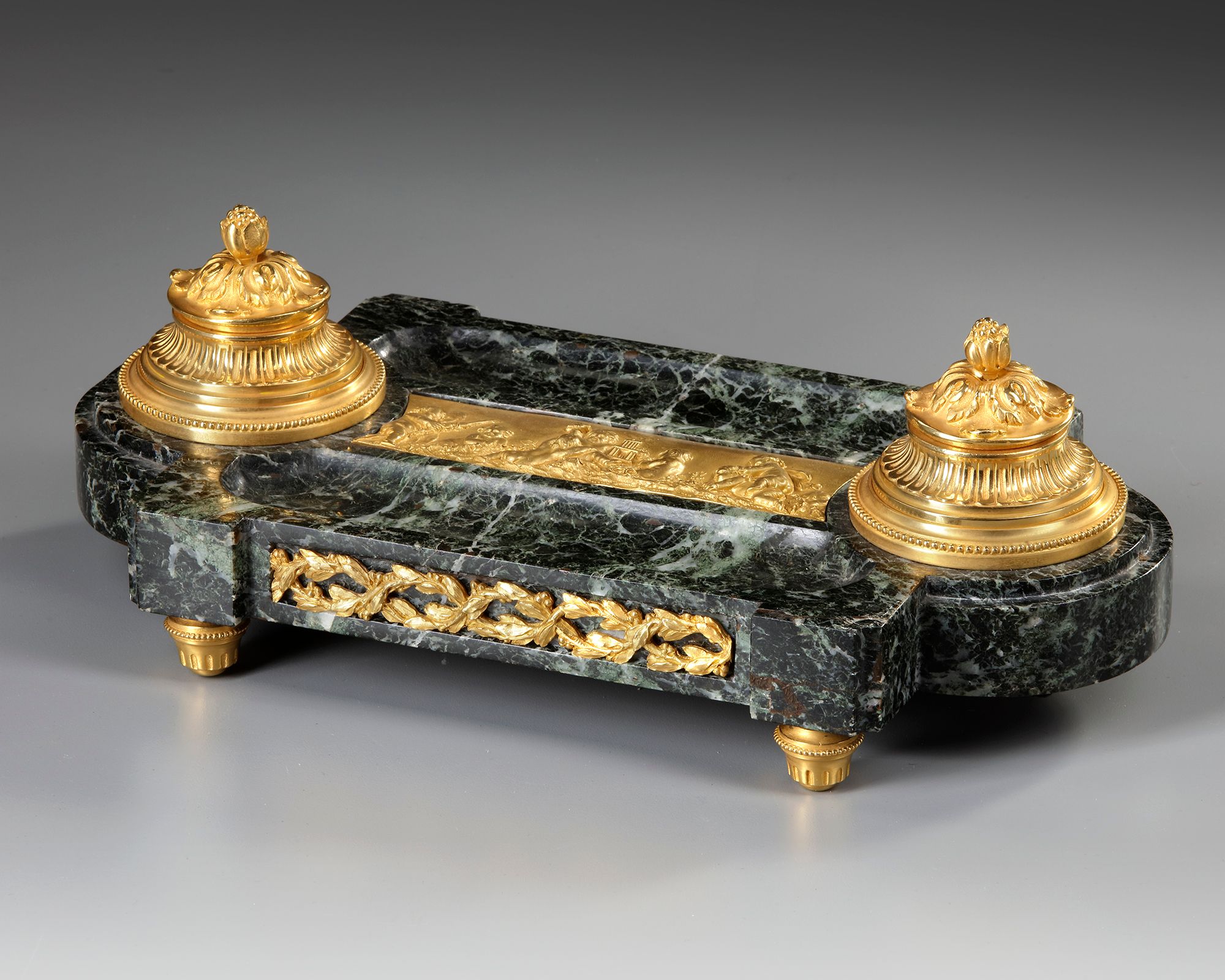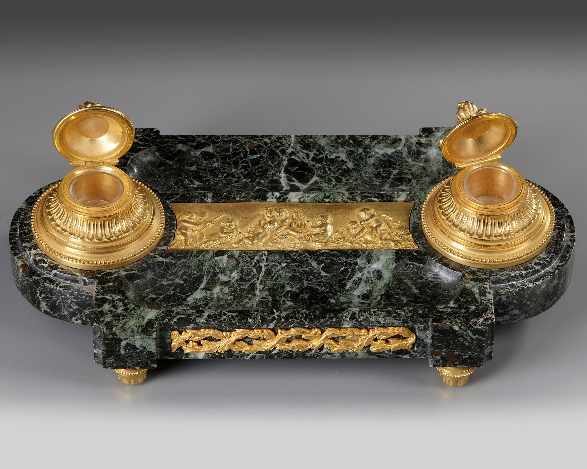 Inkwell in gilt bronze and green marble, plaque in middle with cherubs, Napoleon III periode. H 17 cm. L 36 cm. W 15 cm.