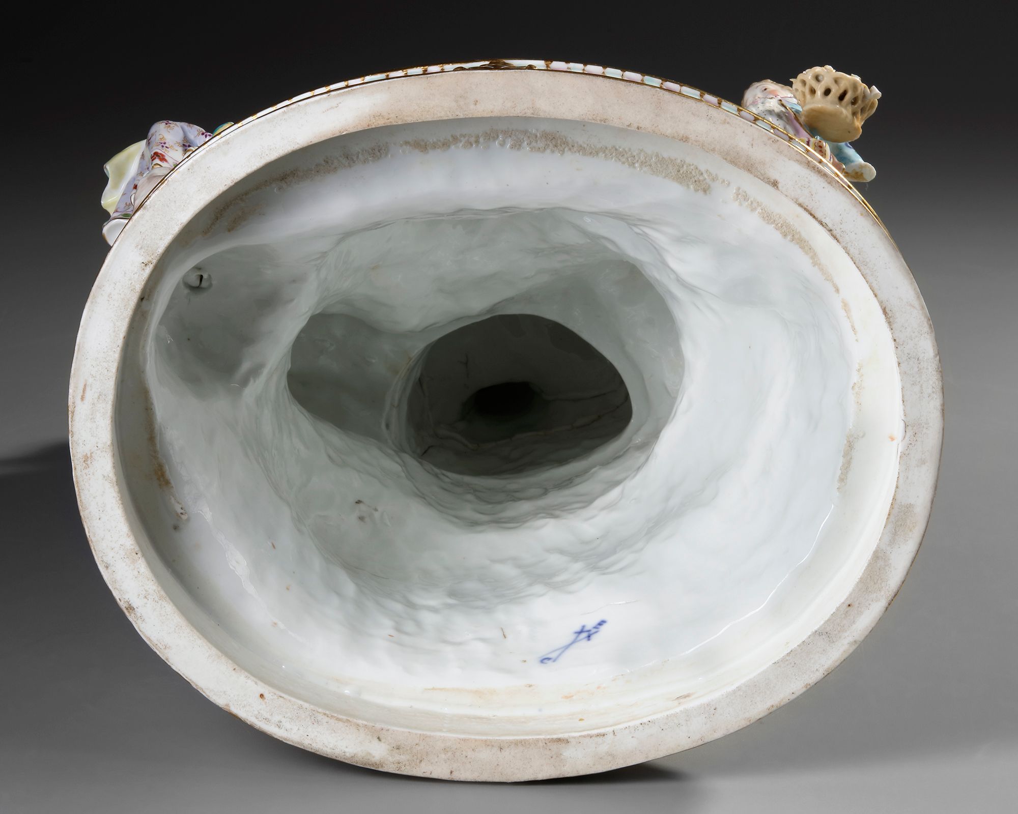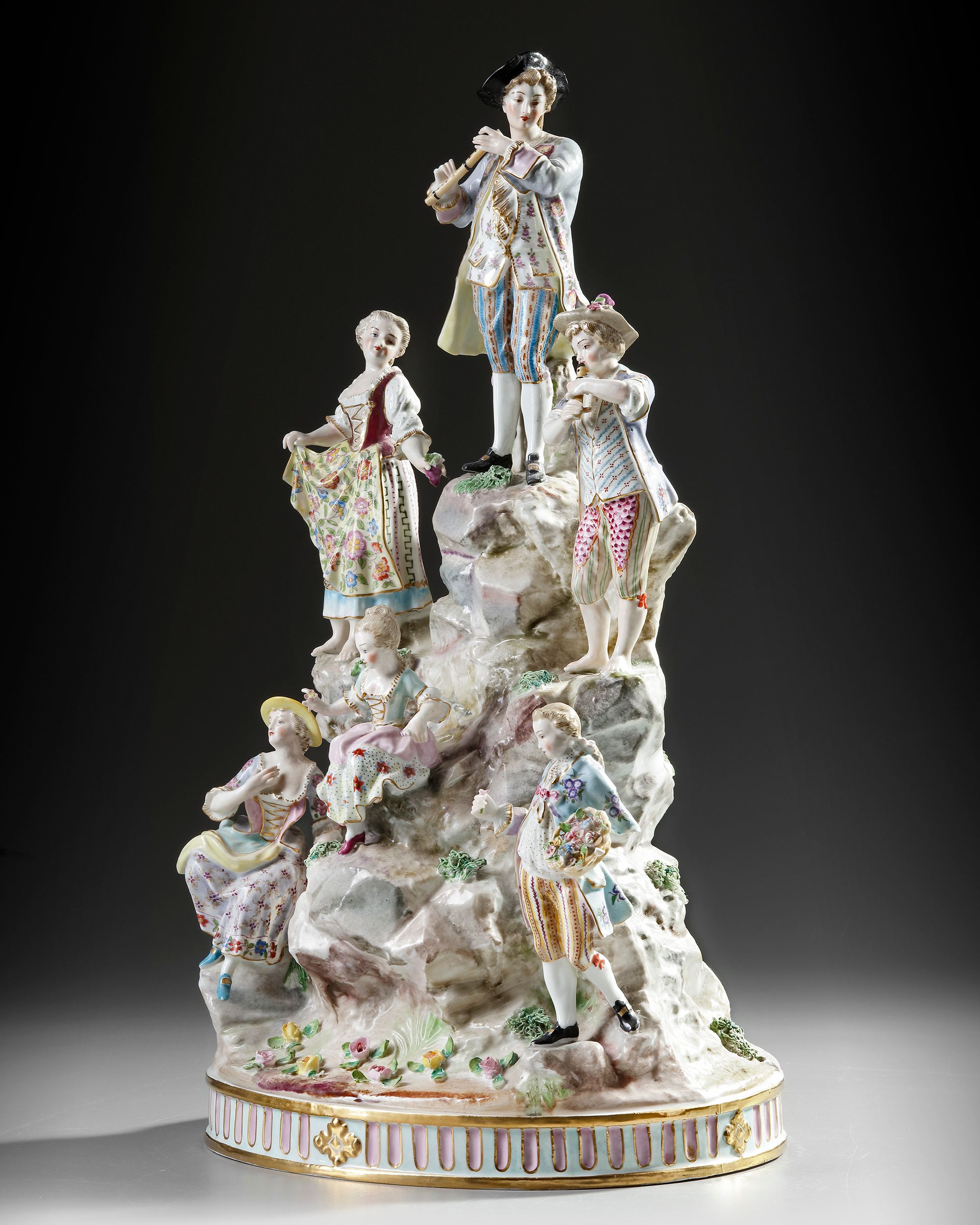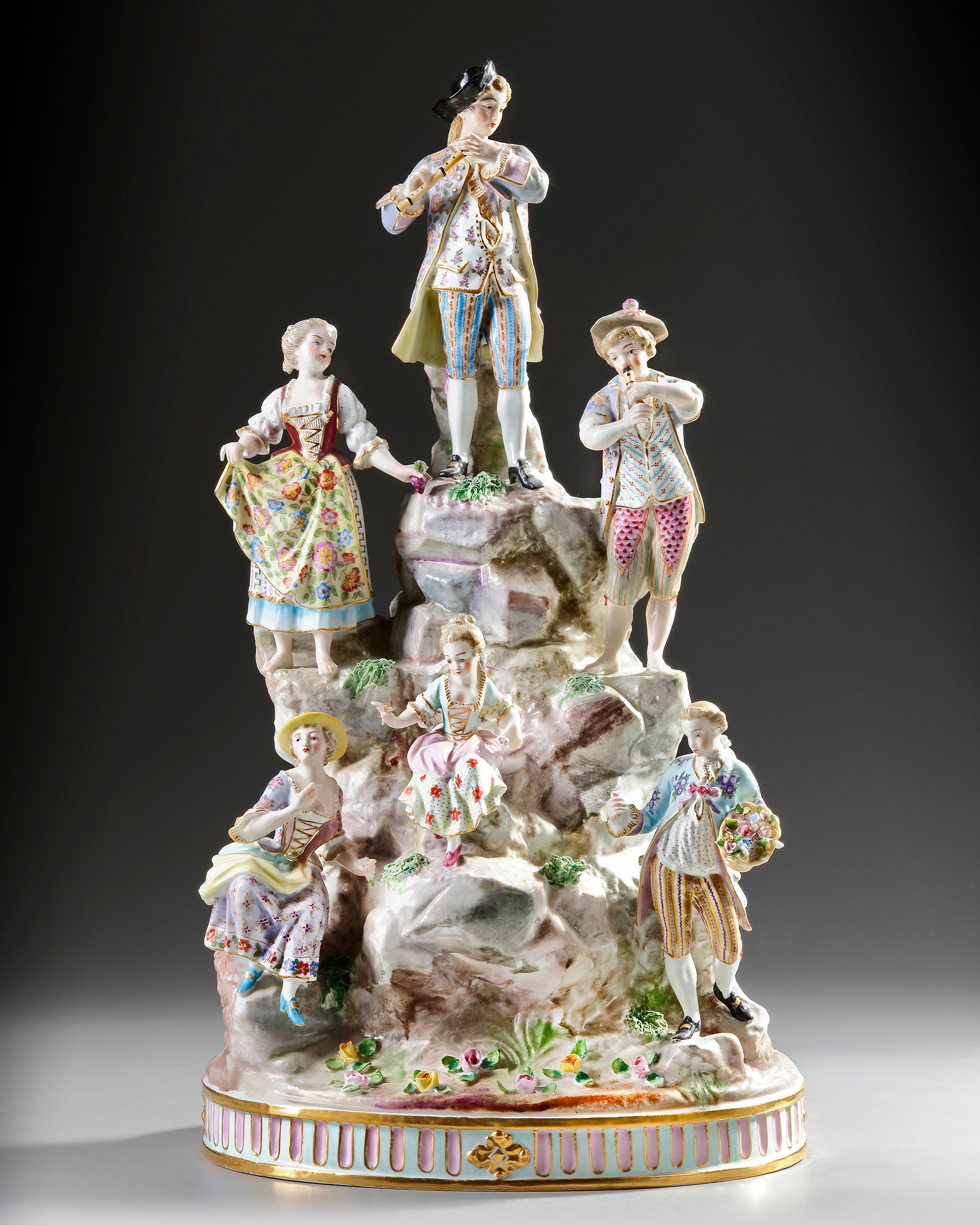 Porcelain with polychrome decoration representing a group of musicians in 18th century costumes. On an oval base.