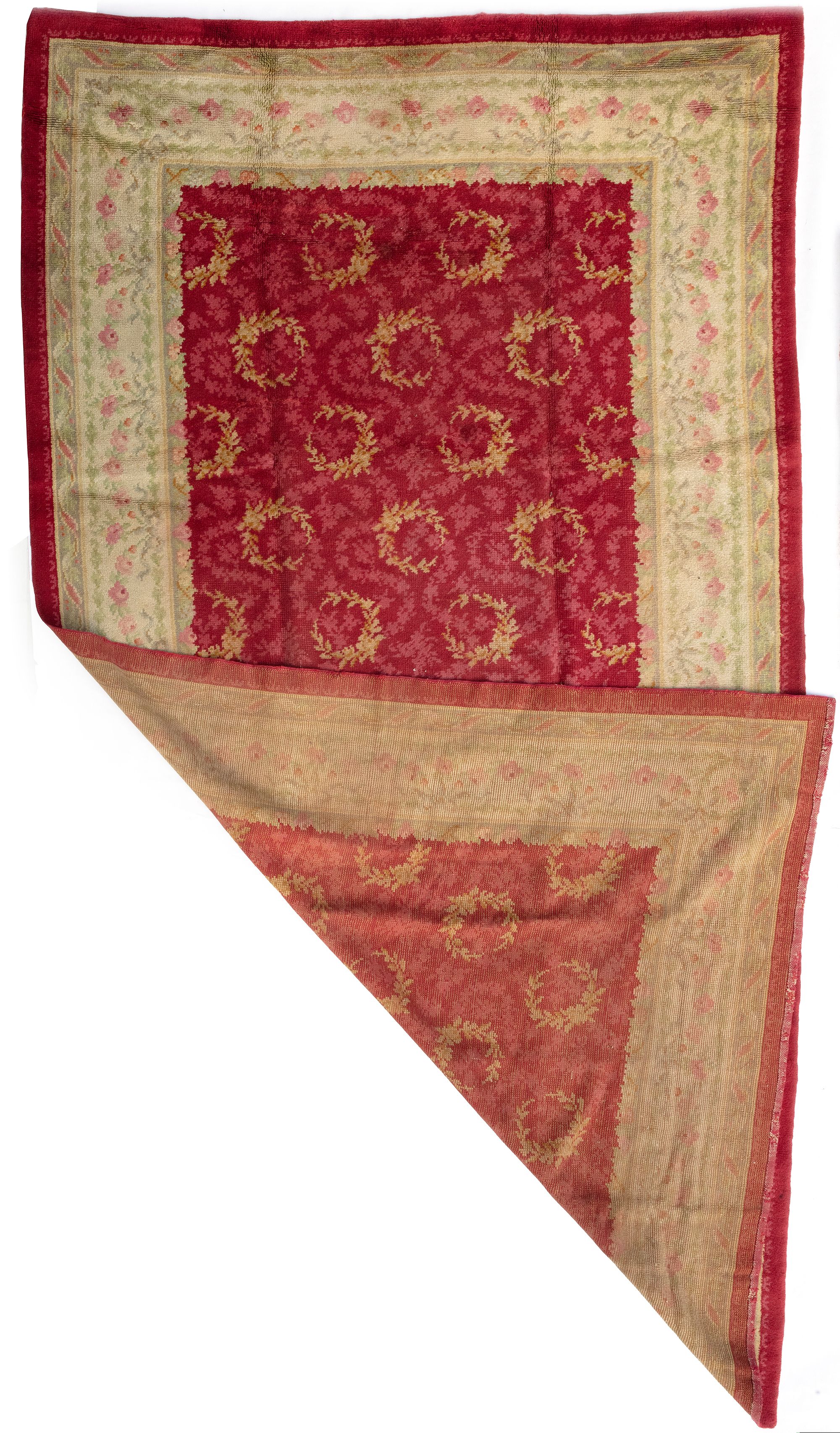 Bright red-ground floral carpet with a light border, knotted wool on cotton. Condition is good considering its age. 250 by 460 cm.