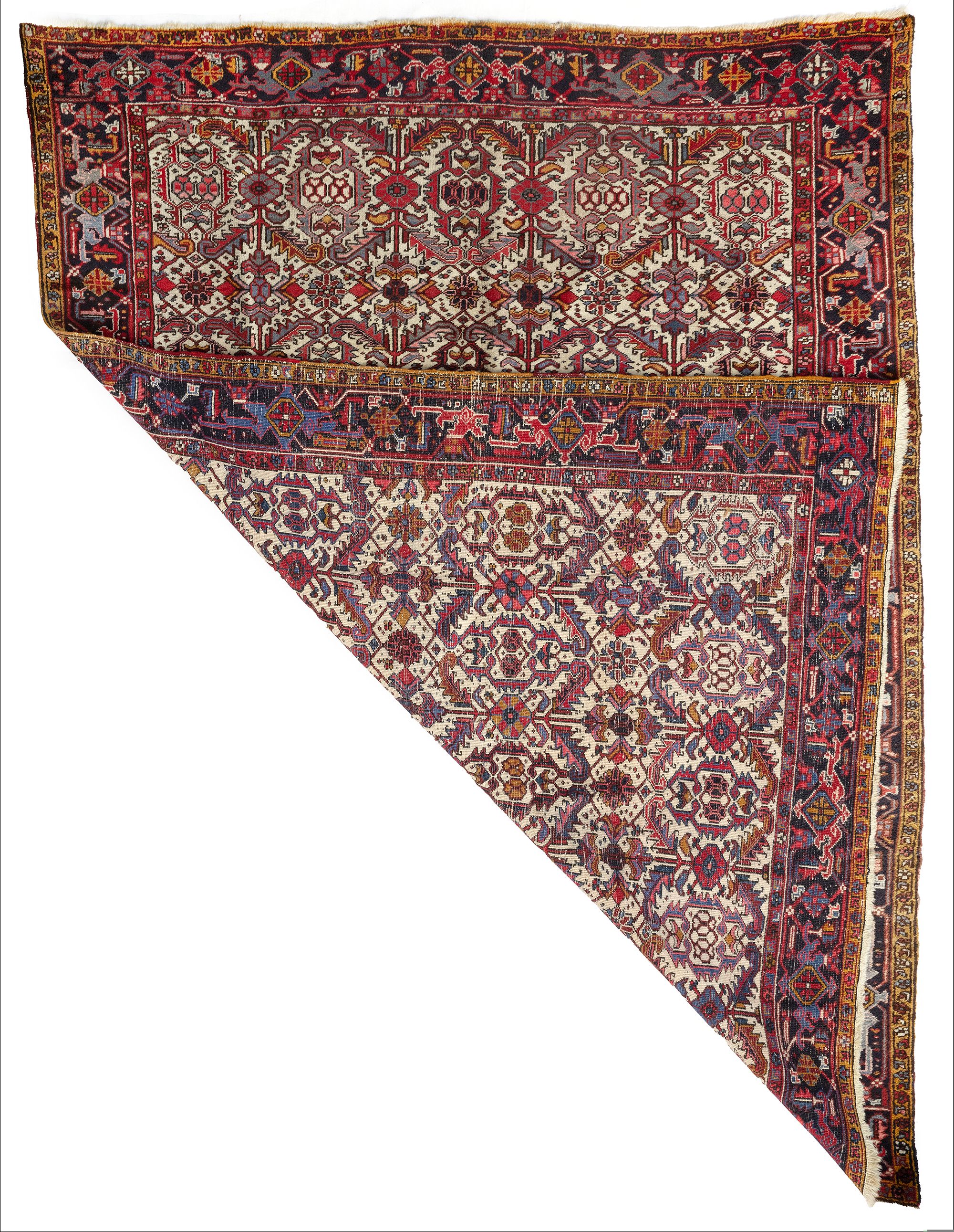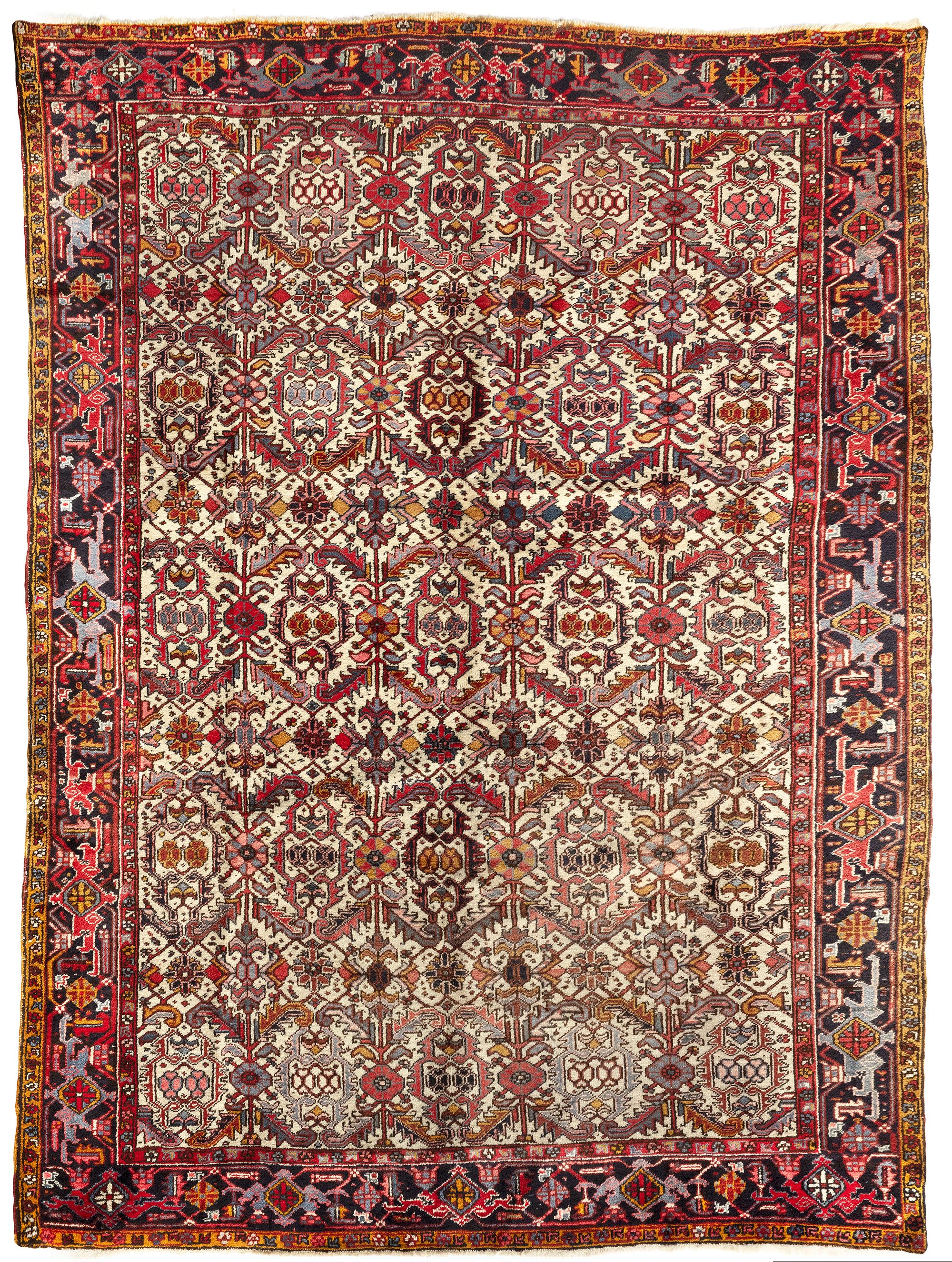 Wool on cotton, pattern on a white background Good condition considering its age. 247 by 328 cm.