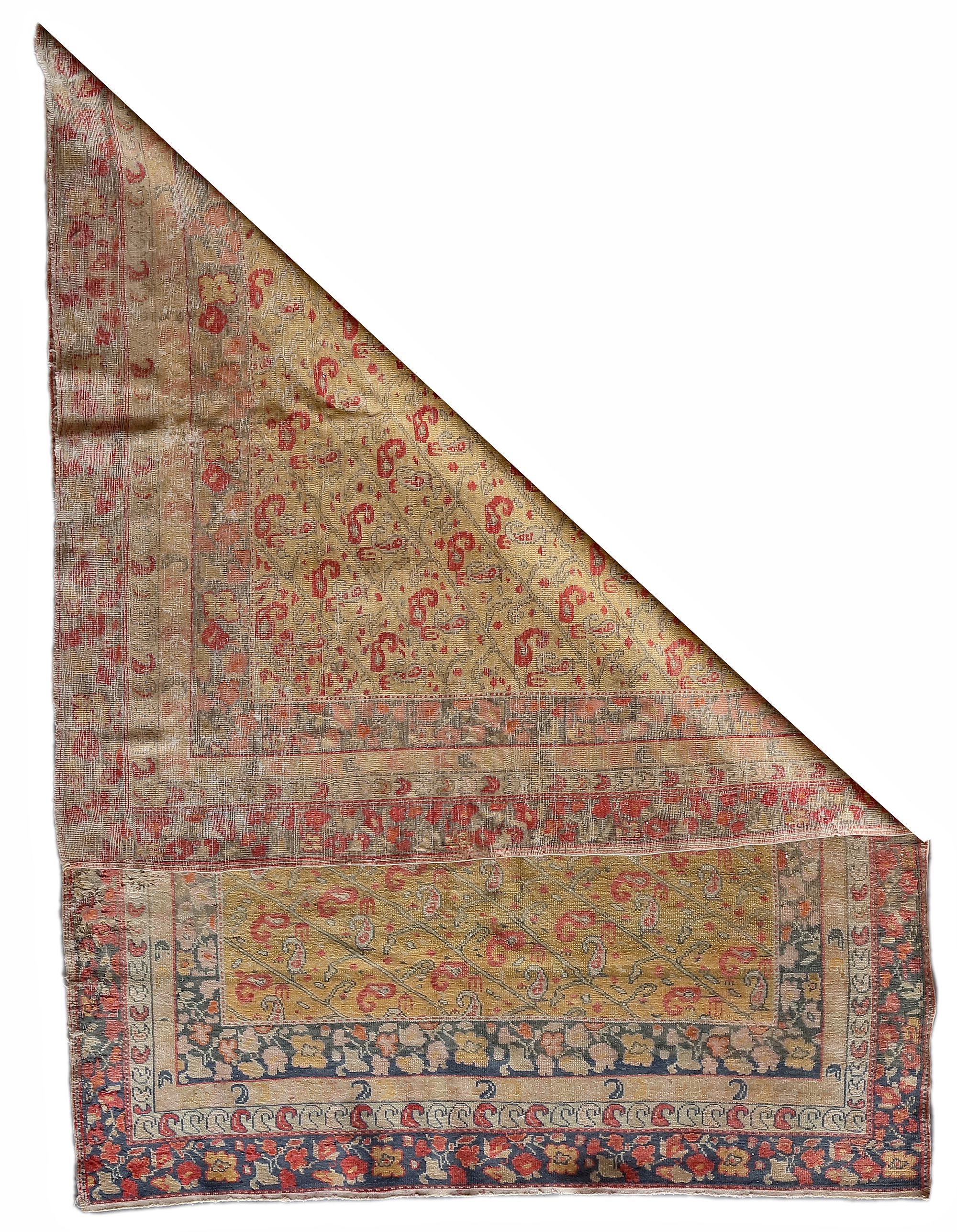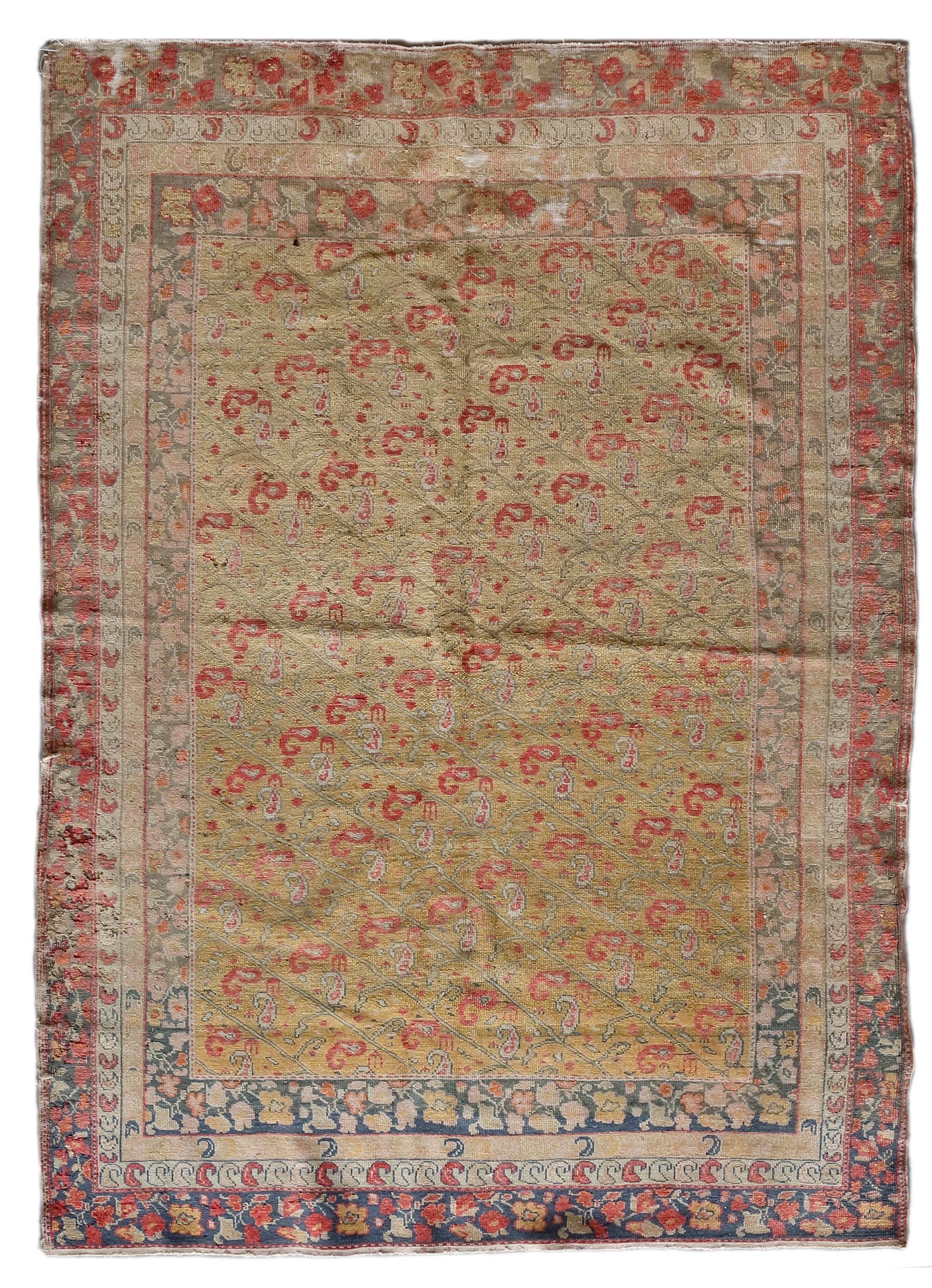 Low in pile, sides and ends damaged. 186 by 135 cm.