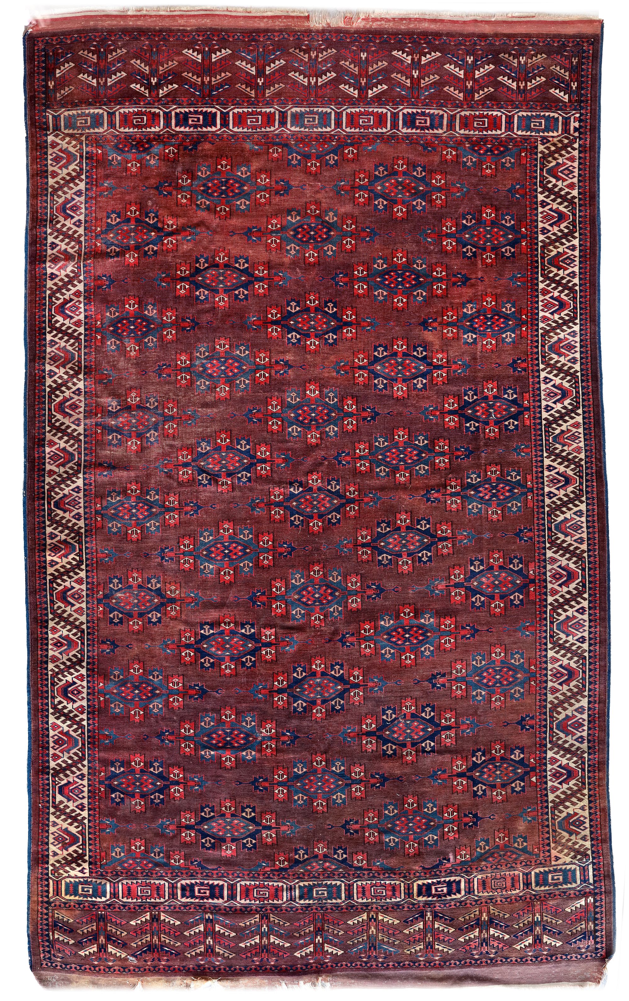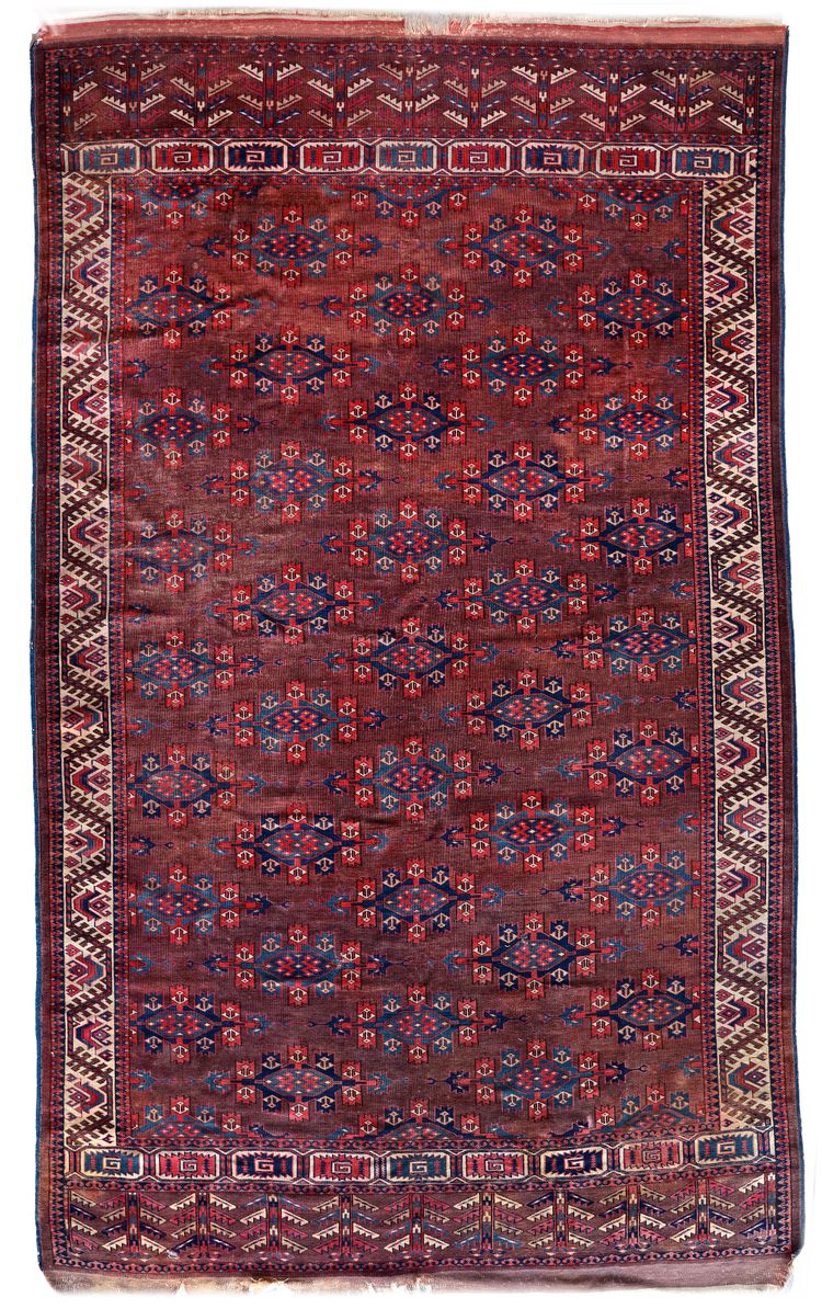 All over low, original sides, kelim ends partly damaged. 343 by 200 cm.