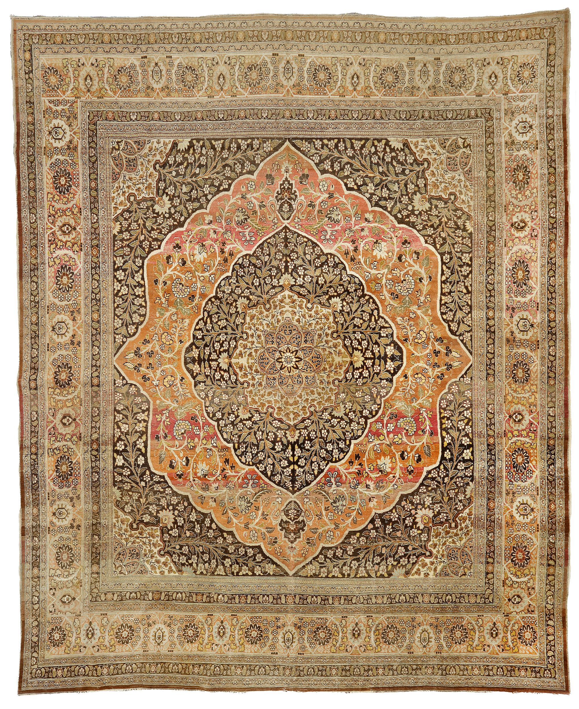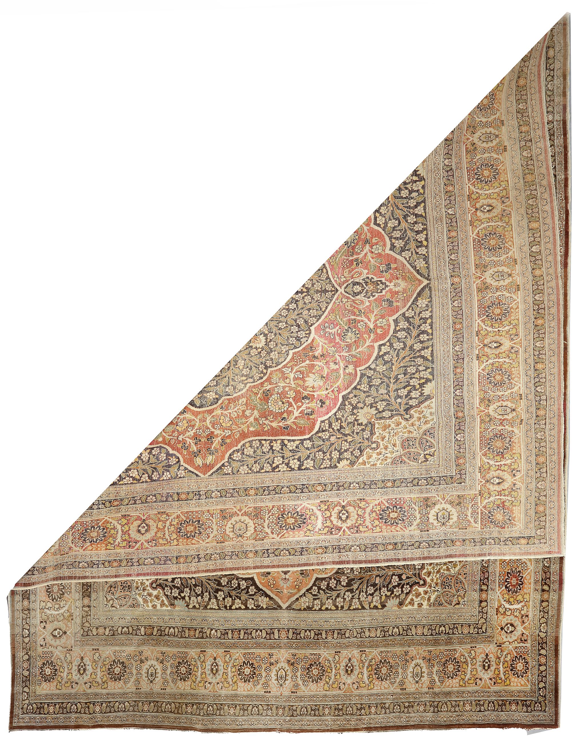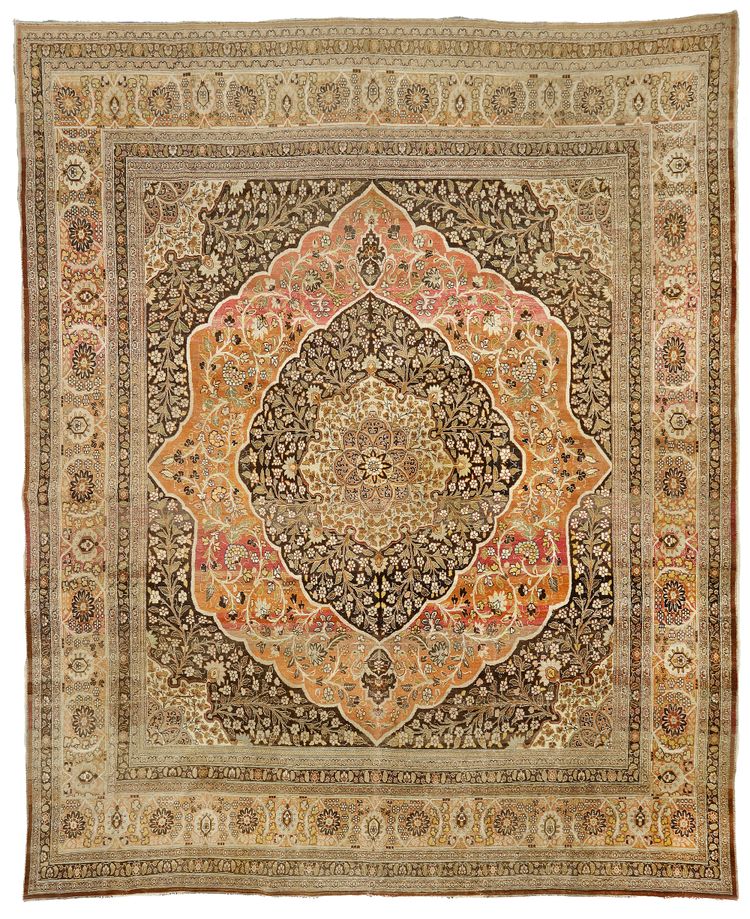 Low in pile, original sides, ends a bit damaged. 444 by 340 cm.