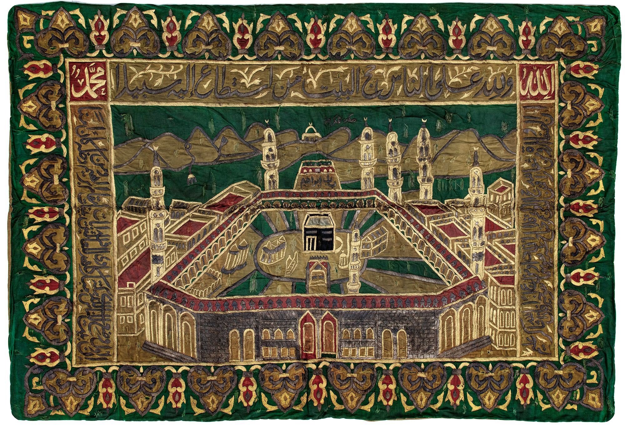 An Ottoman metal-thread brocade hanging panel, of square form, embellished in silver and gilt wires on a green cotton ground with a view of AL-Masjid AL-Haram with the Kabaa in the centre surrounded by Maqams and 6 minarets, with panels enclosing "Quran surah Al-Baqraa v. 158 and surah AL-Imraan v.96 and v.97"
