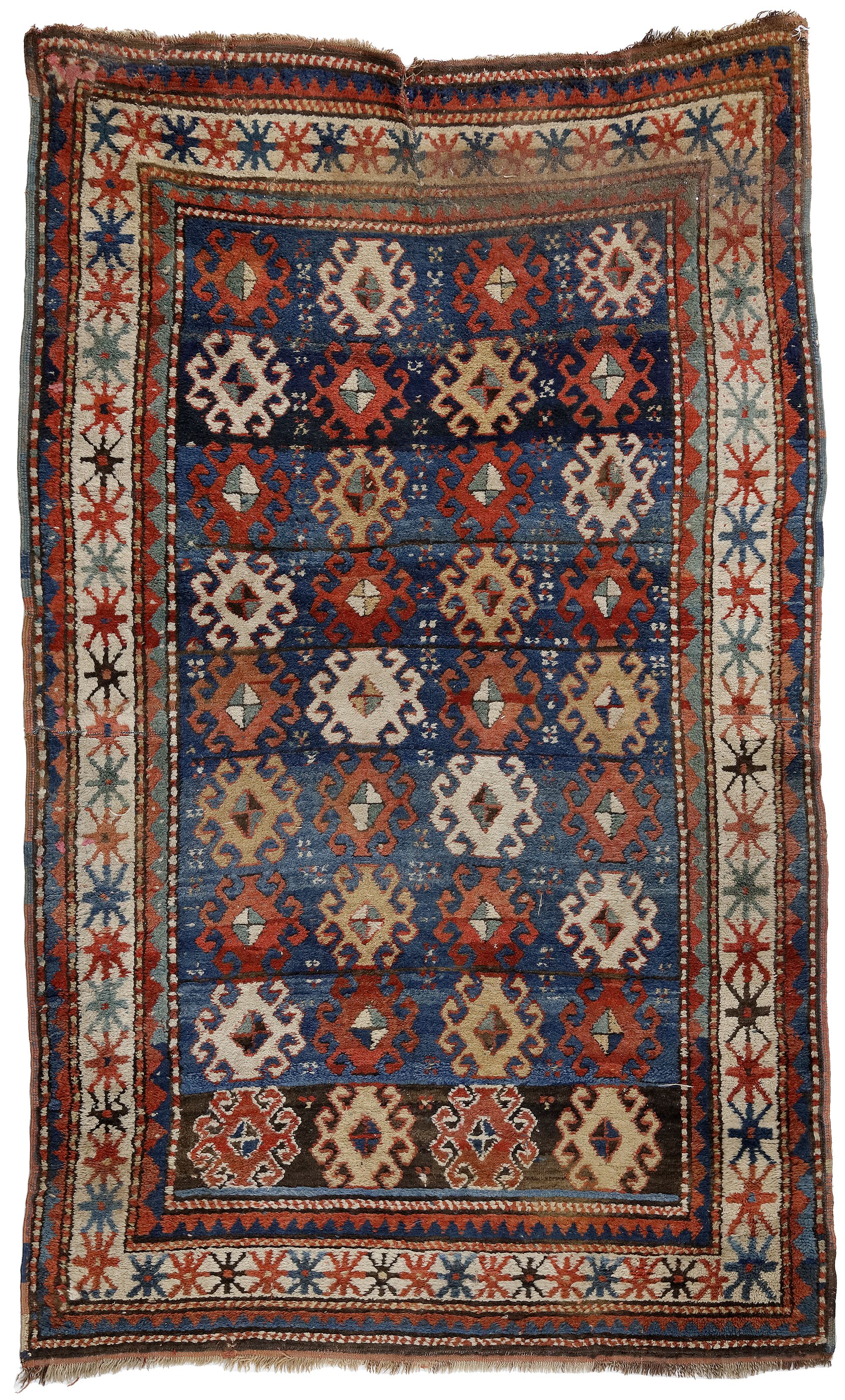 In an overall good condition, some old repairs, stains and a split under. 205 by 118 cm.