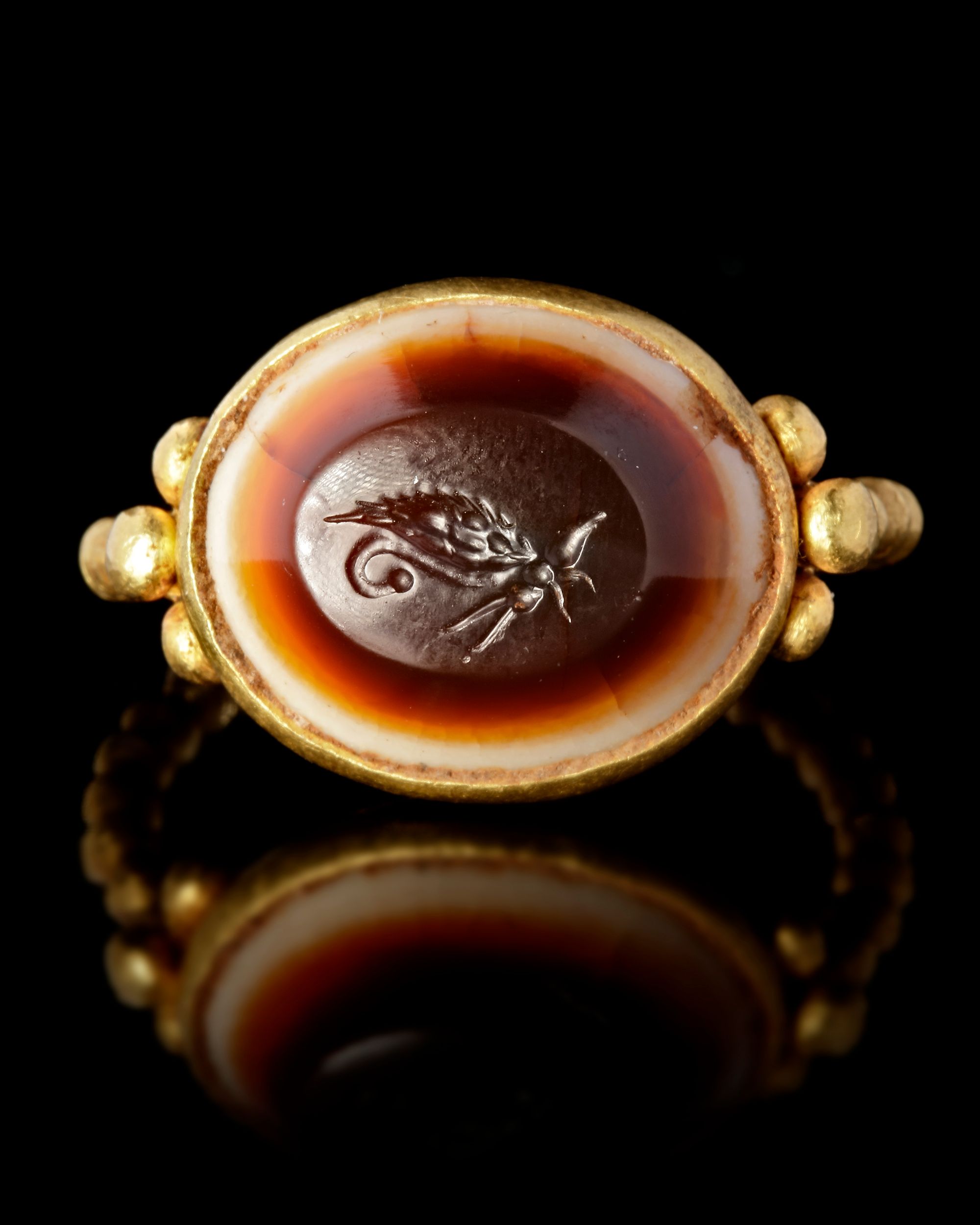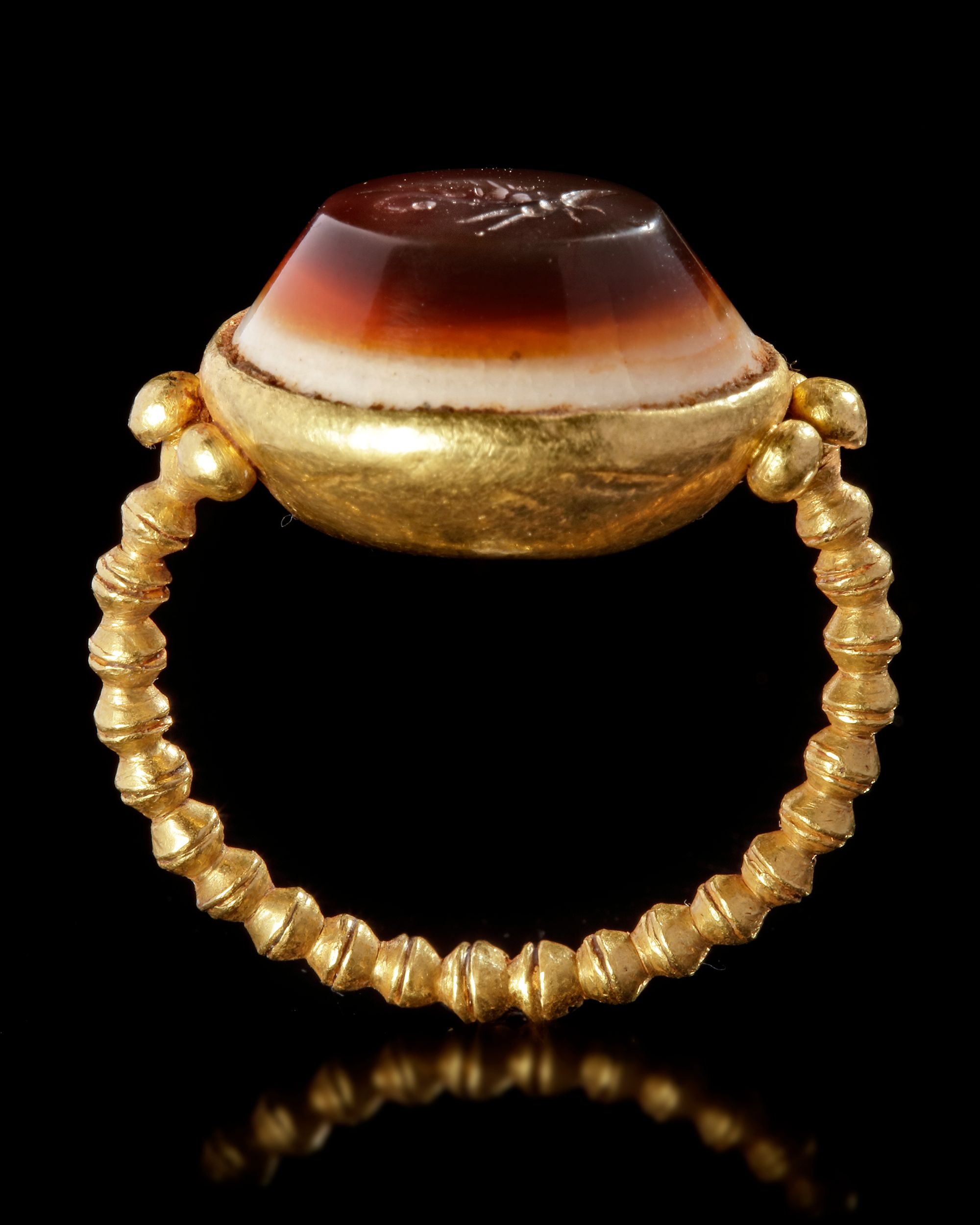 A large Roman gold ring made from a heavy beaded gold wire, attached to a large beaten sheet gold bezel which holds an agate intaglio of a butterfly which represents Psyche, the soul in antiquity.