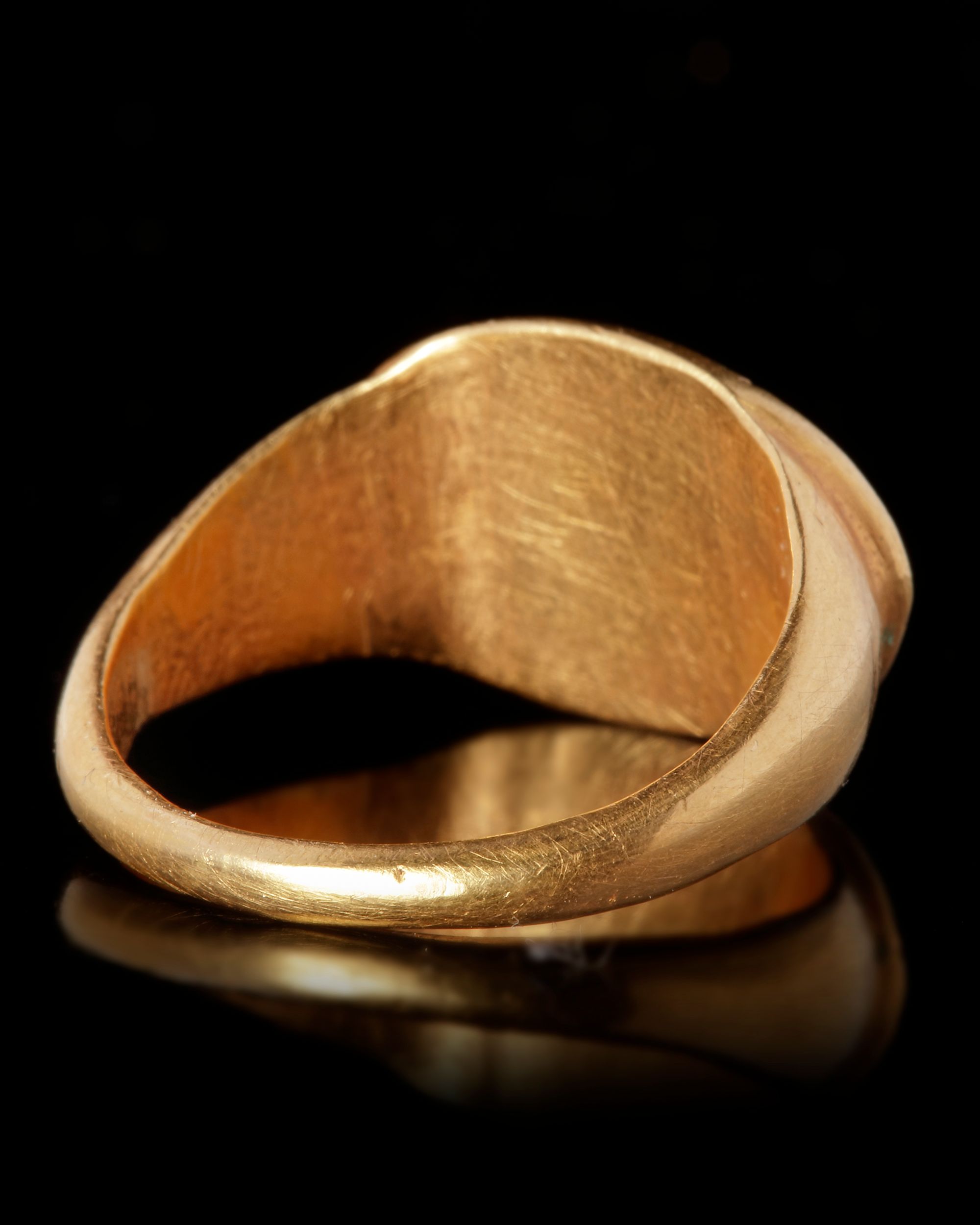 An early Hellenistic gold ring engraved with a seated figure of Nike inscribing a shield. She sits on a rock to the right and the dedication on the shield would normally refer to a victory of arms.