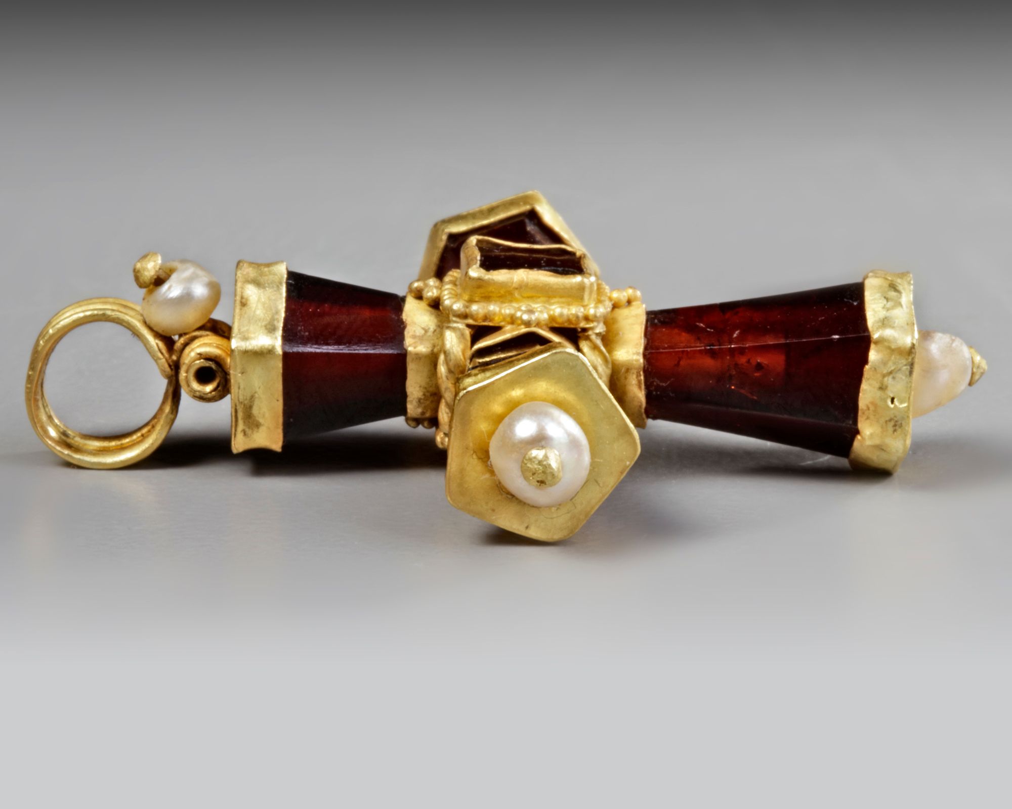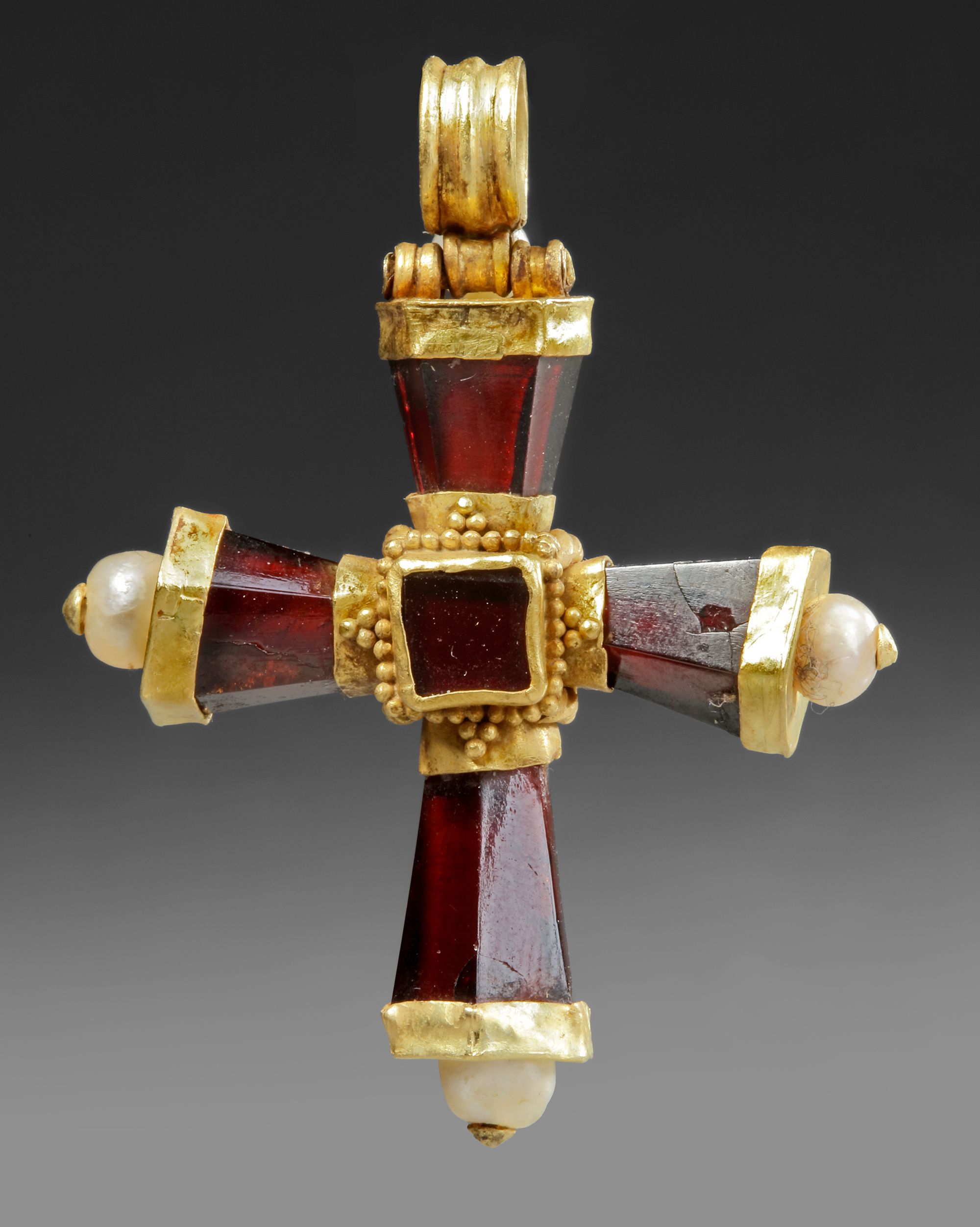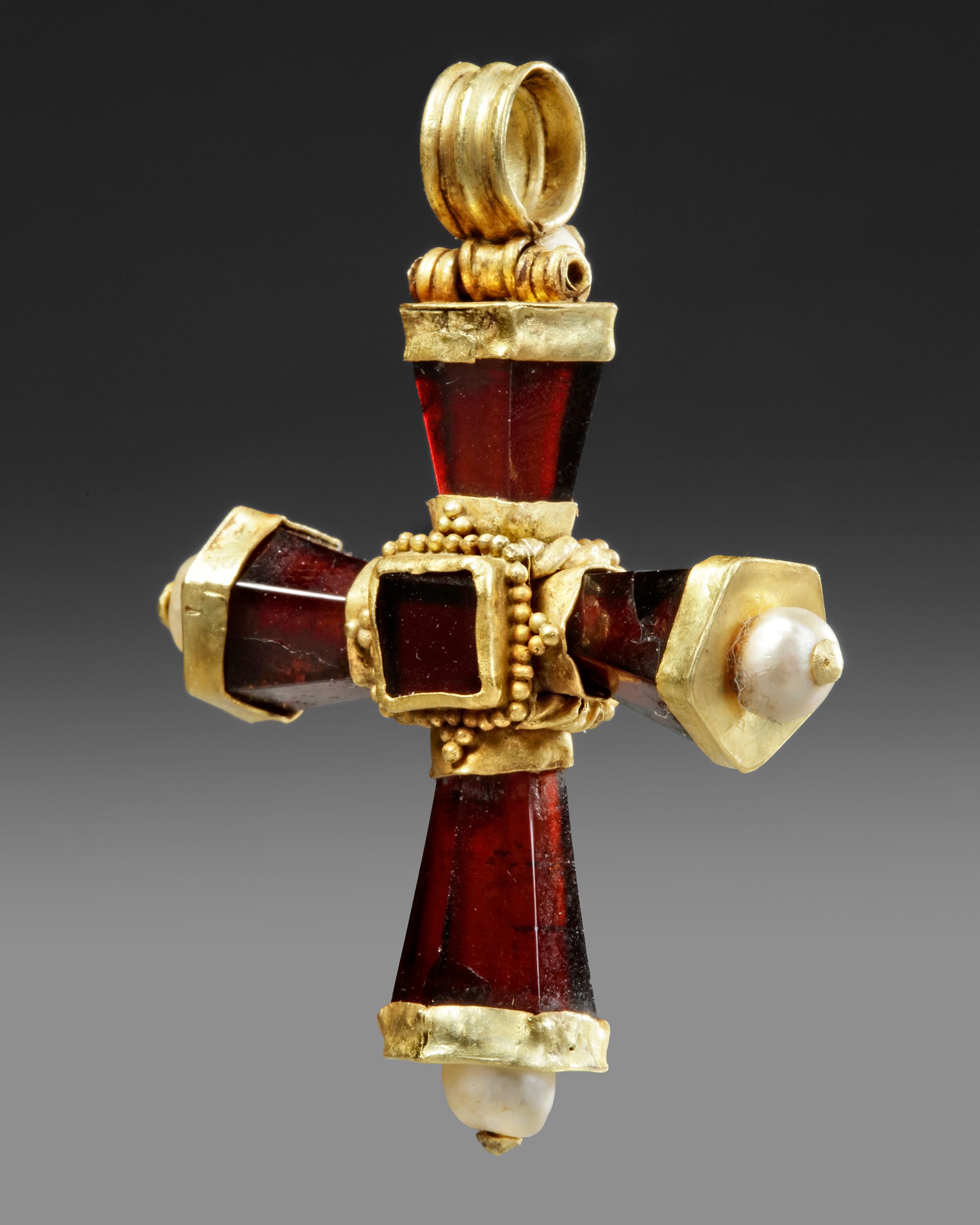 A Byzantine cross made of gold and garnet with pearl finials. The stanchions of the cross are made from faceted garnet beads which are attached to the centre by wires which pass through them. The ends of the wires pass through three pearls which act as finials, above there is a loop for attachment to a chain. At the centre of both sides square garnets decorate in intersection.