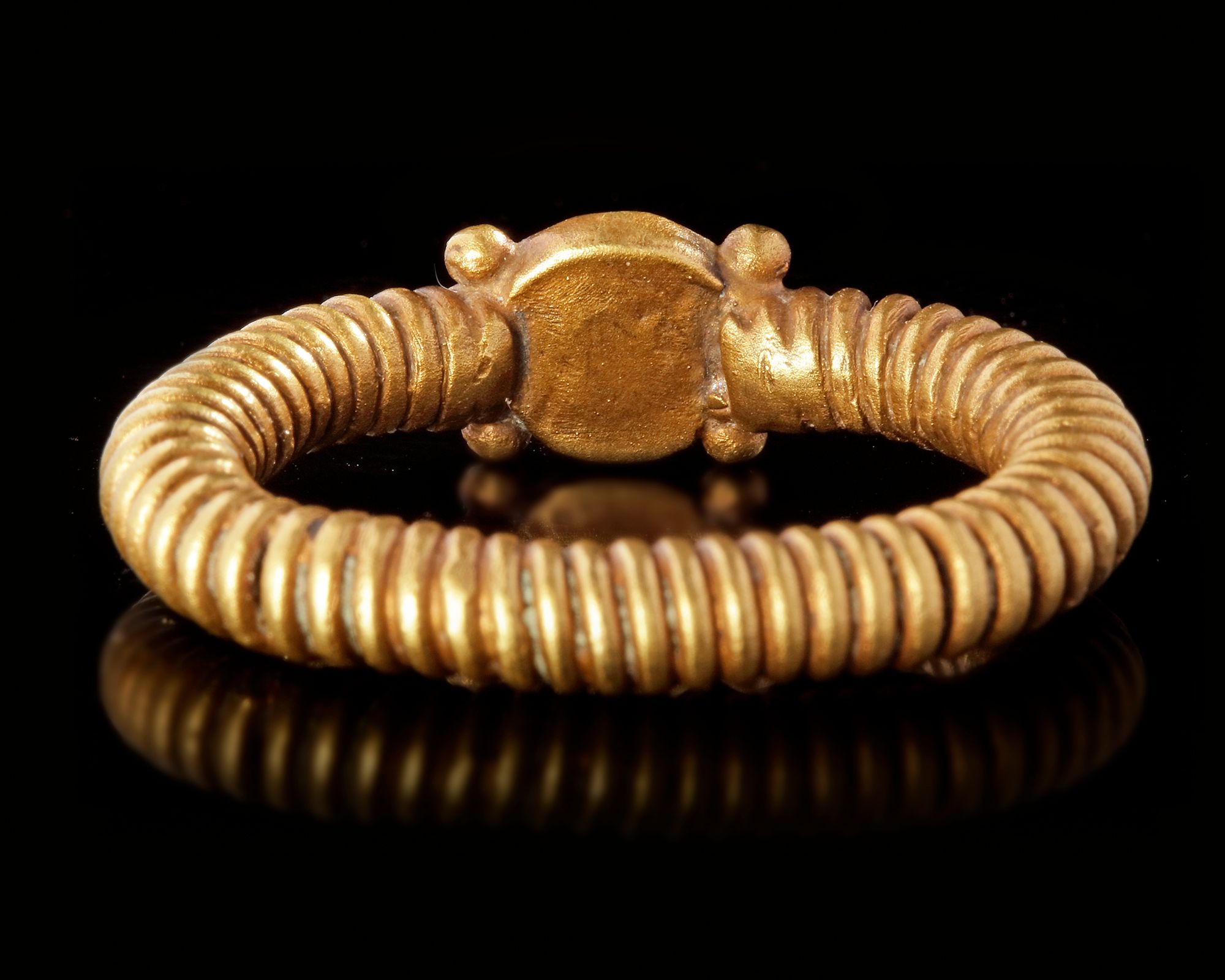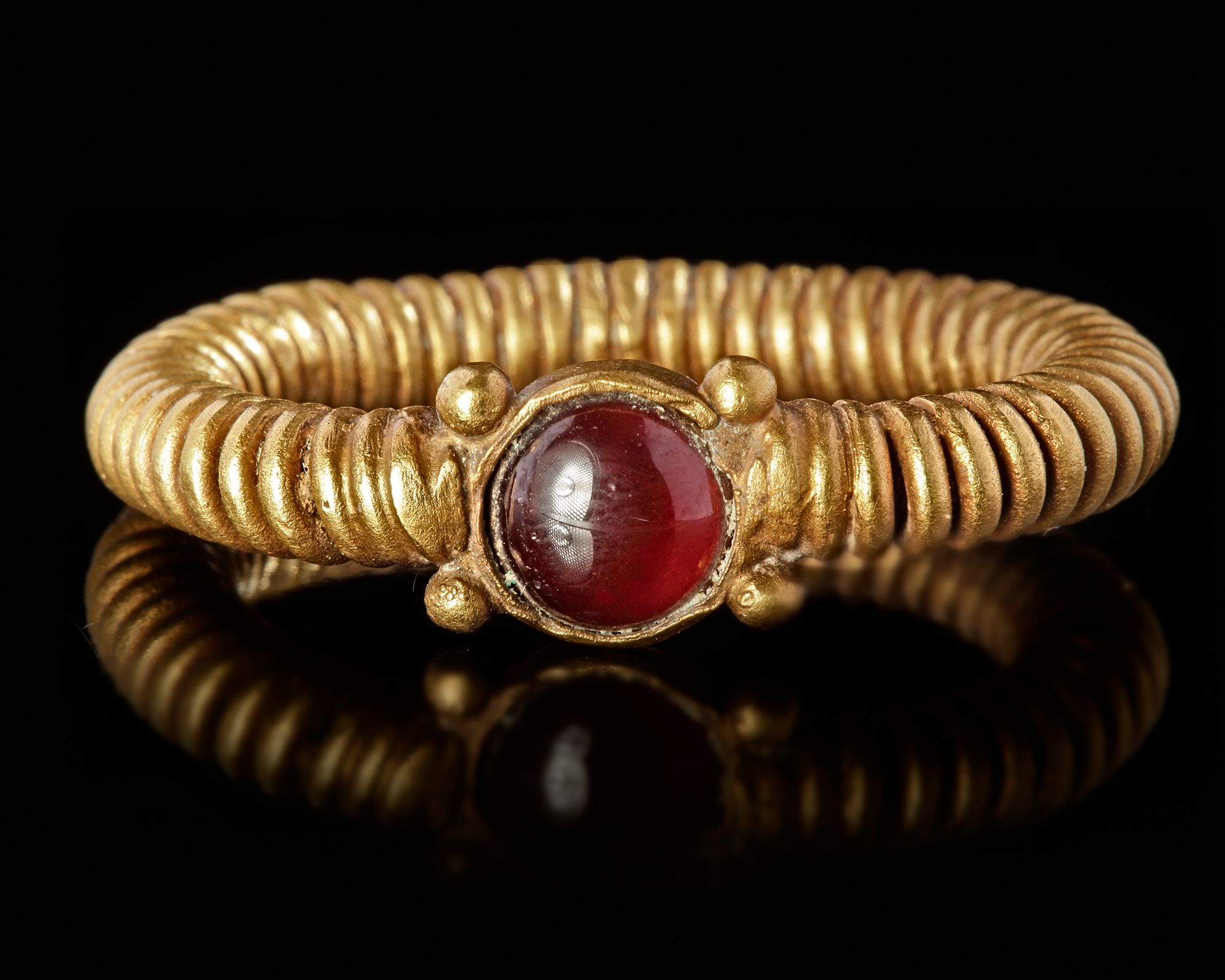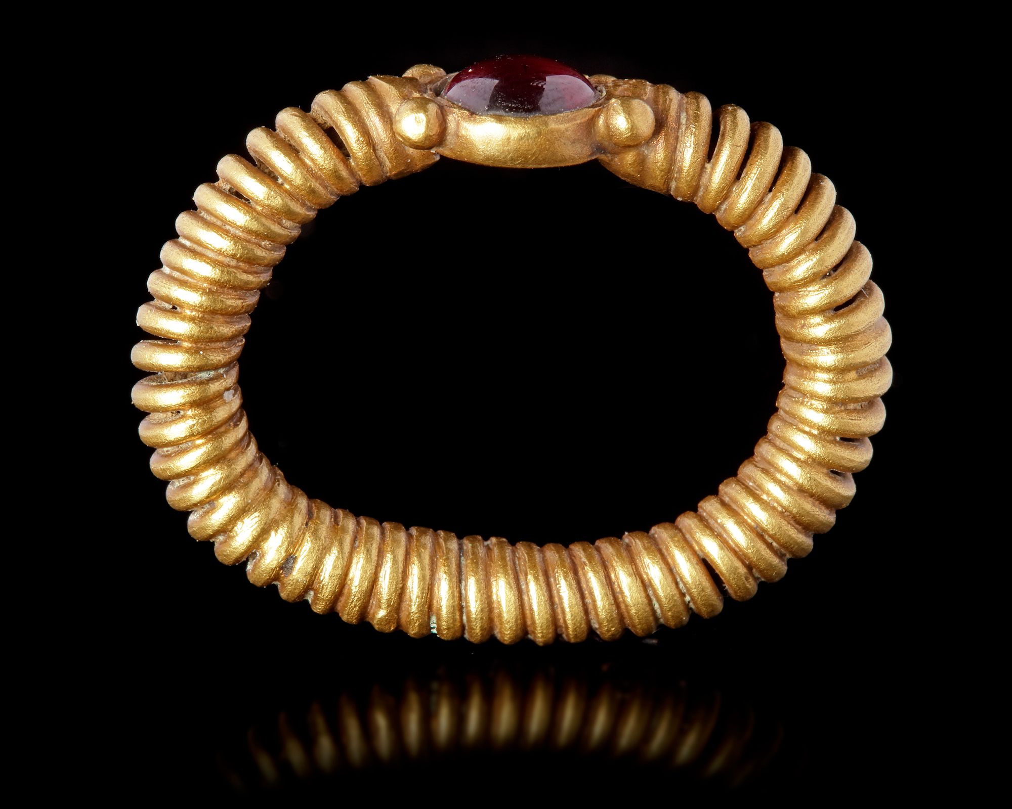 A Phoenician gold ring made from a tightly coiled wire which had been soldered to keep it rigid. The shank in this case is a small circular cell holding a cabochon garnet, flanked by four gold globules.