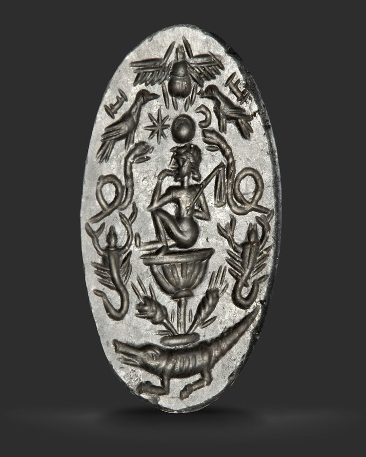 A gnostic intaglio showing Harpocrates seated on a lotus flower perched on a crocodile, surrounded by various animals. Knoubis is shown on the back under the inscription 'Pepte'.