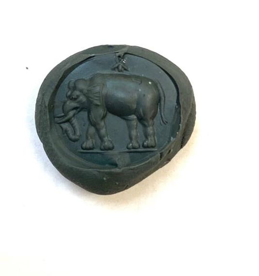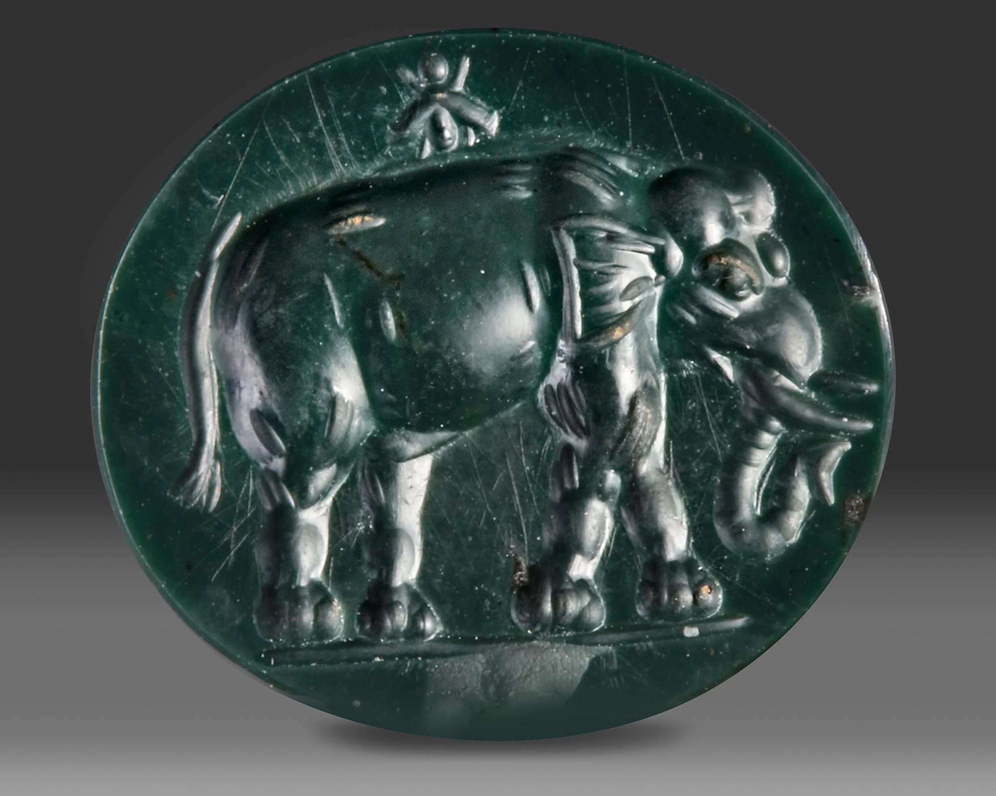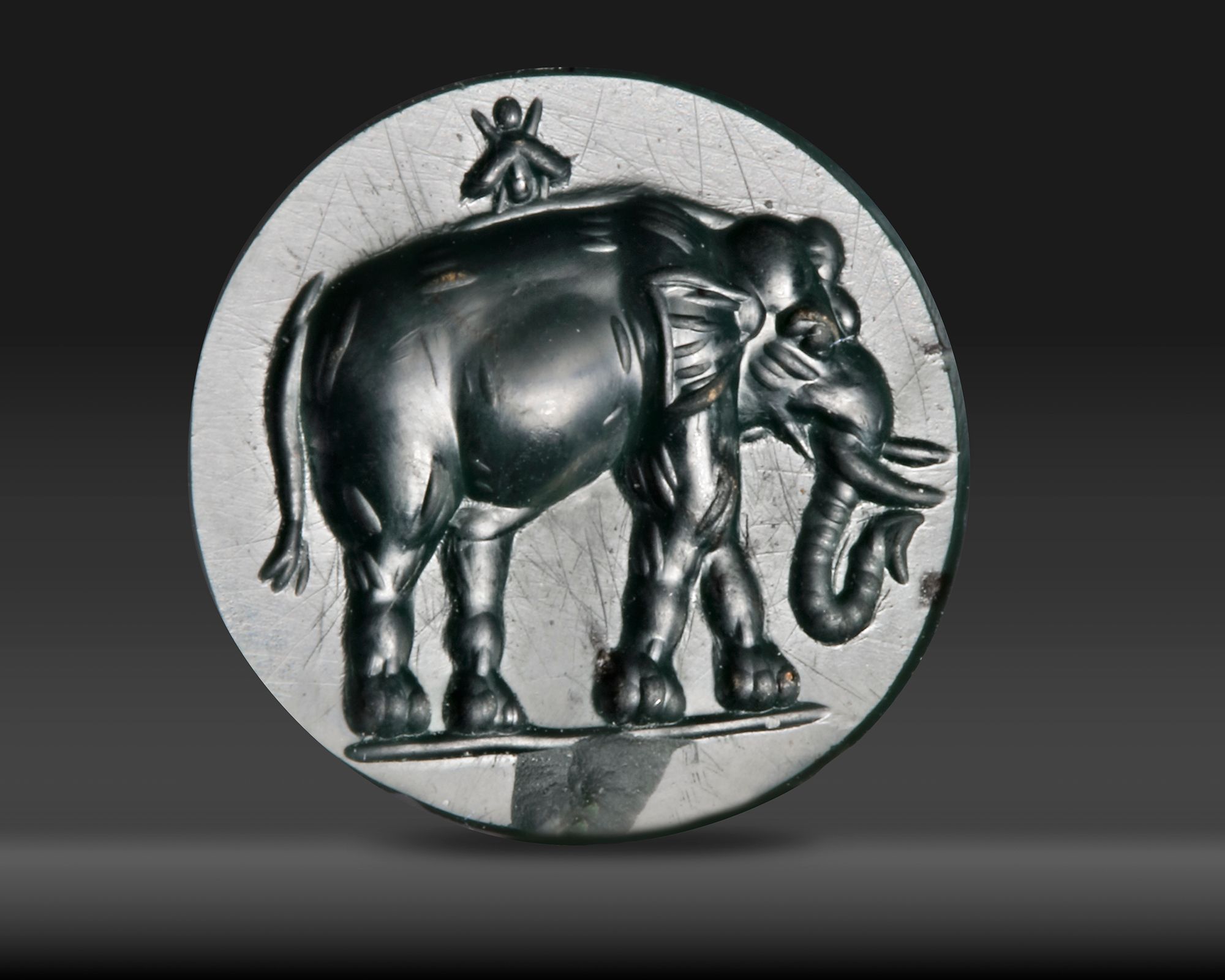 A Roman green jasper intaglio of an elephant with a bee above. This interesting type suggests that it is a depiction of an Indian war elephant with the bee above suggesting that it could be a punning type to represent the owner's name.
