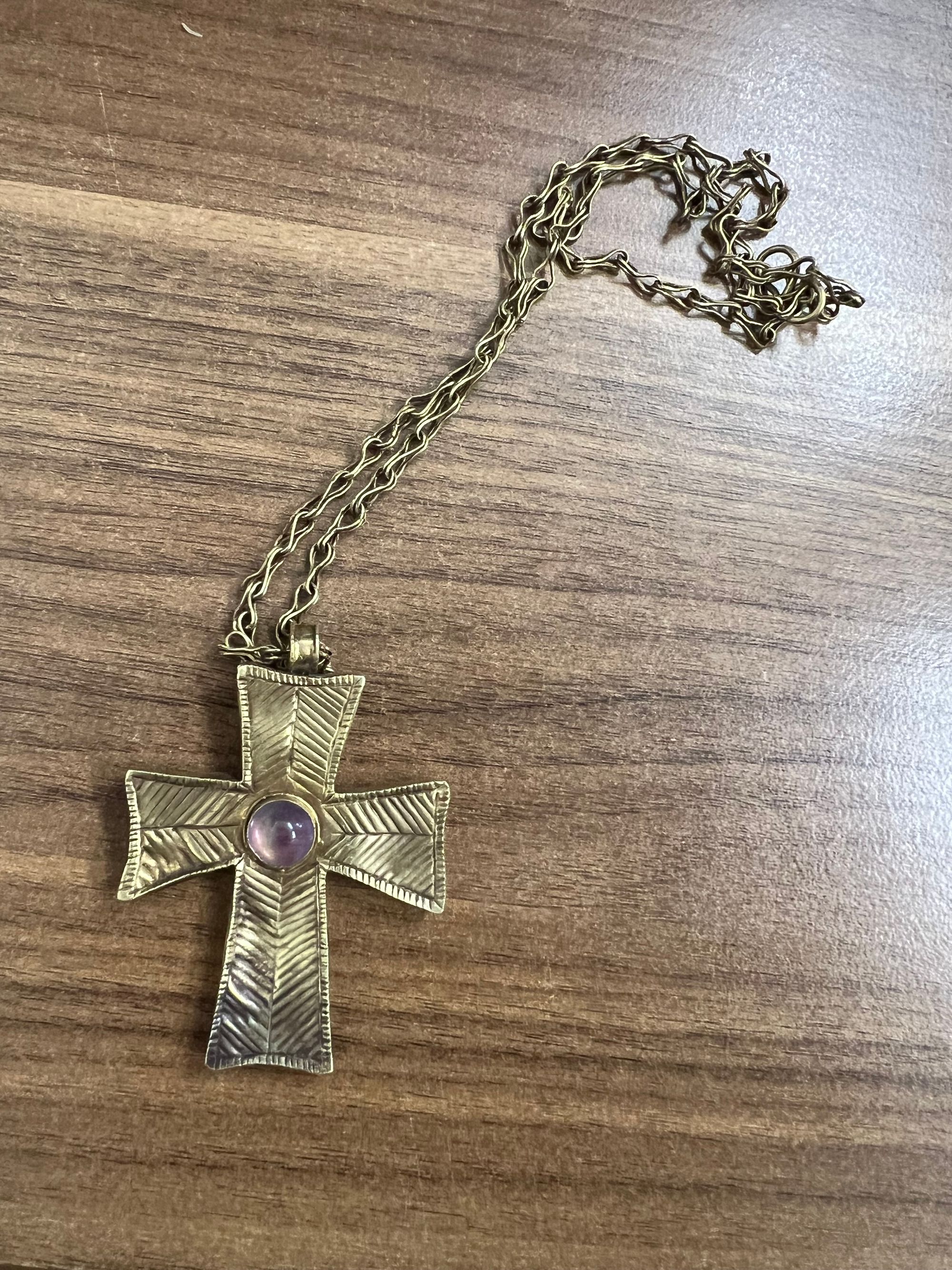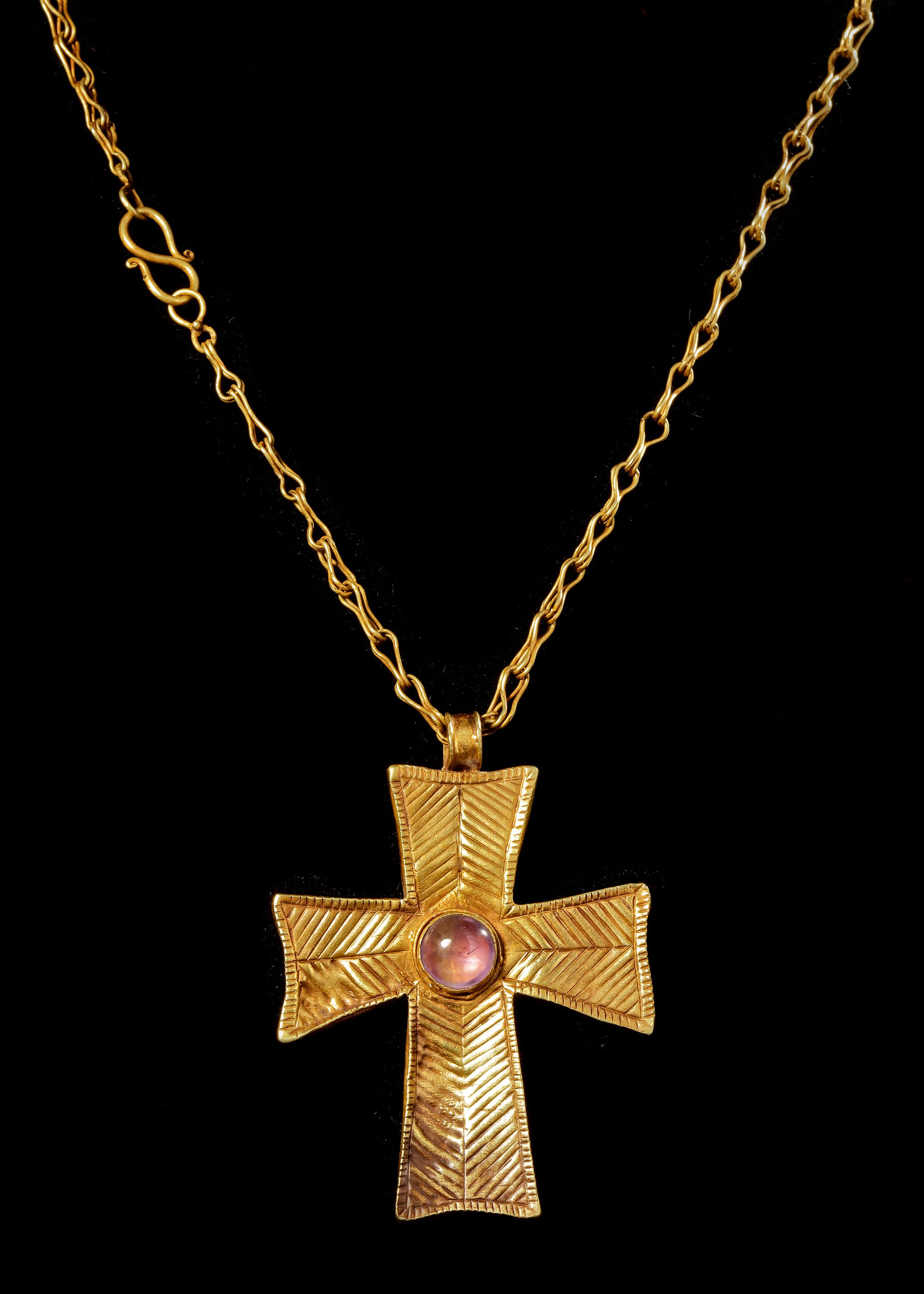 A large pectoral cross in pale gold/electrum. the cross is made from a robust sheet construction with identical striated decoration on both sides. At the centre there is a large cabochon amethyst while at the back there is a hole perhaps to have placed another inlay. The chain is made from double hooped elements terminating in a simple 'S' shaped clasp.