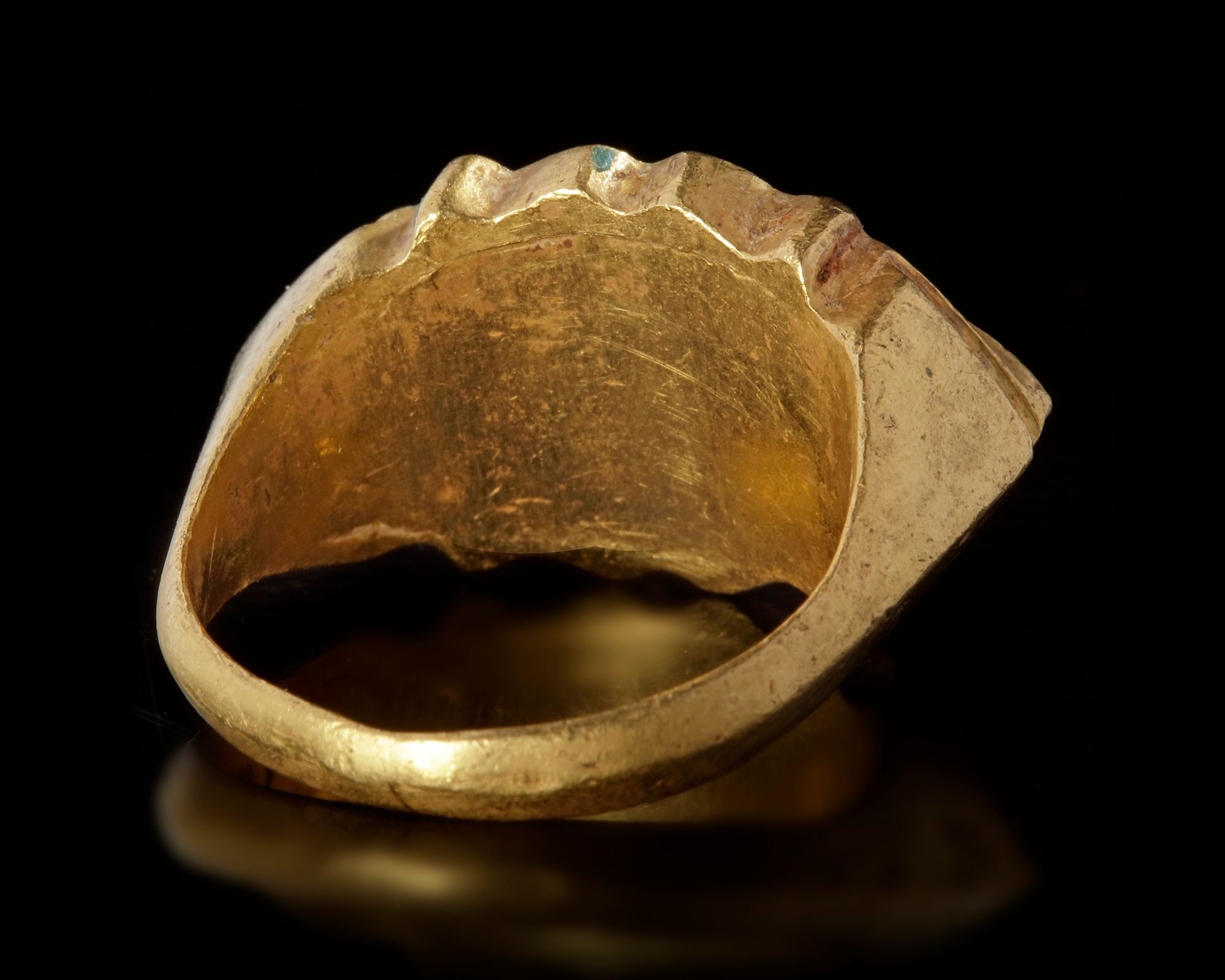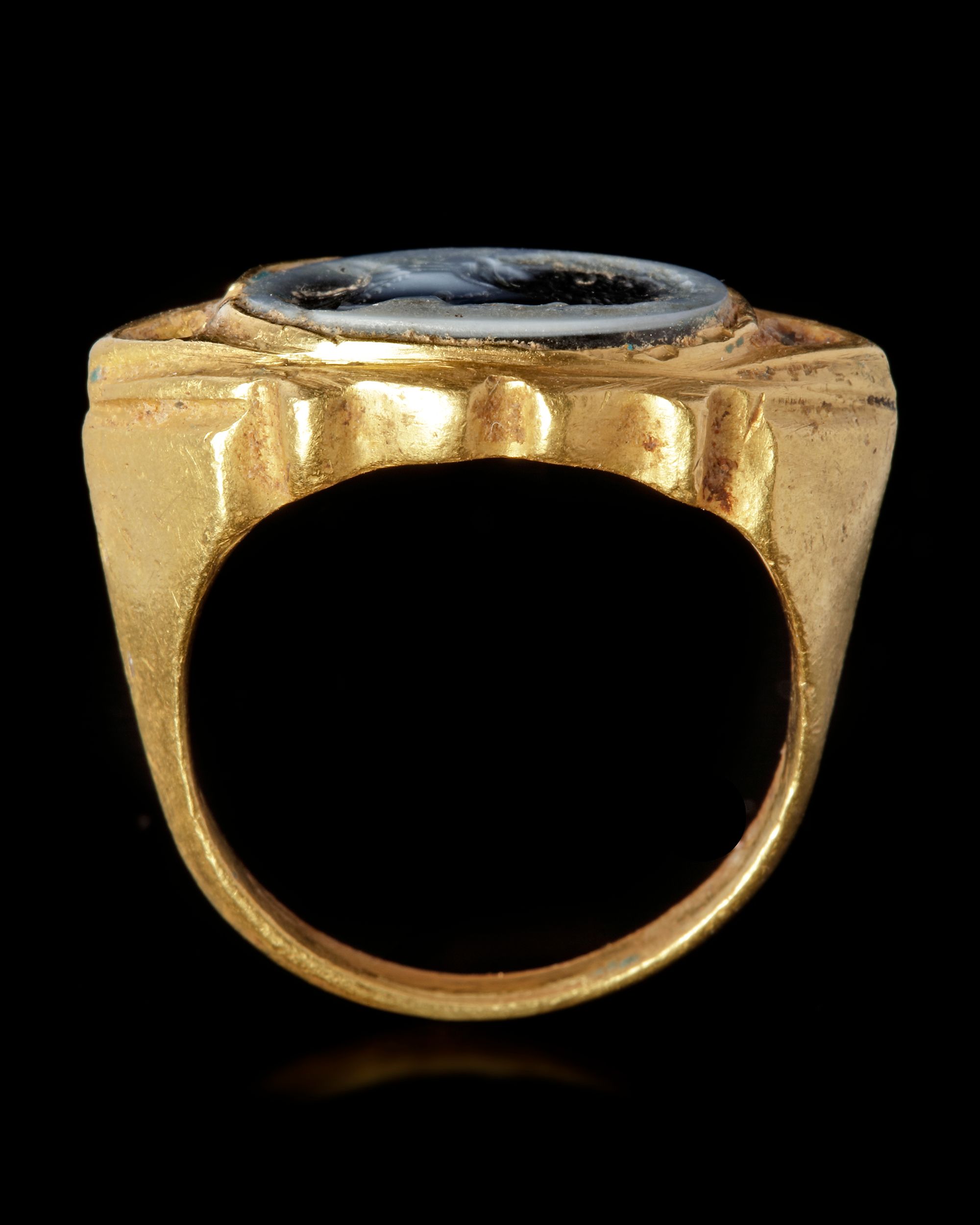 A Roman style gold ring with a nicole intaglio of a 5th.c.A.D. Empress. Gold and nicolo. Roman style 23 by 21 mm. Weight: 10.5 g.