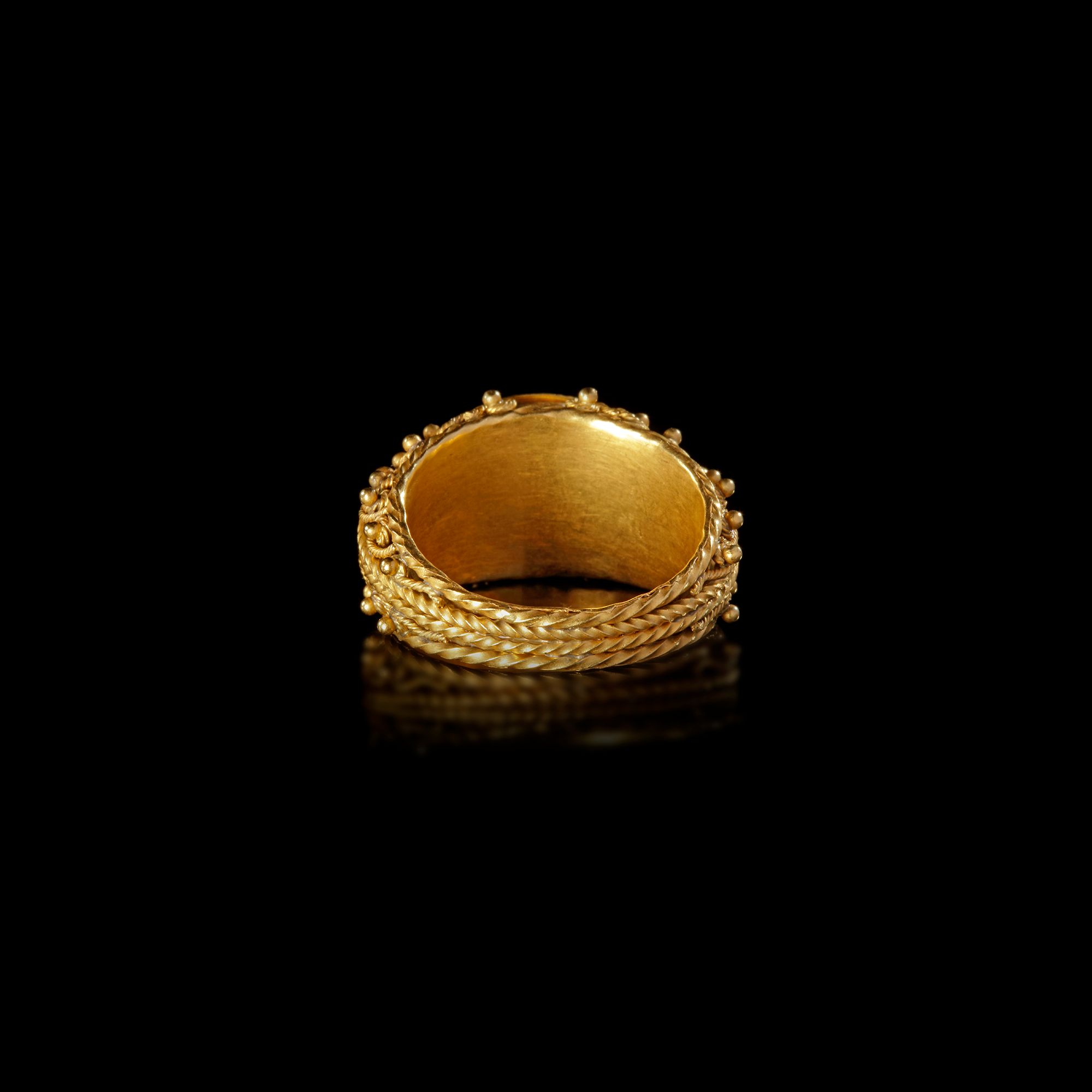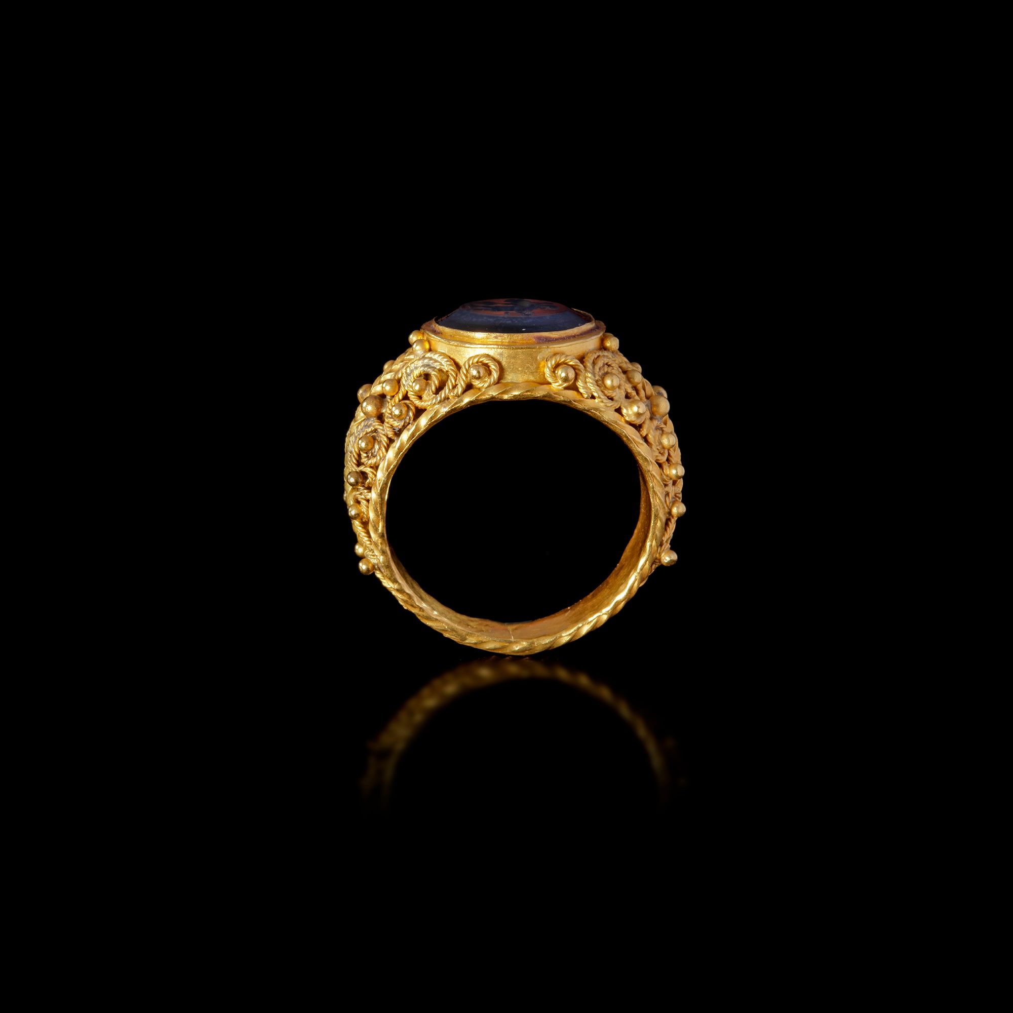 A Roman black agate intaglio showing Silvanus in a gold ring made of elaborate filigreed wires on a band. The ring is possibly of recent manufacture.