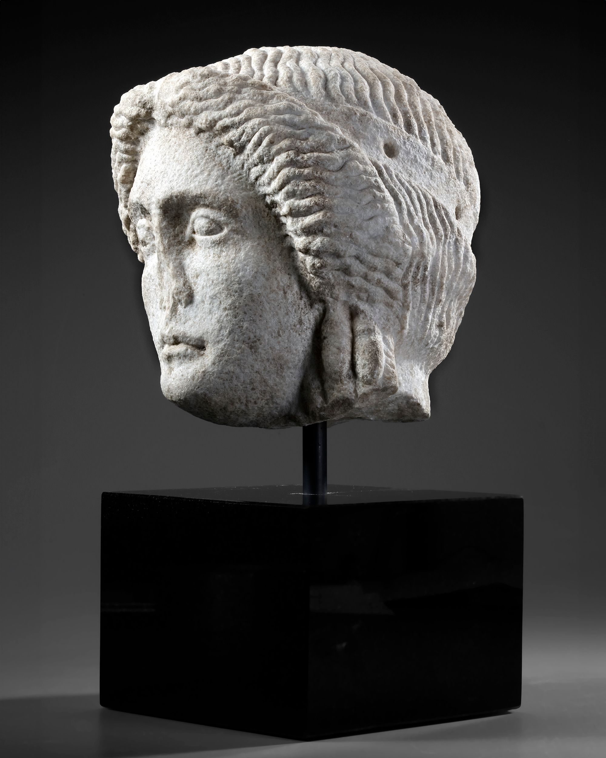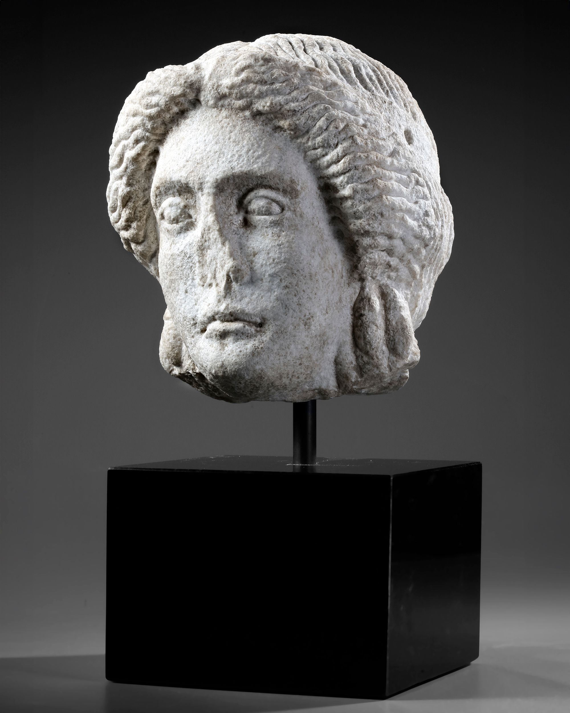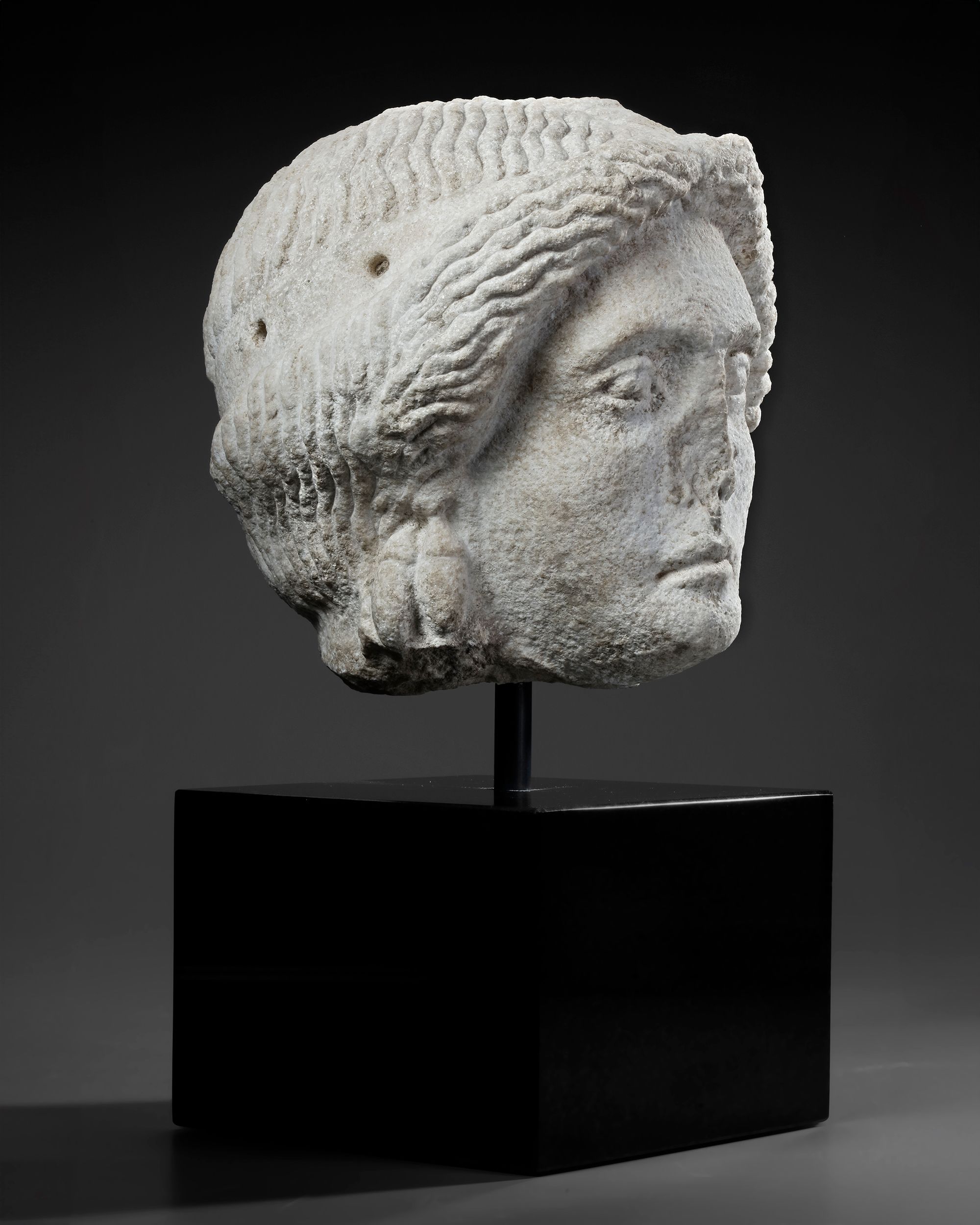An archaistic head of Apollo in white marble. This head is almost certainly from a large herm, archaising figures were popular in the Roman period, and this head, probably set on a rectangular herm shaft, would have been a suitable garden ornament.