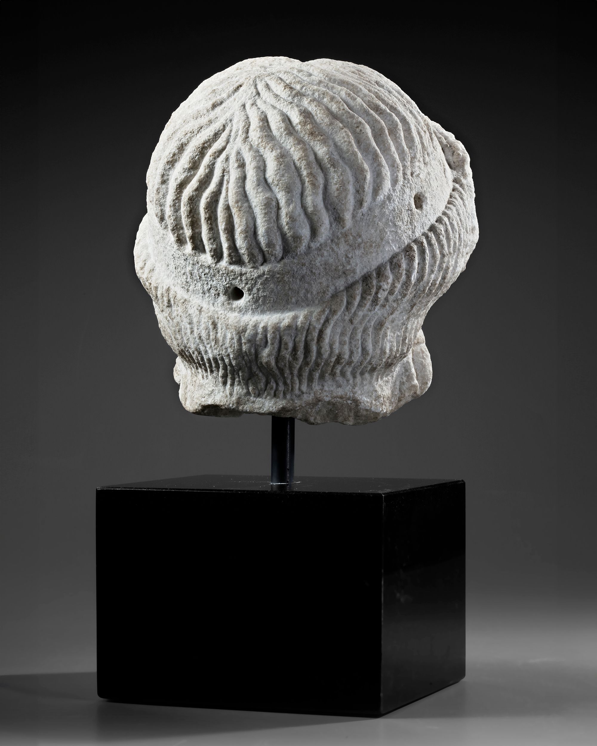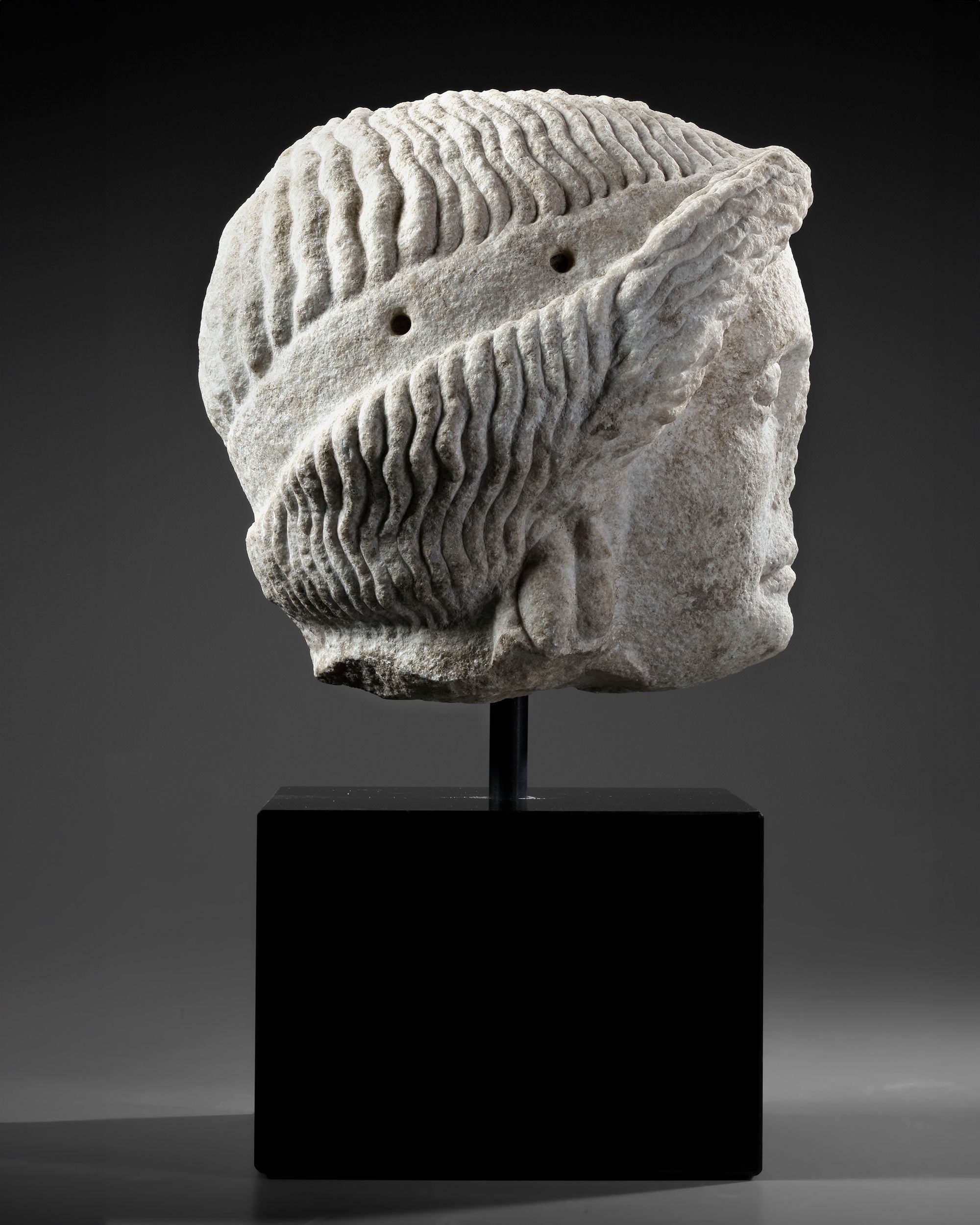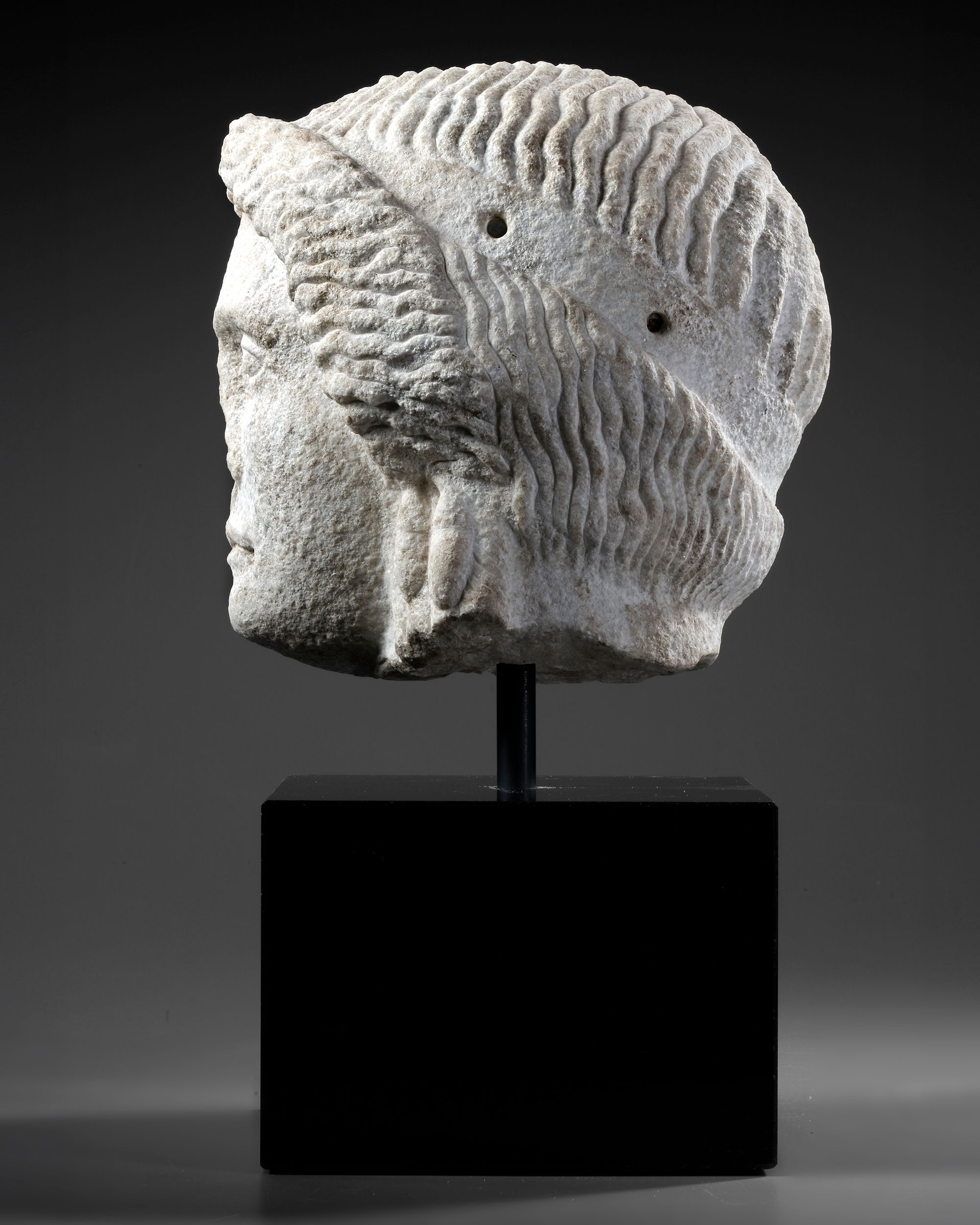 An archaistic head of Apollo in white marble. This head is almost certainly from a large herm, archaising figures were popular in the Roman period, and this head, probably set on a rectangular herm shaft, would have been a suitable garden ornament.