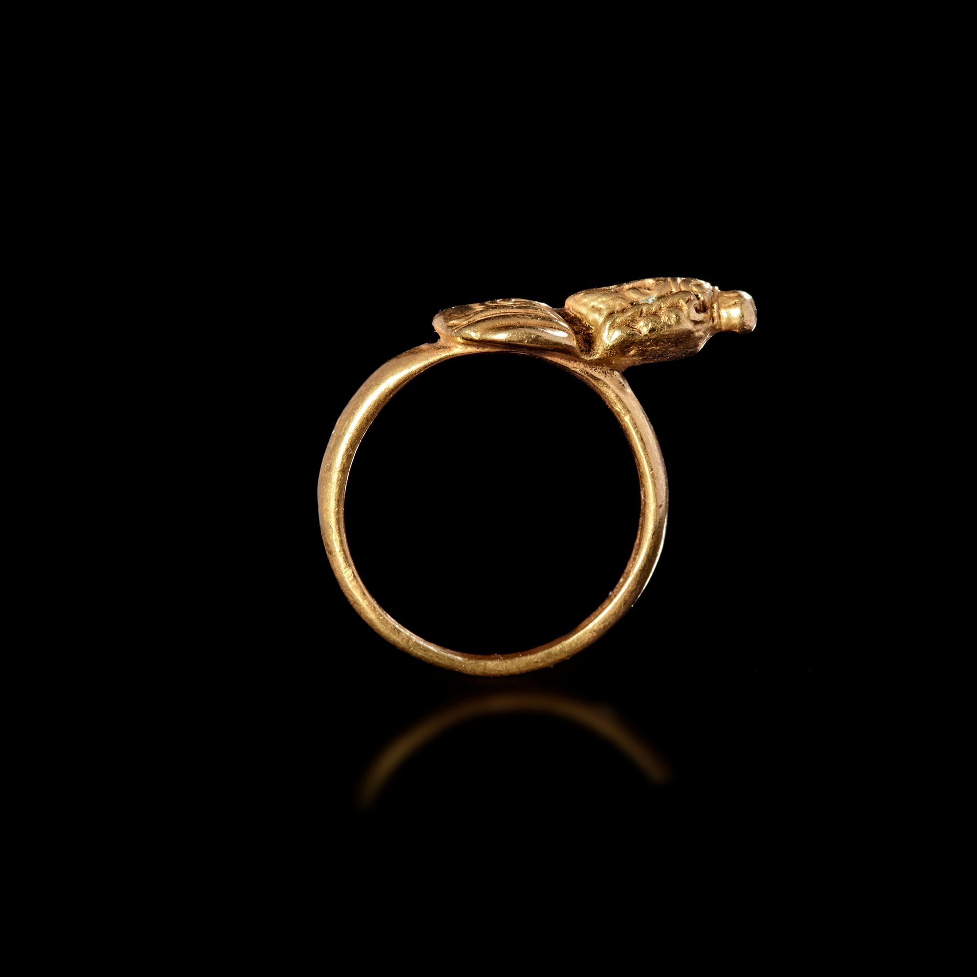 An attractive 'Serapis' ring with a tapering plain shank attached to a bust of Serapis with the modus on his head. This type of ring made its appearance in late Hellenistic times and is particularly popular with the bust of Serapis.