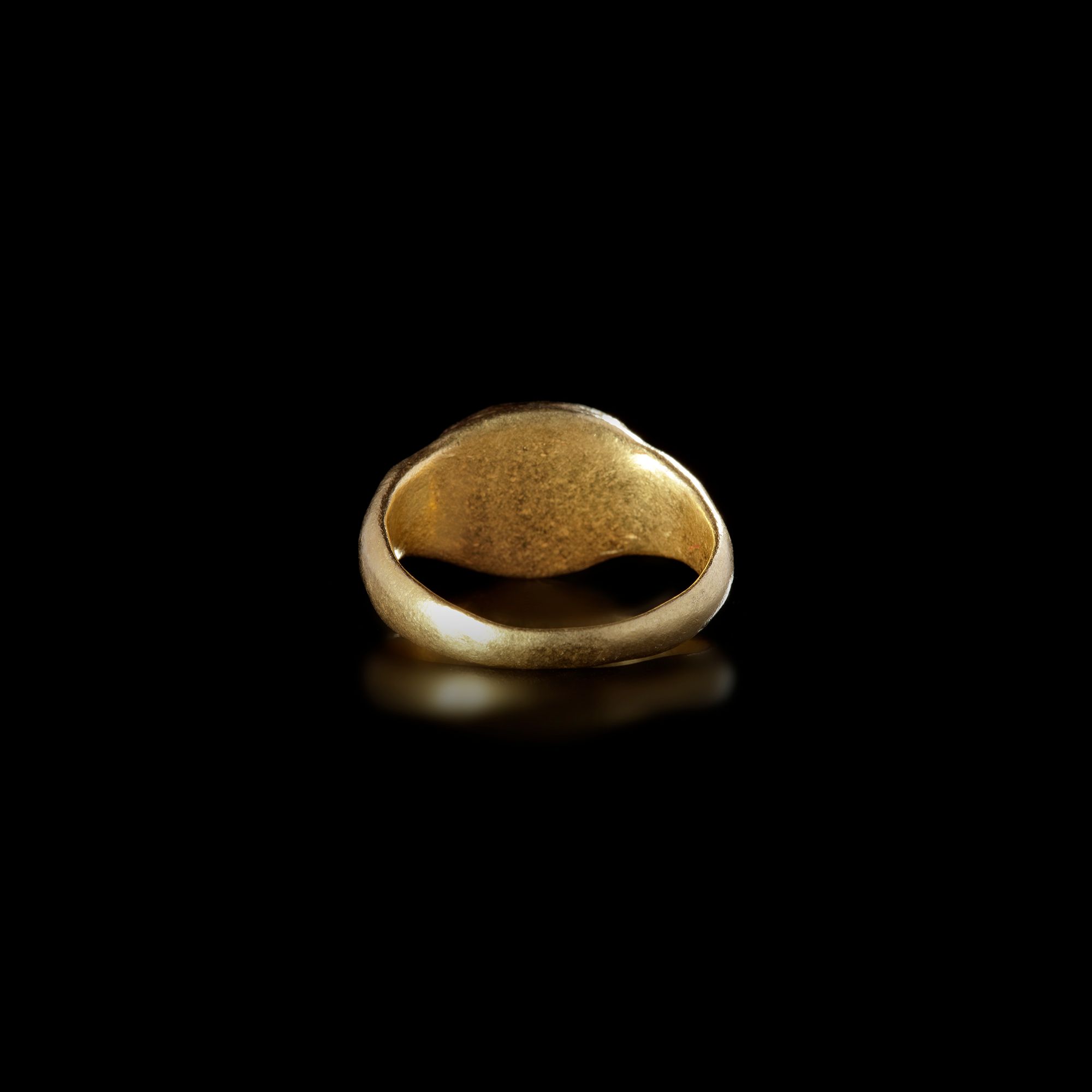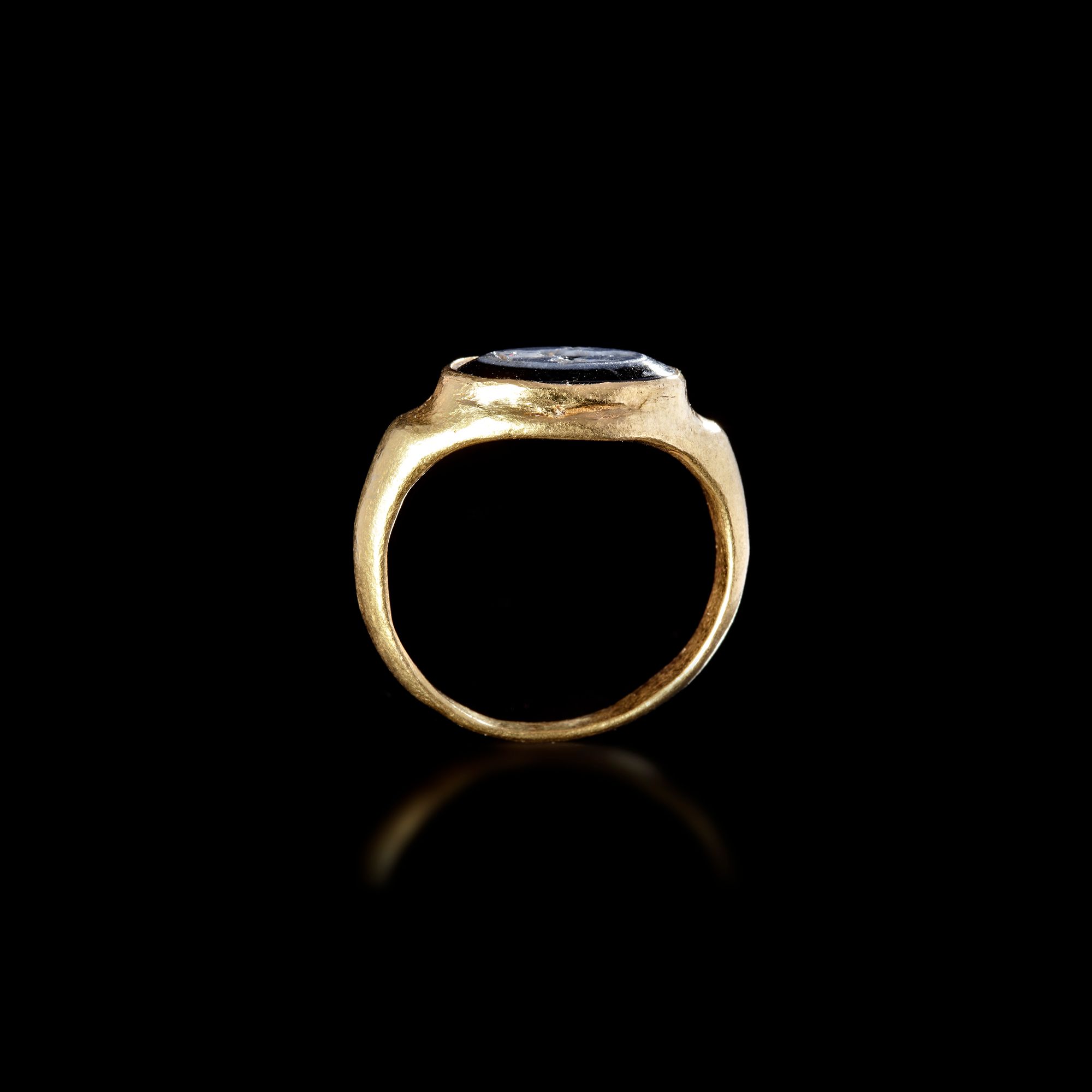 A good sized Roman gold ring set with an intaglio of Mercury in nicolo agate. The ring has been fashioned from one piece of gold.