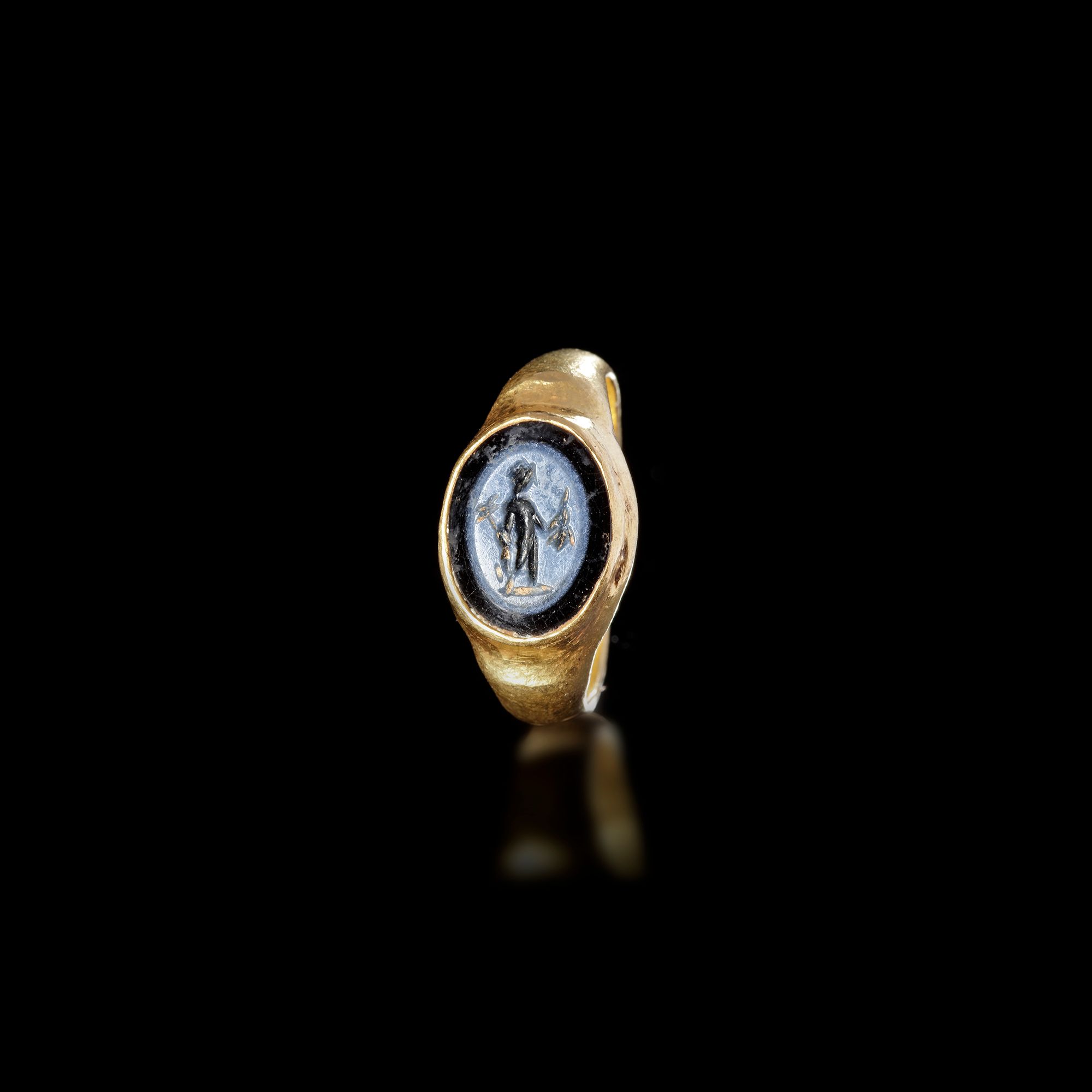 A ROMAN GOLD RING WITH A NICOLO INTAGLIO OF MERCURY, 1ST-2ND CENTURY AD