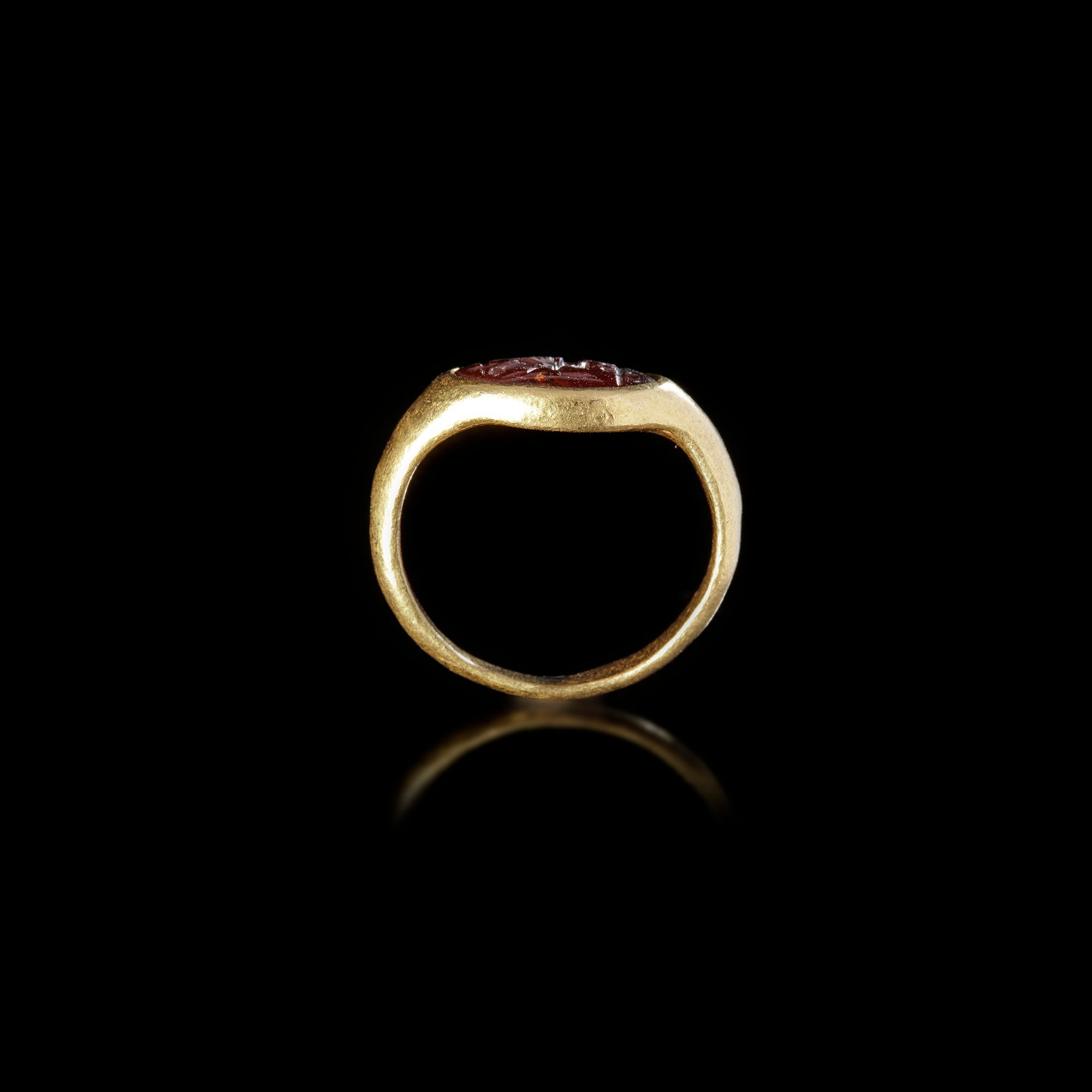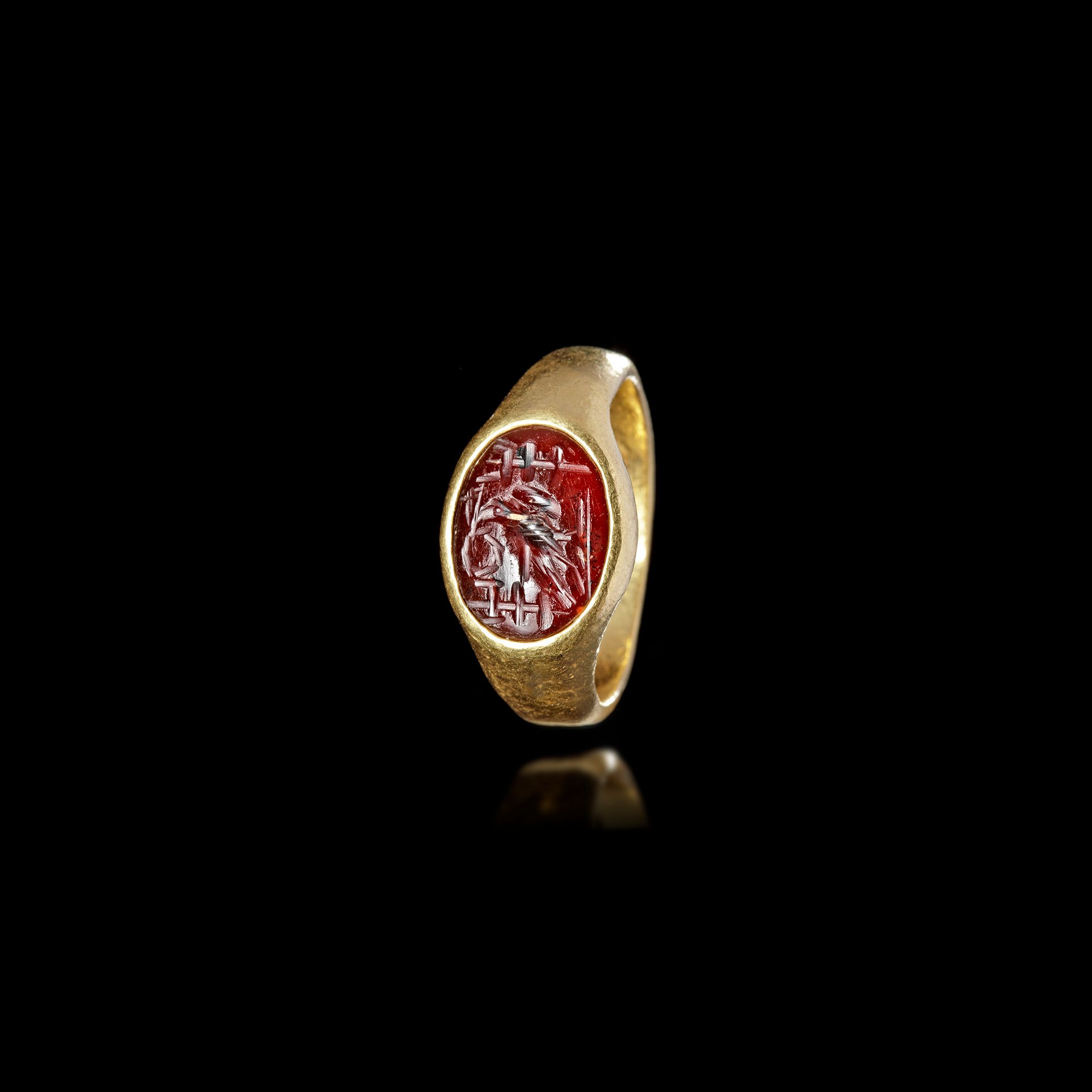A Roman gold ring with a carnelian intaglio showing and eagle with a wreath in its beak flanked by two legionary standards. Such a ring, with a military subject, would almost certainly have been worn by a high ranking soldier in the Roman army.