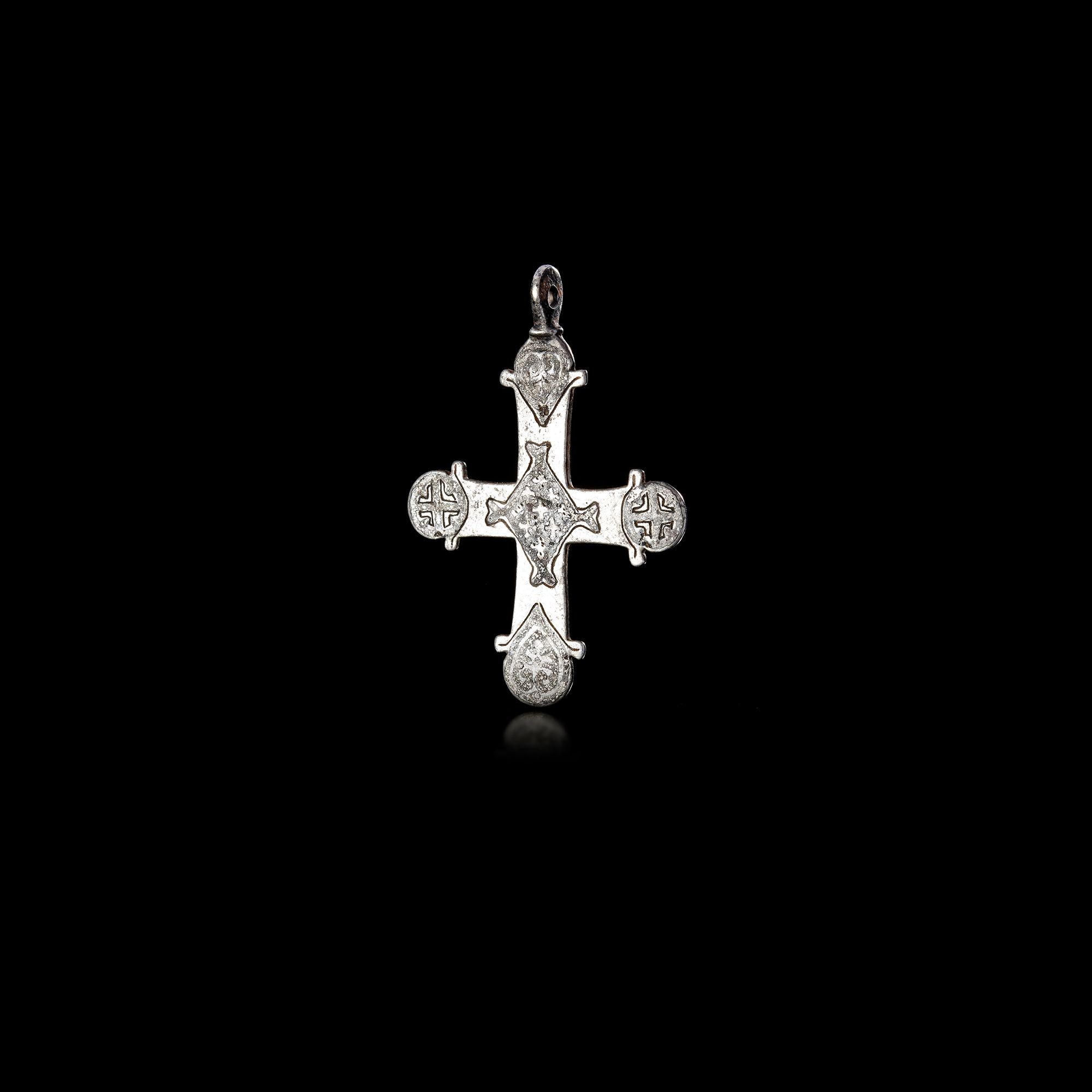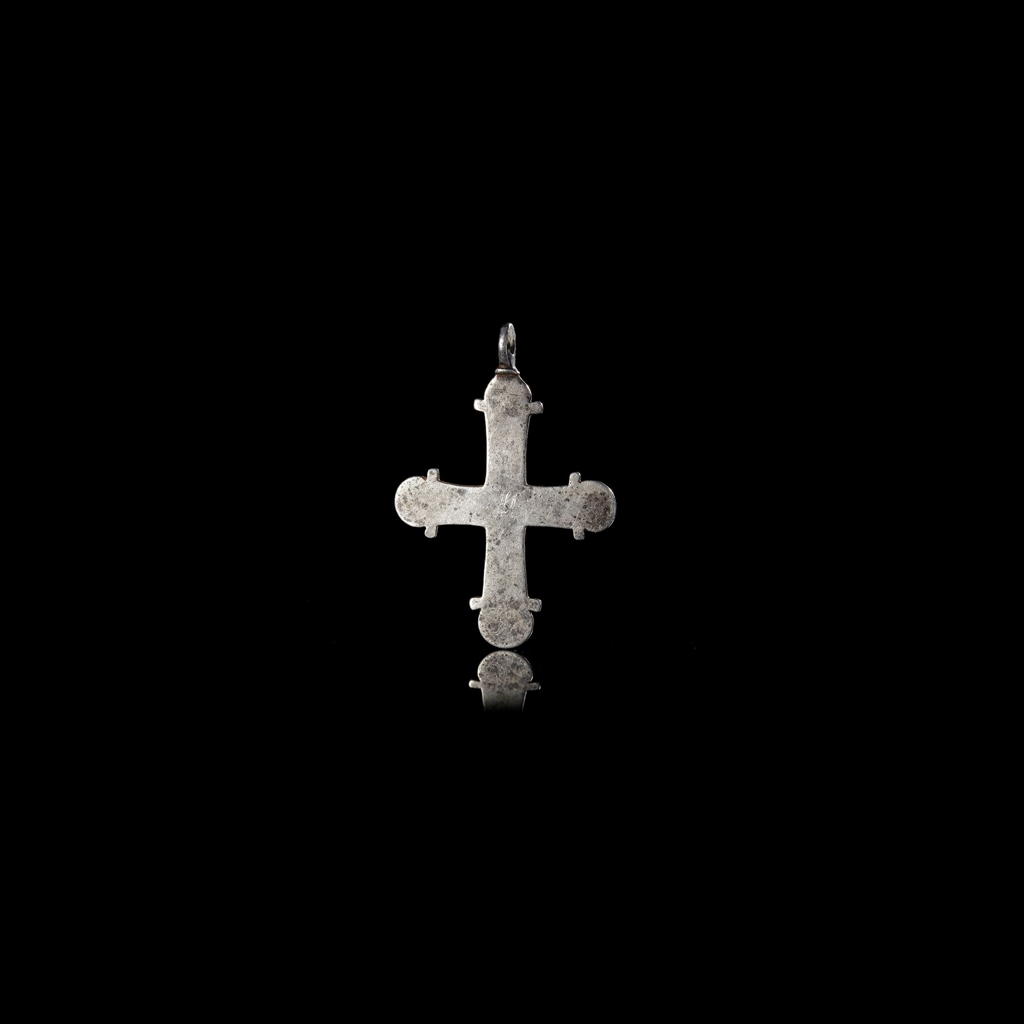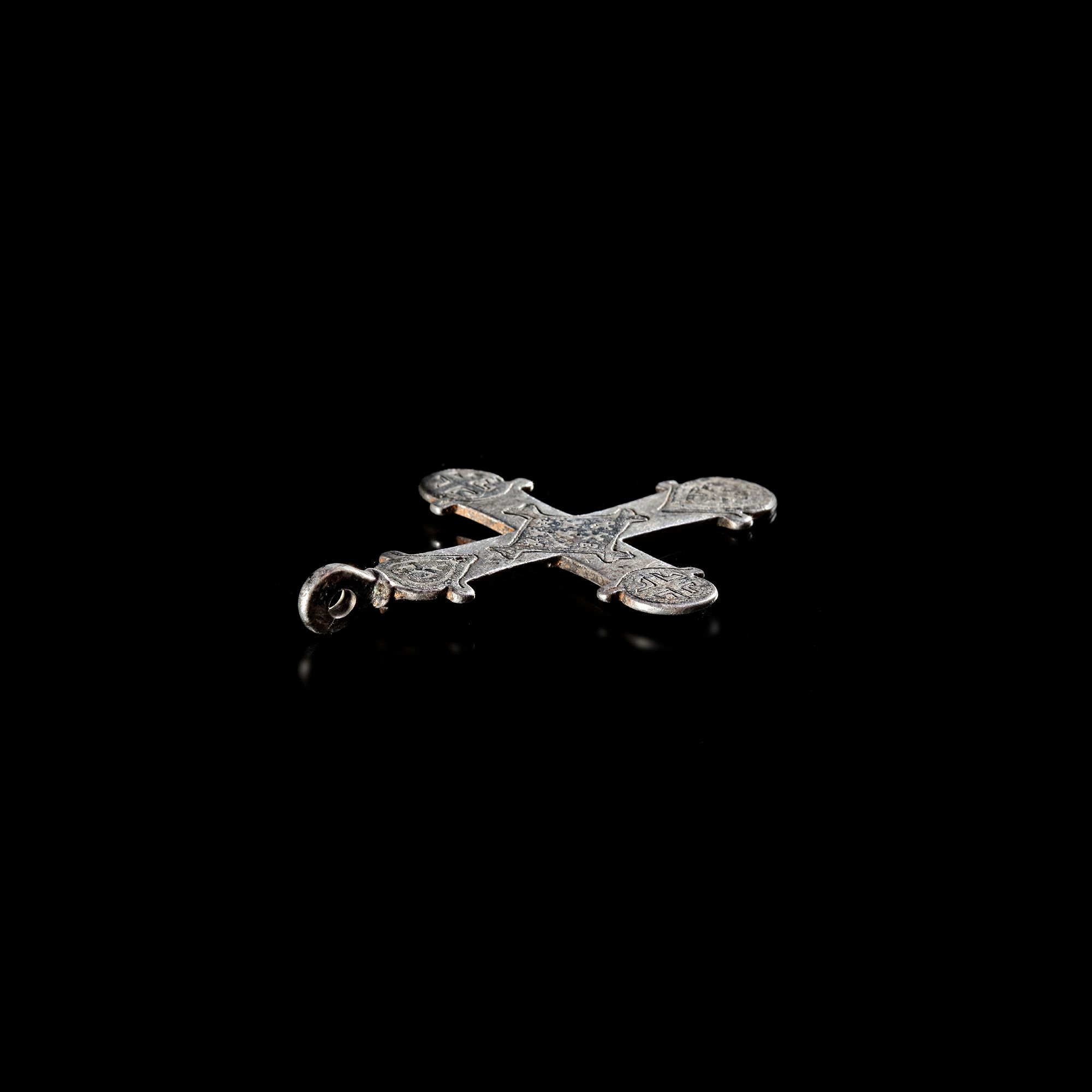 A Byzantine silver pectoral cross with nielloed inlays. At the centre is a lozenge shaped cross with niello inlay while the ends of the cross are likewise decorated in niello.