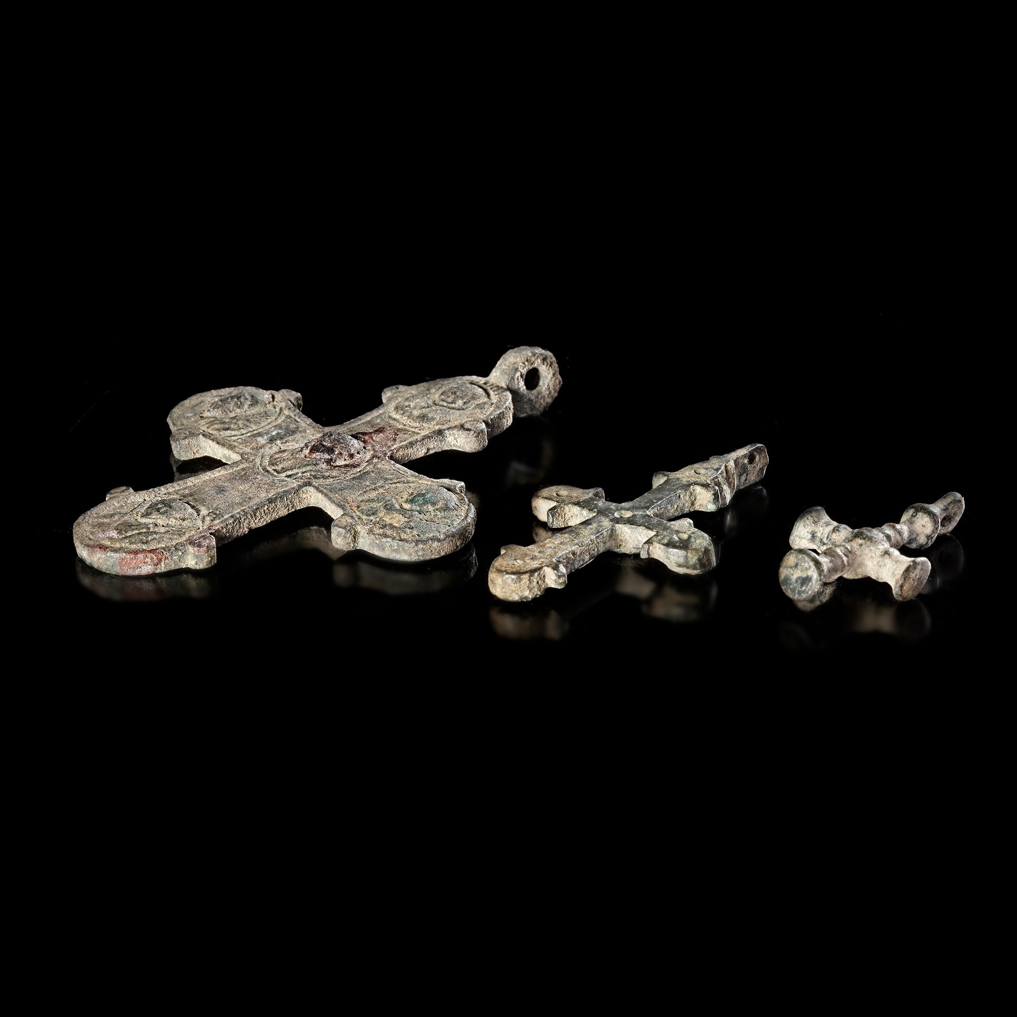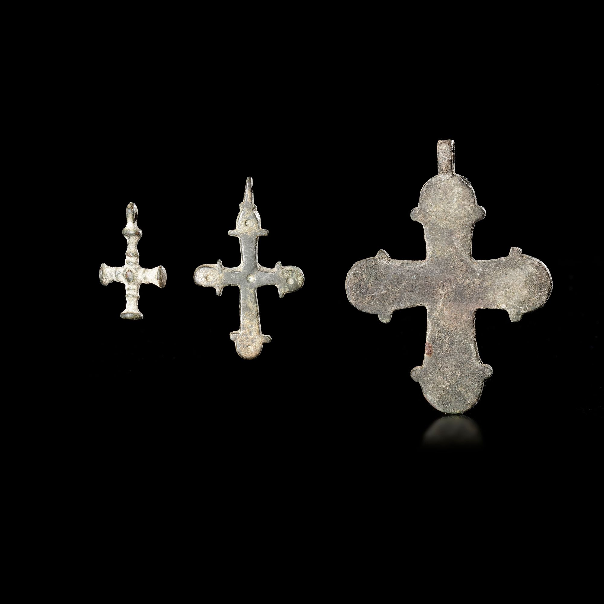 THREE BYZANTINE BRONZE PECTORAL CROSSES, 6TH-8TH CENTURY AD