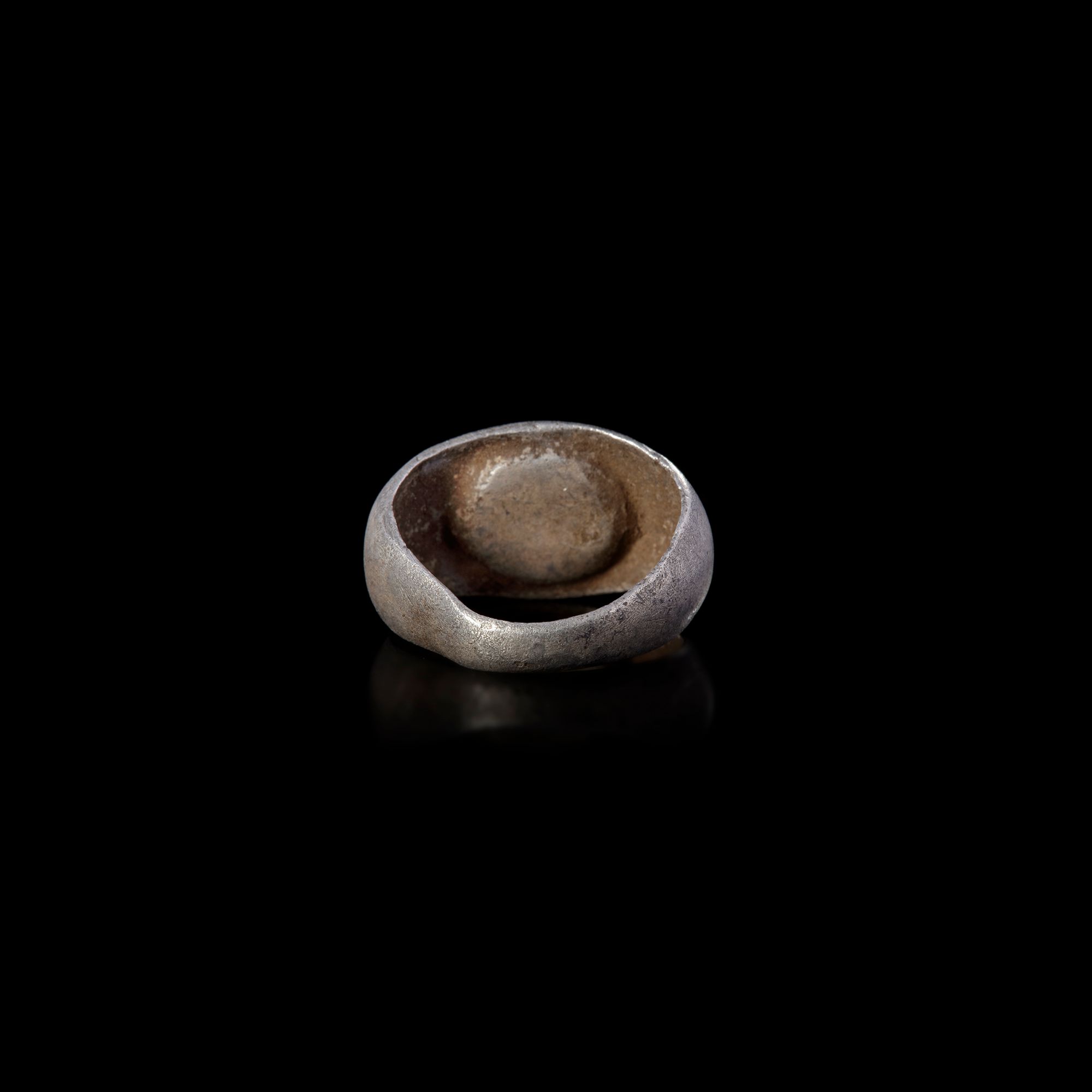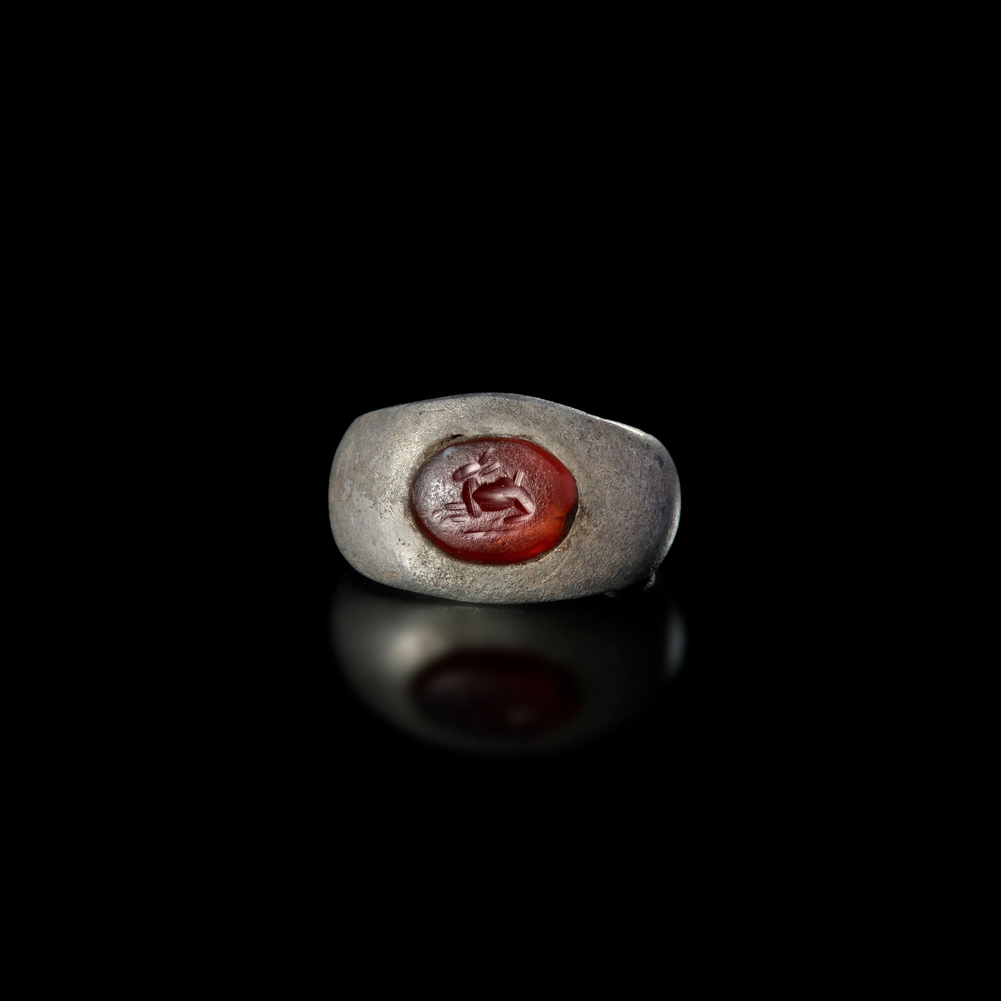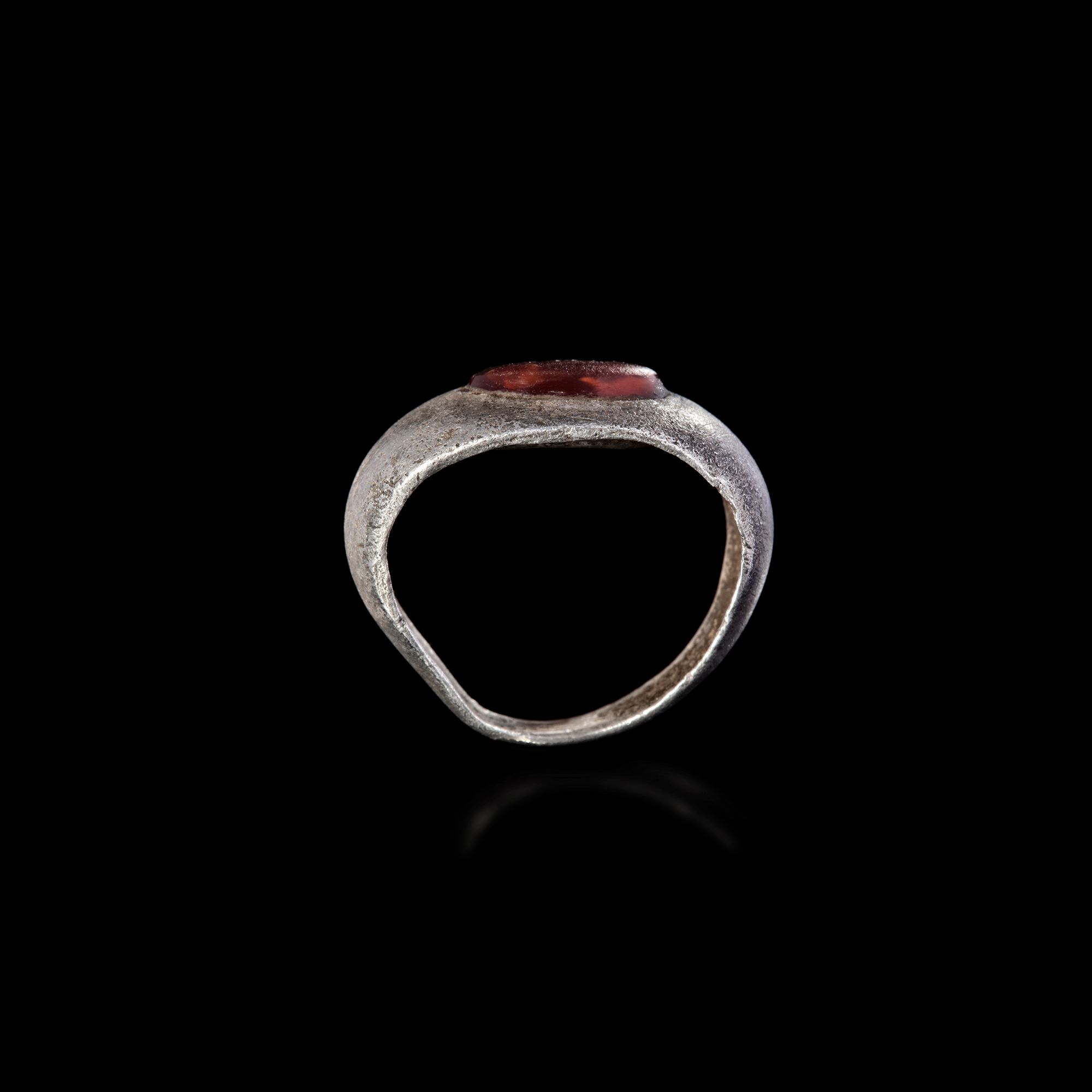 A Roman silver ring with a carnelian intaglio showing a rabbit to the left. Silver and carnelian. 20 by 18 mm.