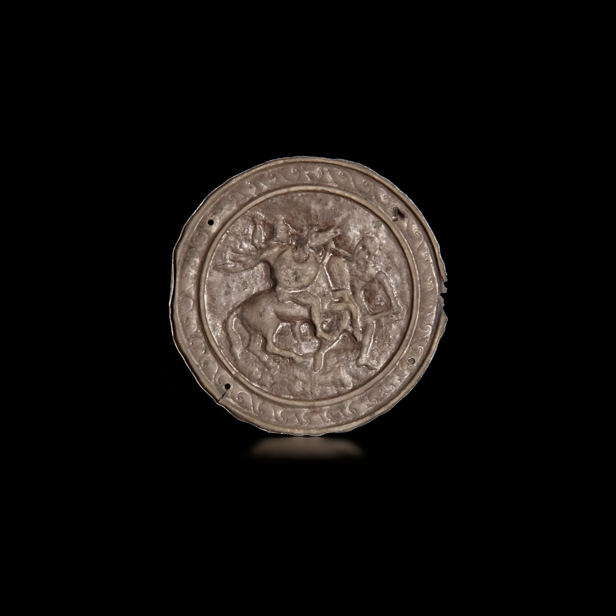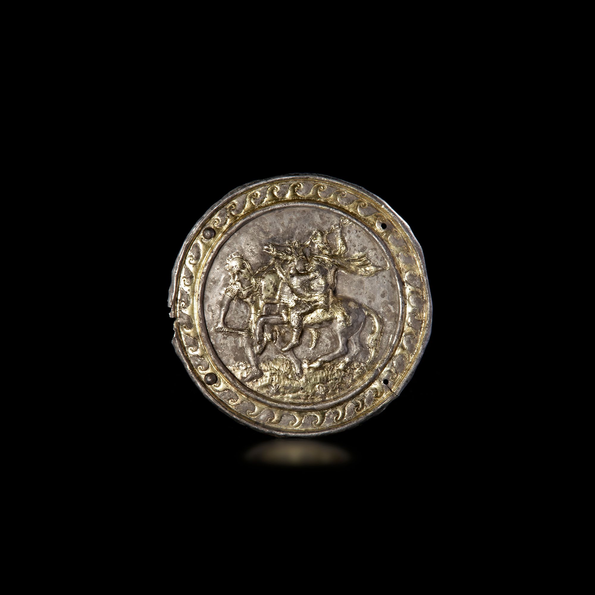 A round silver gilt phalera from the late classical period showing the combat of a cavalryman with a foot soldier. The horseman is attacking the soldier with a spear and holds a pelt, or cavalry shield in the other.The soldier is armored and is wearing a Corinthian helmet. The border is decorated with a wave pattern.