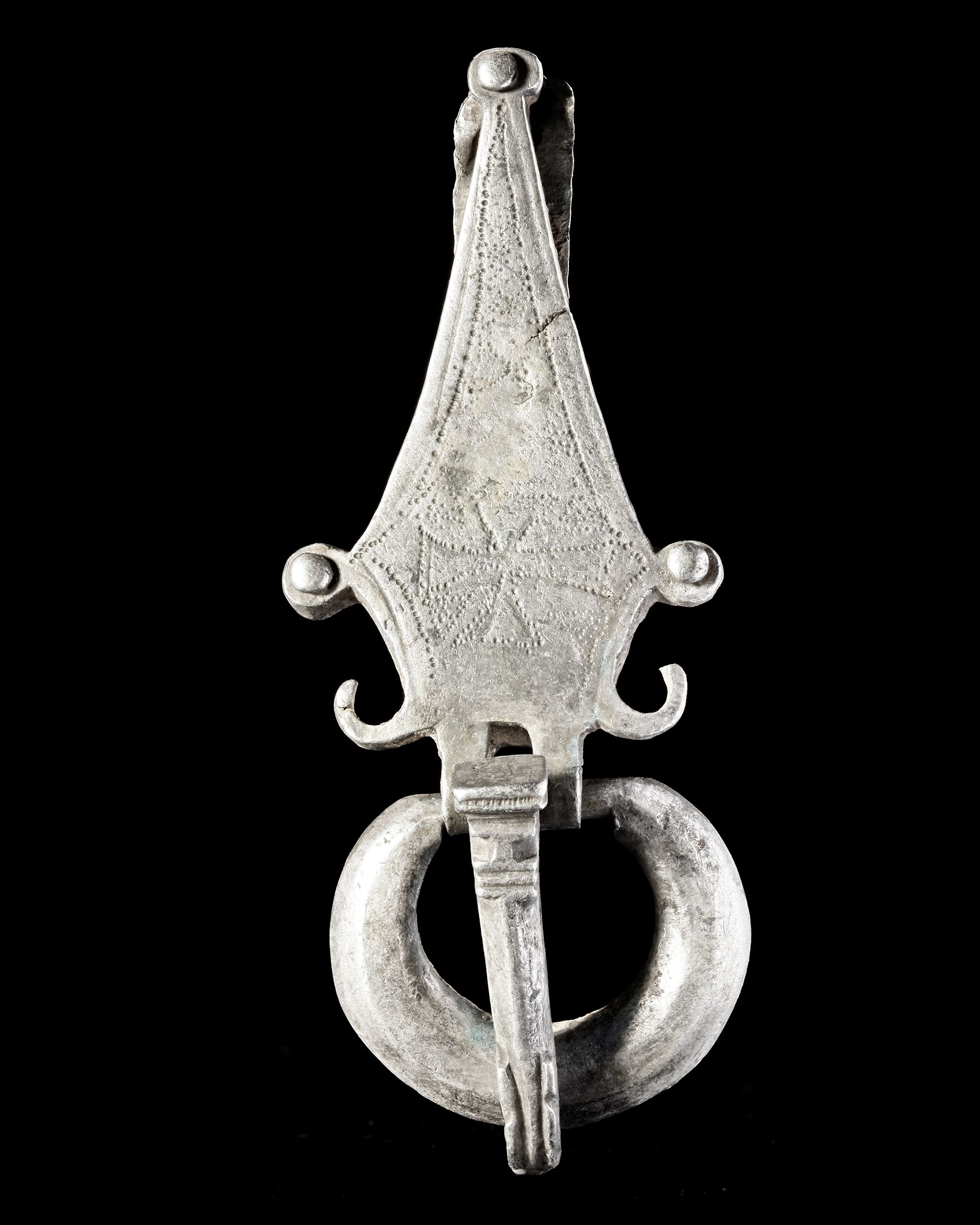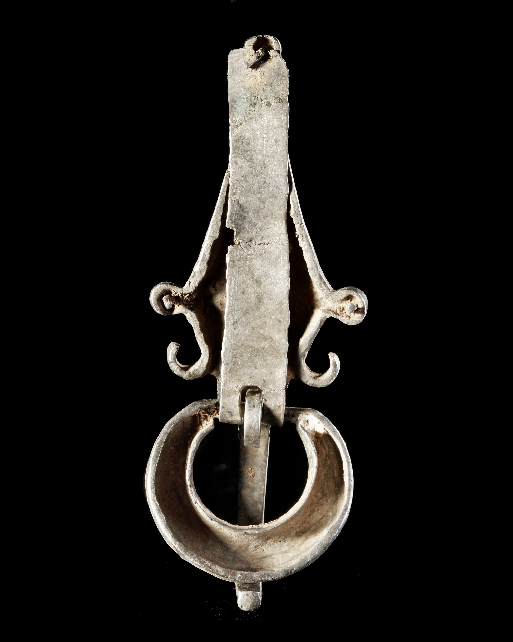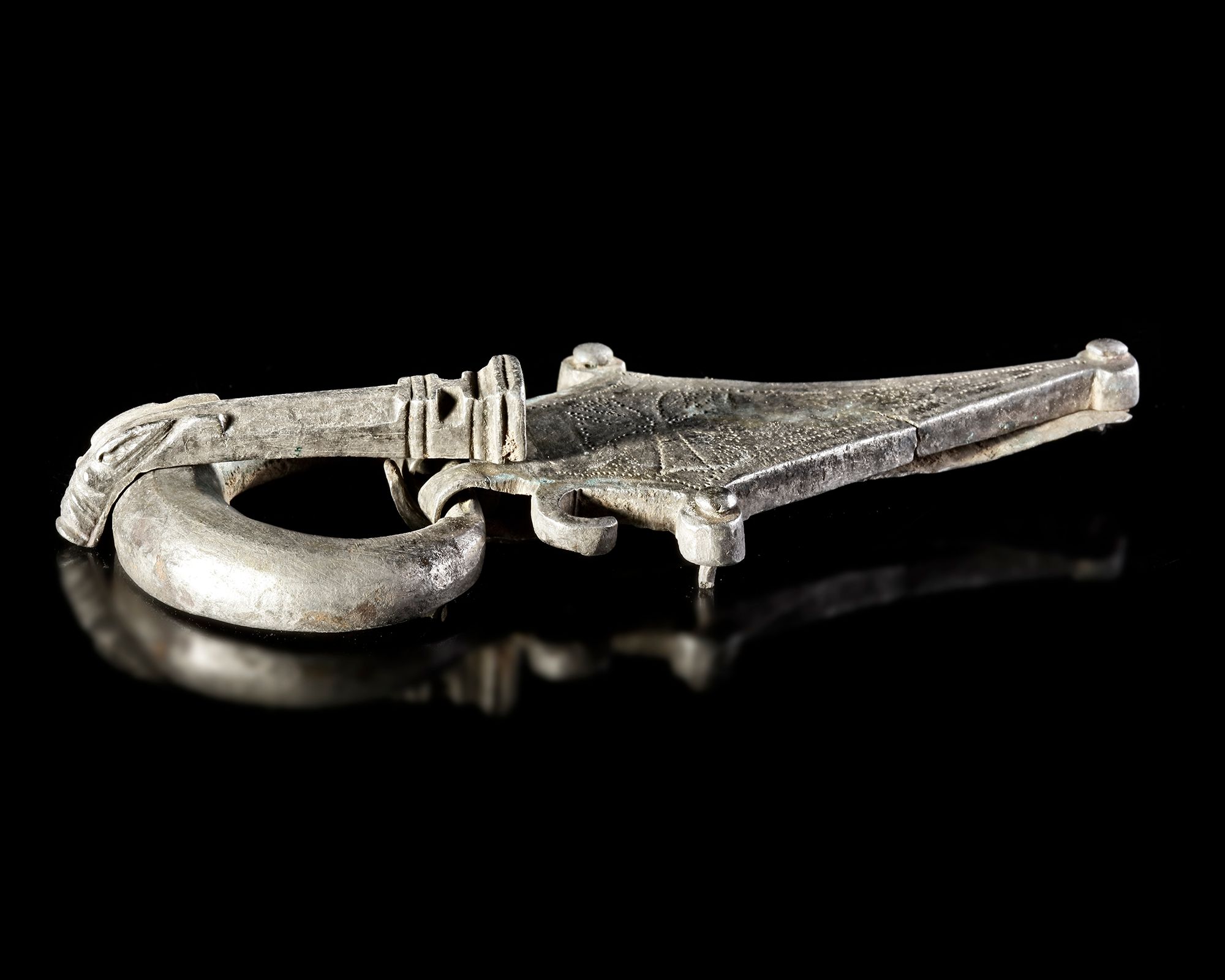 A Byzantine silver buckle with an elegant back plate engraved with a cross. Three rivets attached the back plate to the belt. The tongue of the buckle has an animal motif at its finial.