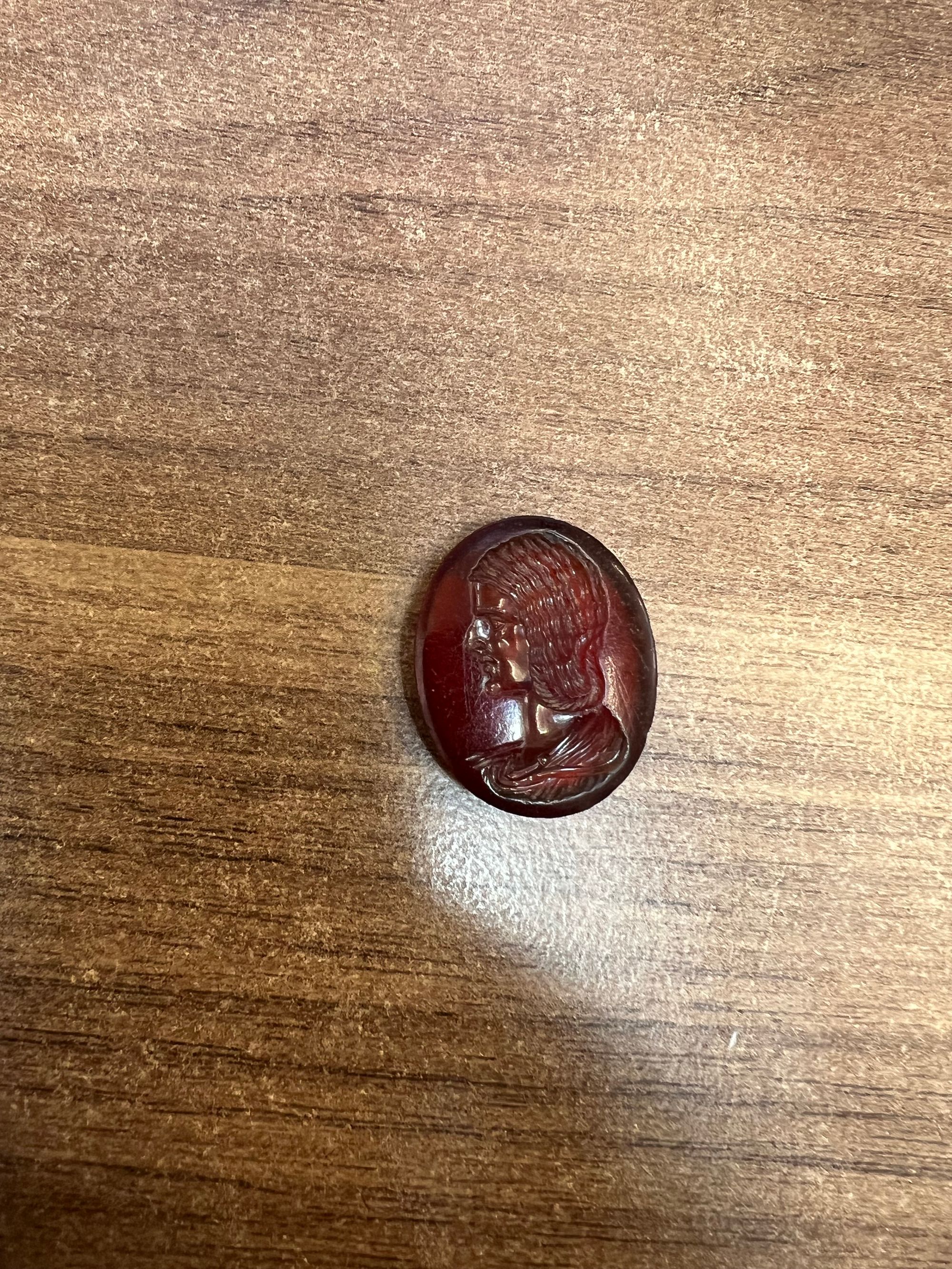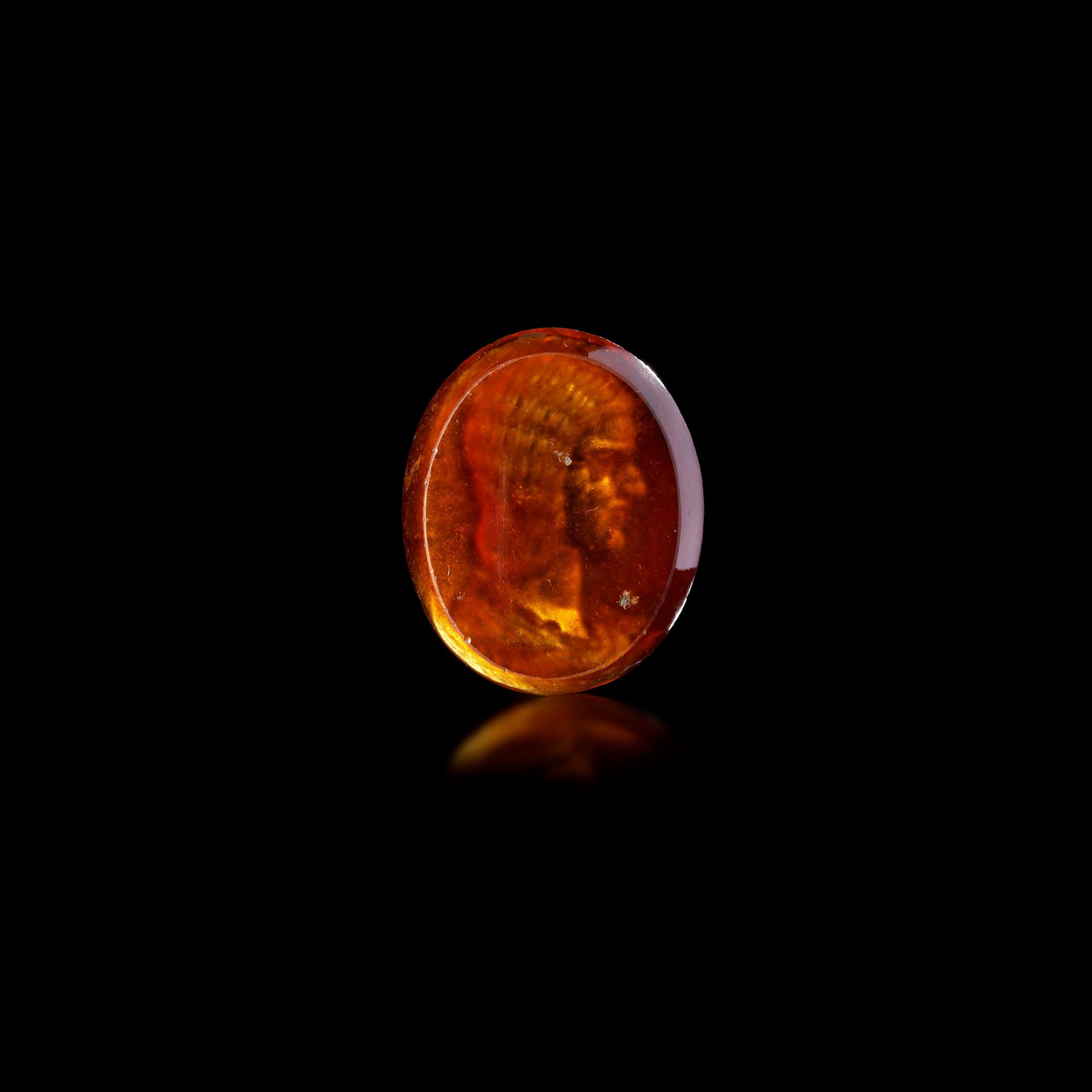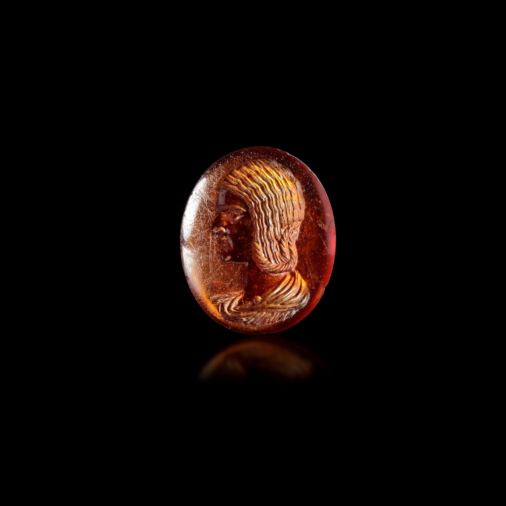 An exceptional intaglio in carnelian of Julia Domna, the wife of the Emperor Septimius Severus. She is shown facing left as the sealing would have faced right, as is the normal convention. The Several dynasty were keen on establishing their family as permanent rulers of the empire and therefore their portraits have survived in relatively large numbers although this intaglio is exceptional.
