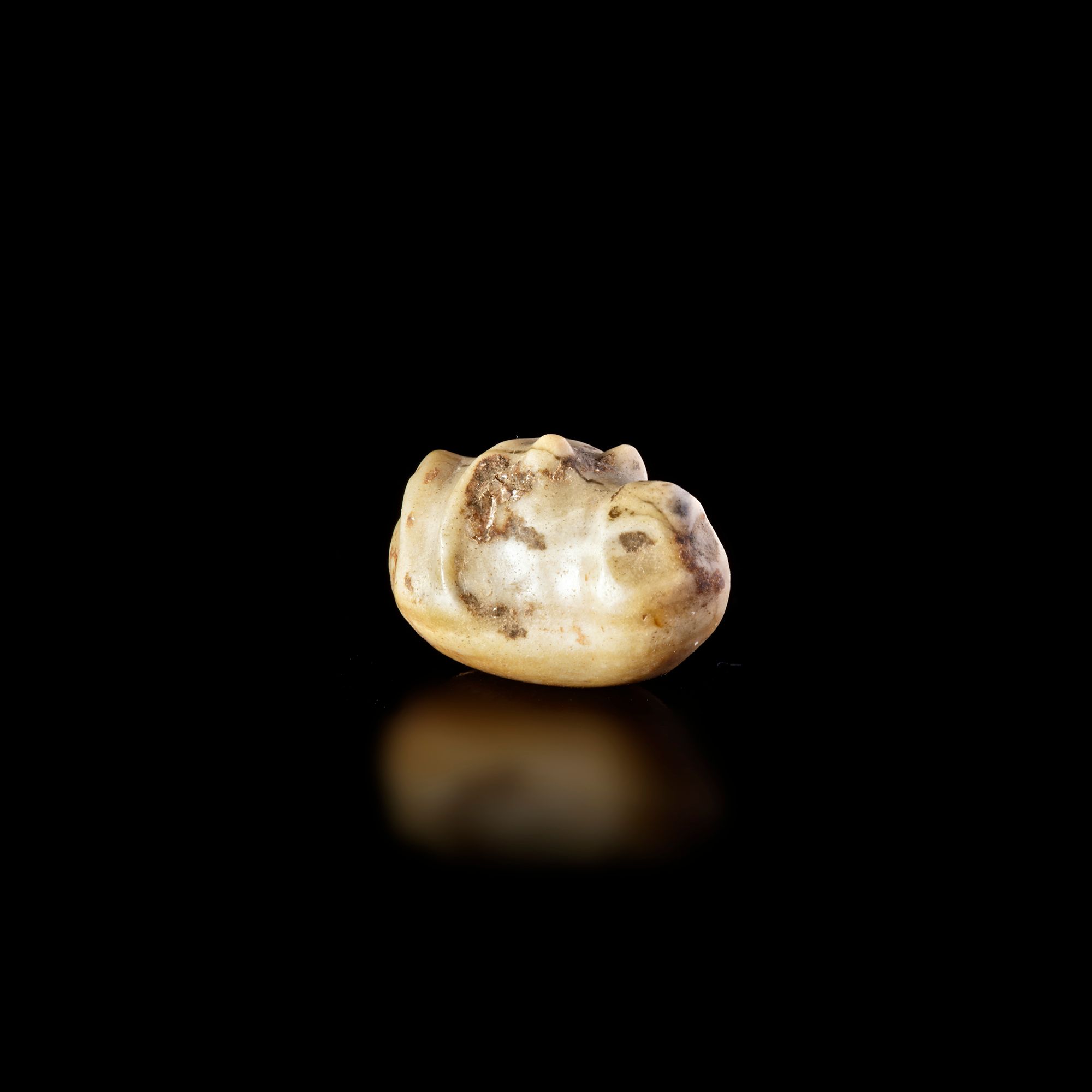 A small hard stone idol, possibly a banded agate. the figure represents a seated woman, probably a mother goddess.