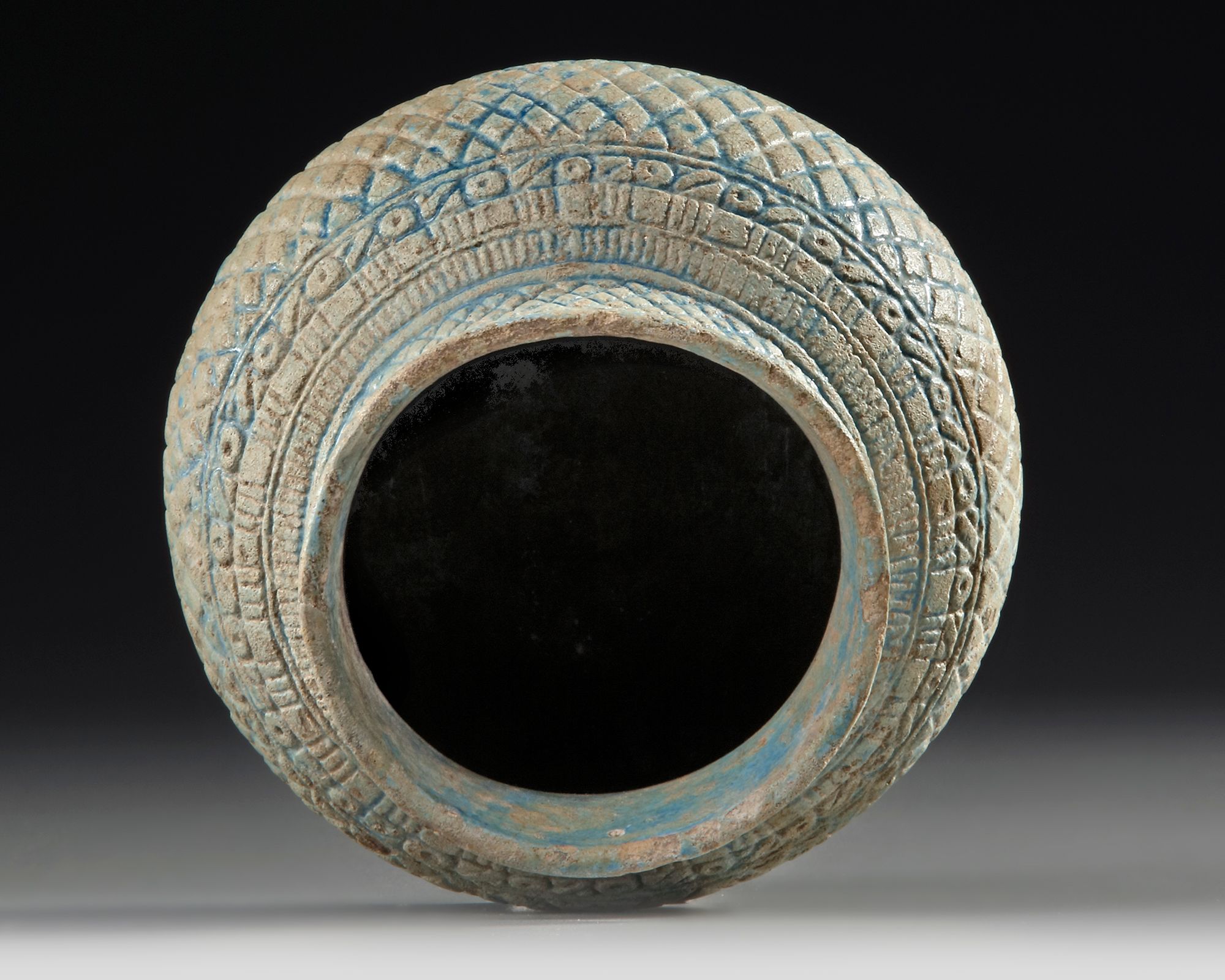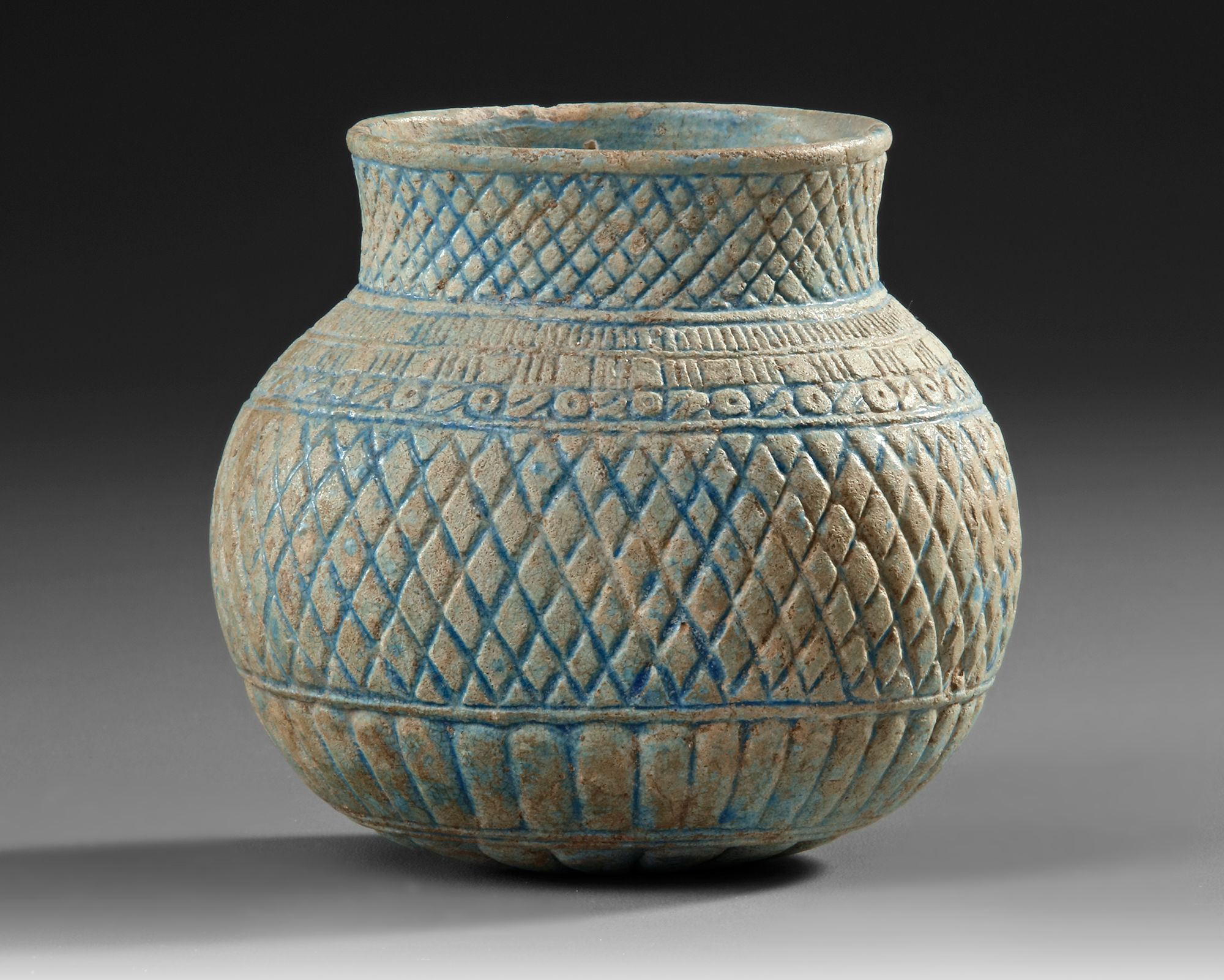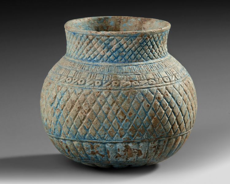 This is a squat ceramic vessel featuring a bulbous body and a short, flared neck. The surface is intricately decorated with a geometric lattice pattern, interspersed with floral or circular motifs near the upper body.