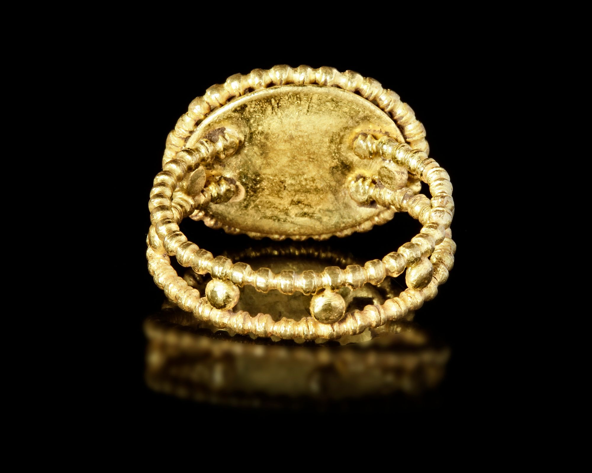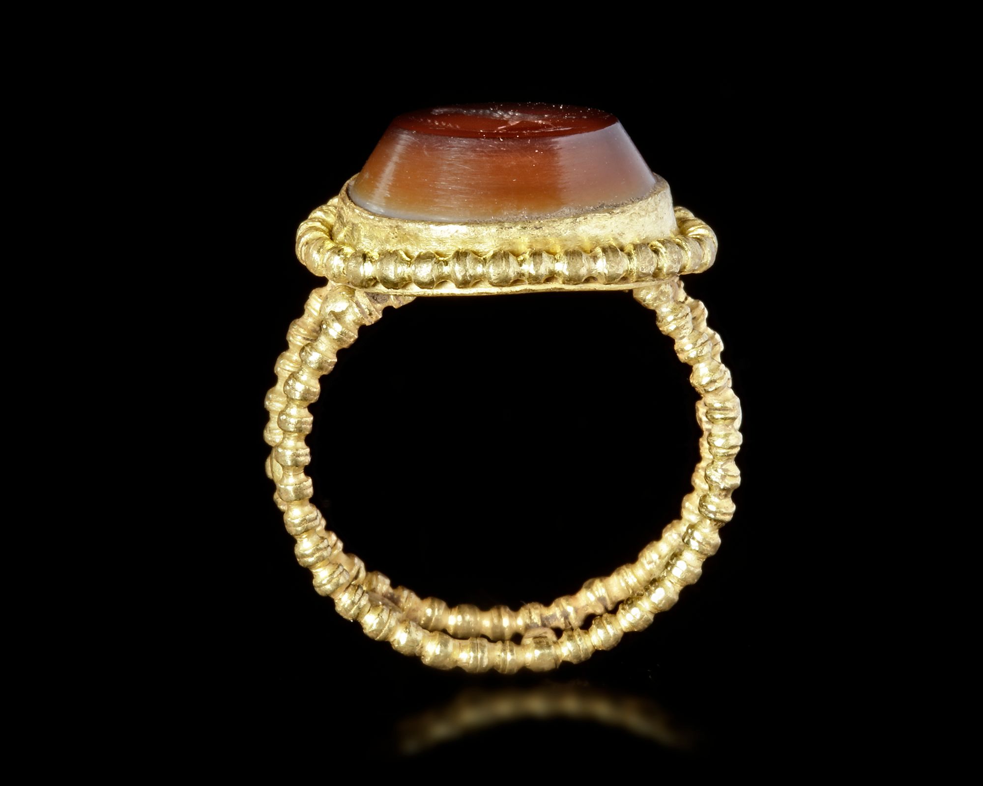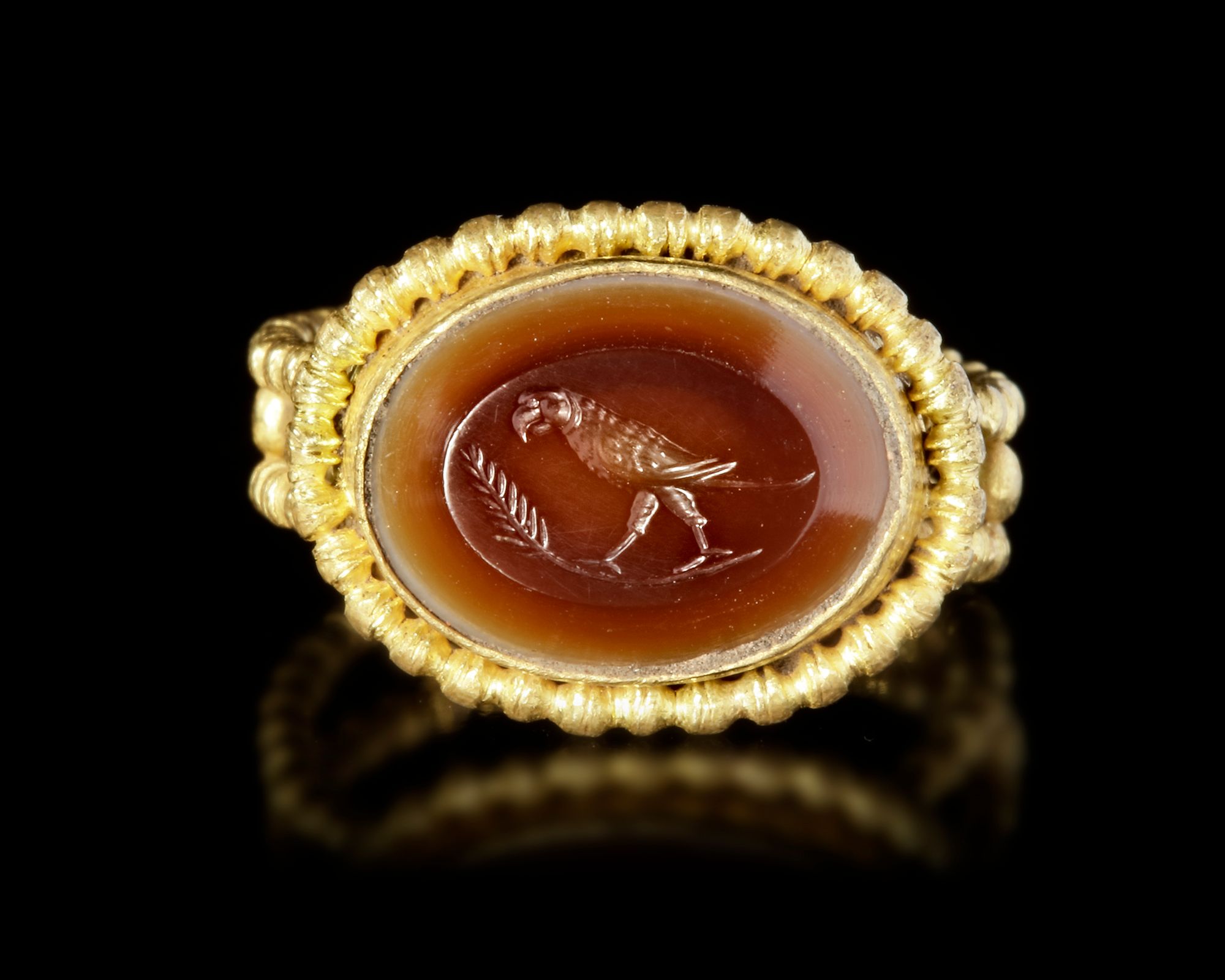 The gold ring formed of two filigree wire with oval filigree wire over the oval frame which containing a banded agate stone of a parrot and an ear of wheat.