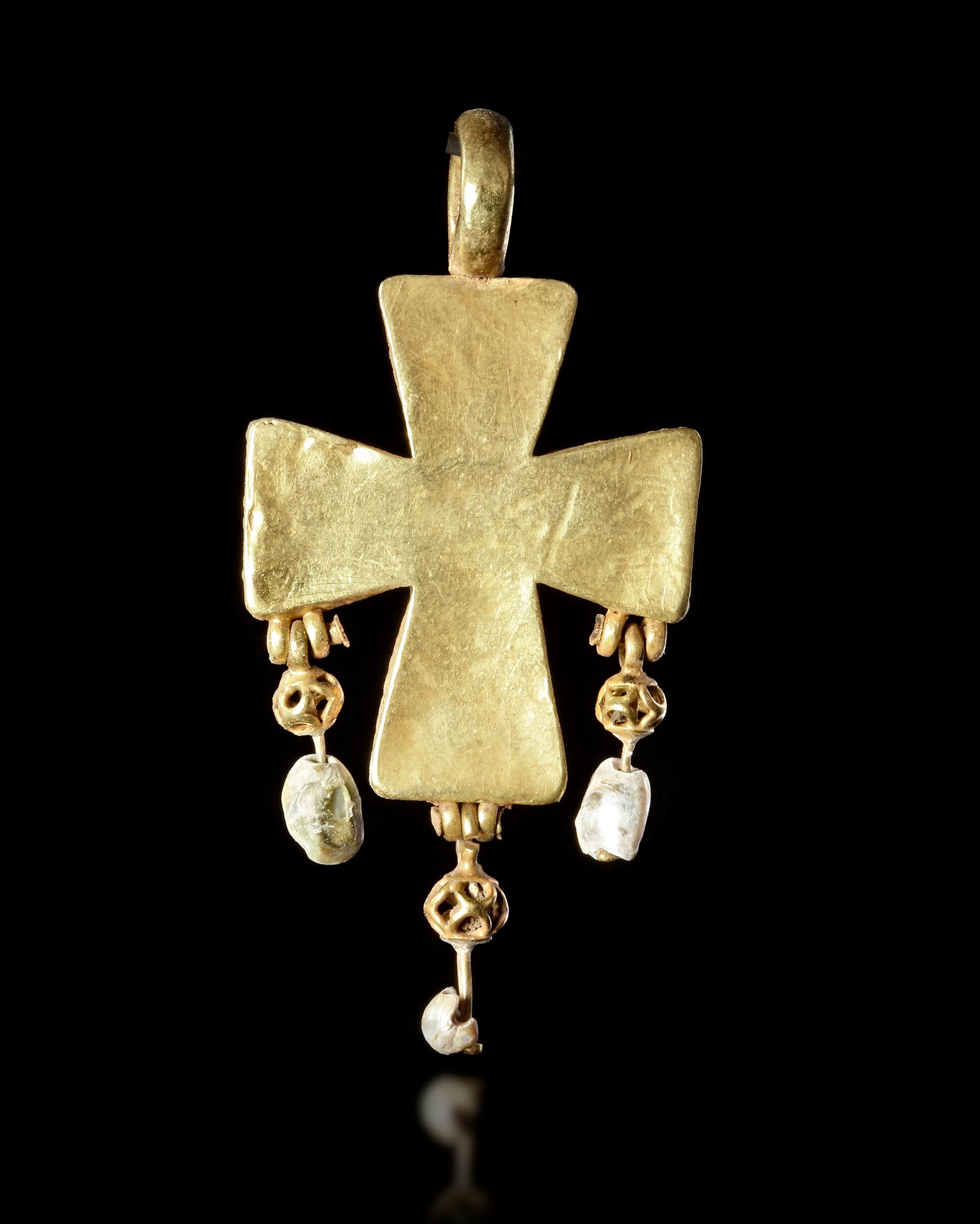 An elegant thick gold hollow cross with green glass enlayes a garnet cabochon stone in the middle and two pearls pendant 6 by 2.6 cm. Weight: 12,0 gr.