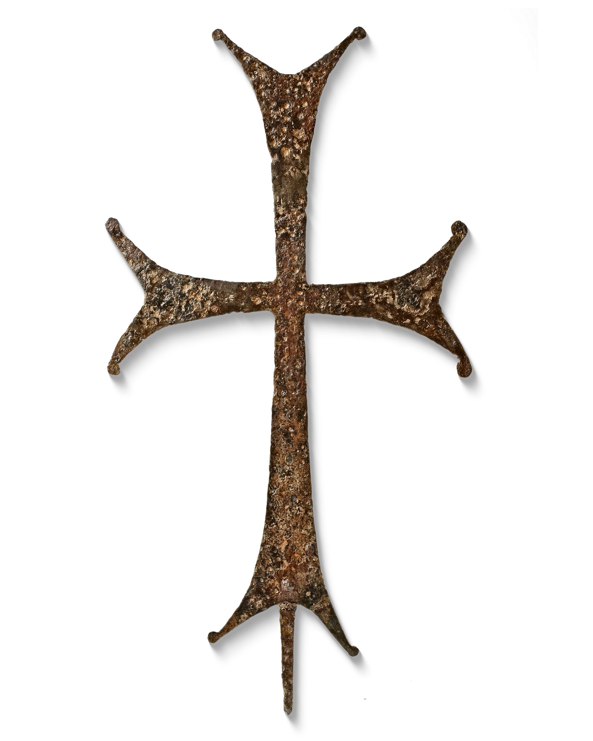 An ornate bronze processional cross from the Byzantine era, richly decorated with raised geometric and floral designs.