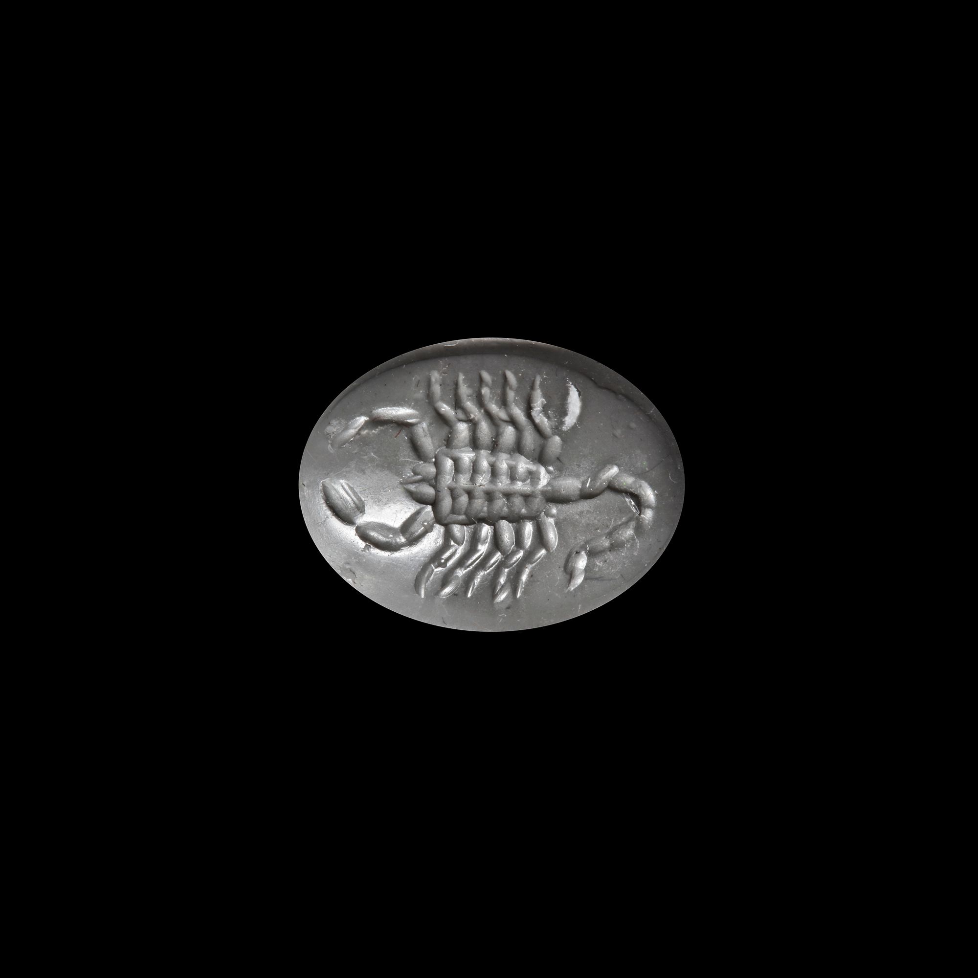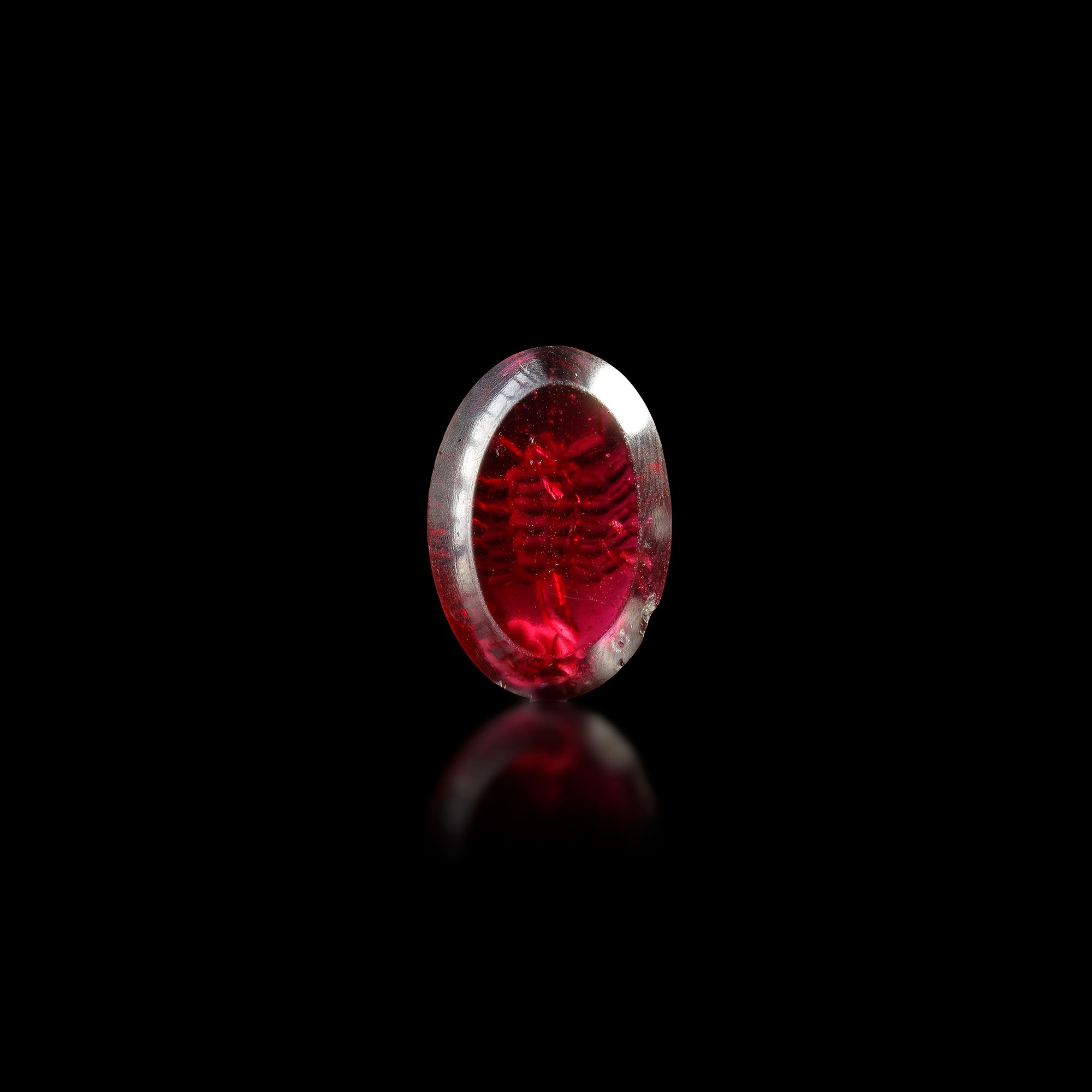 This finely carved Roman intaglio, cut from deep red garnet, features a detailed and vivid depiction of a scorpion—a potent symbol of protection, danger, and astrological power. Every segment of the creature’s exoskeleton, pincers, and curling stinger is intricately rendered, showcasing the engraver’s mastery of miniature detail and gemstone hardness. Scorpions held mystical and symbolic significance in Roman culture, often associated with warding off evil or invoking divine protection. Likely used as a personal seal or amulet, 1.8 cm. Weight: 2.63 gr.