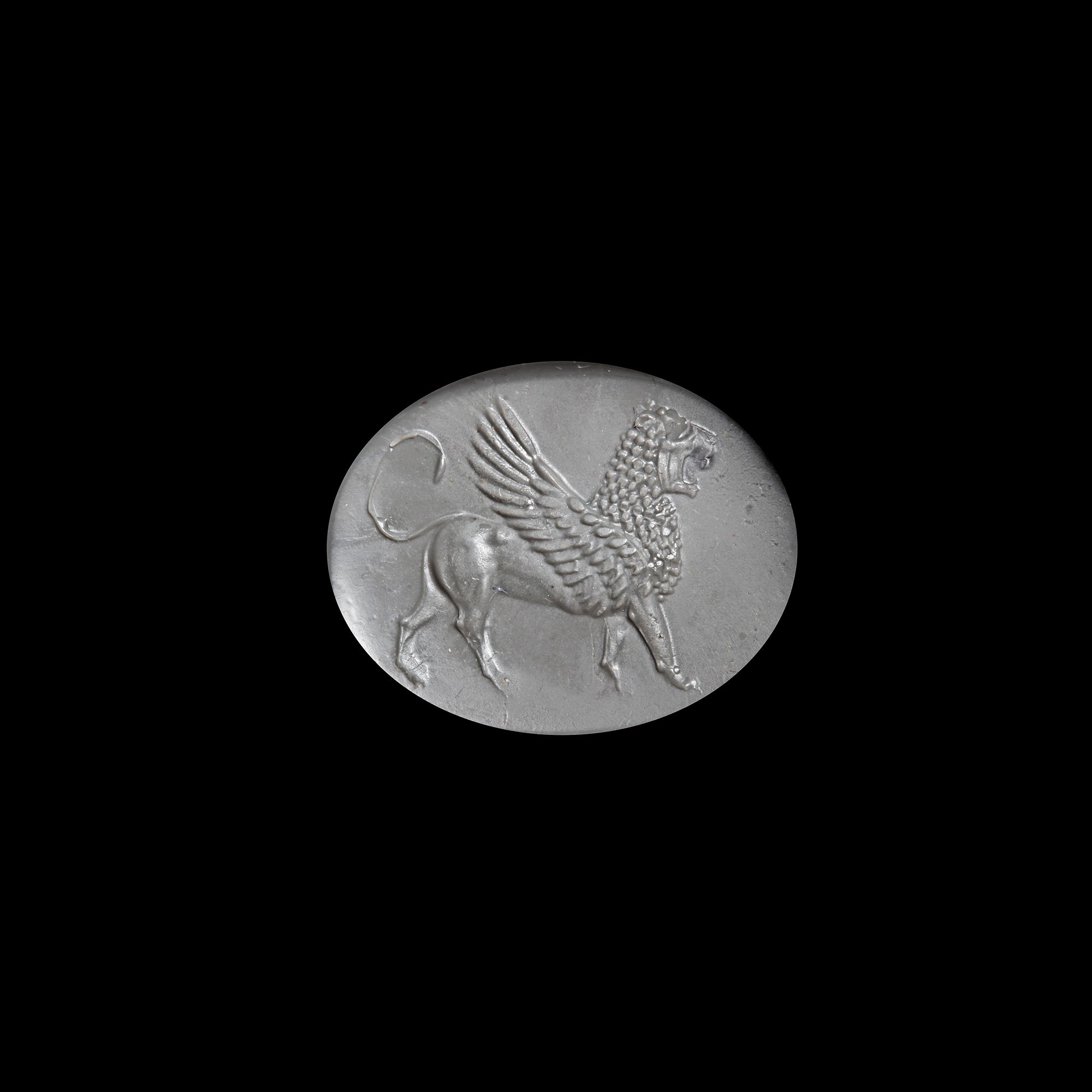 This extraordinary Greco-Persian scaraboid, carved from luminous chalcedony, showcases a majestic winged lion captured in poised motion, it exemplifies masterful craftsmanship with intricate detailing on the creature’s feathered wings, curling mane, and roaring expression. A powerful symbol of protection and guardianship, the winged lion stands as a mythical sentinel against chaos and malevolent forces. 2.5 by 1.8 cm. Weight: 8.99 gr.