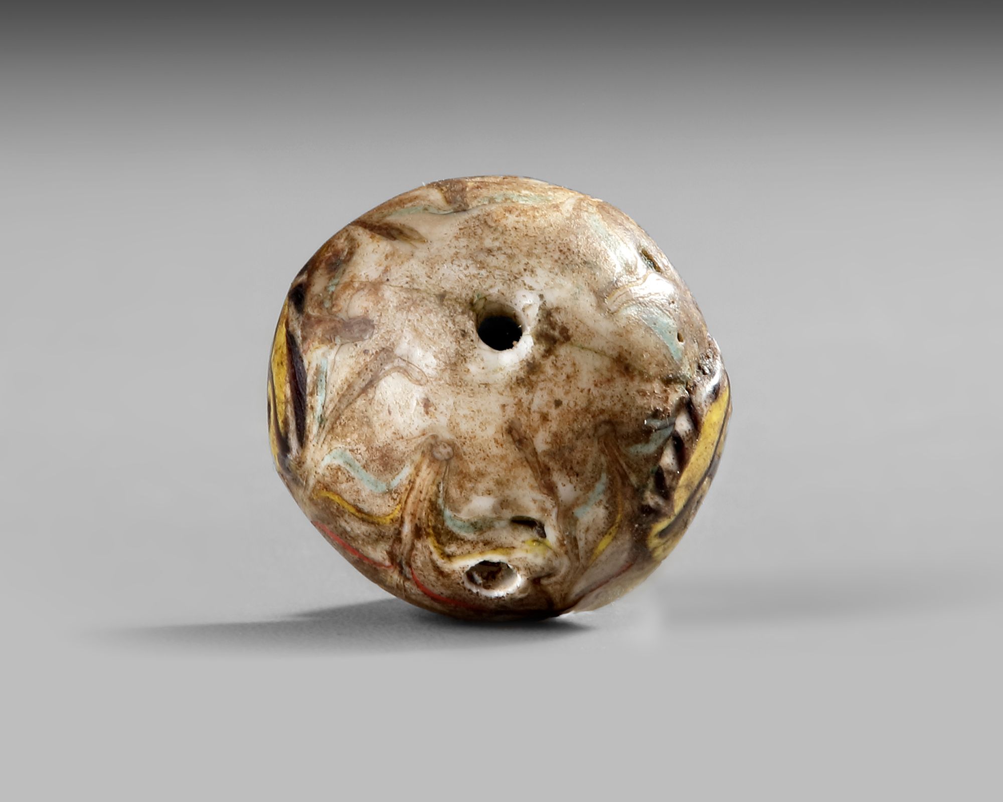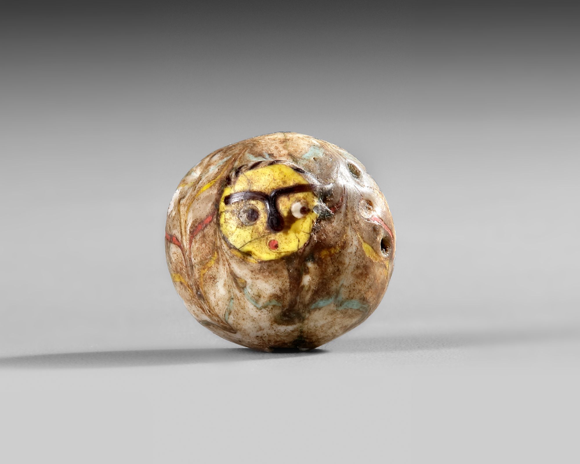 This exquisite ancient Roman mosaic glass bead features intricate patterns of marbled brown, yellow, and white glass. The bead is adorned with detailed face motifs, possibly representing deities or mythological figures. The swirling patterns and vibrant colors highlight the advanced glassmaking techniques of the Roman era.